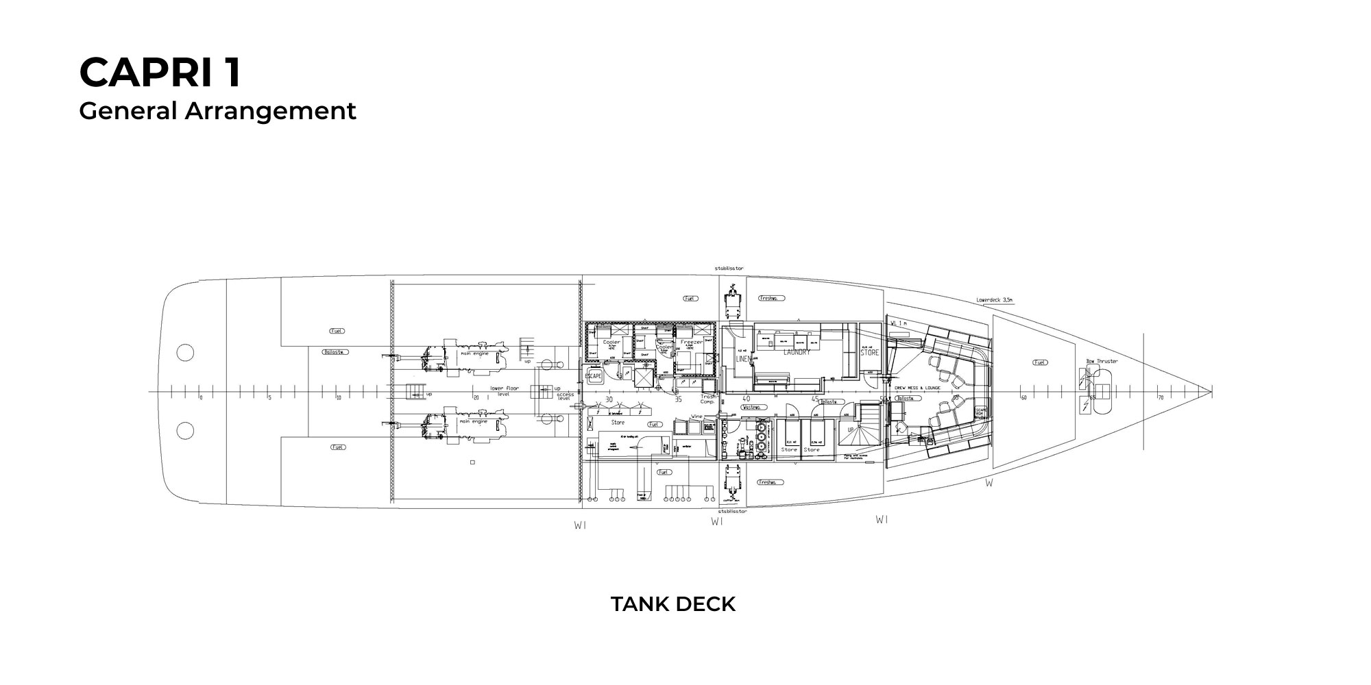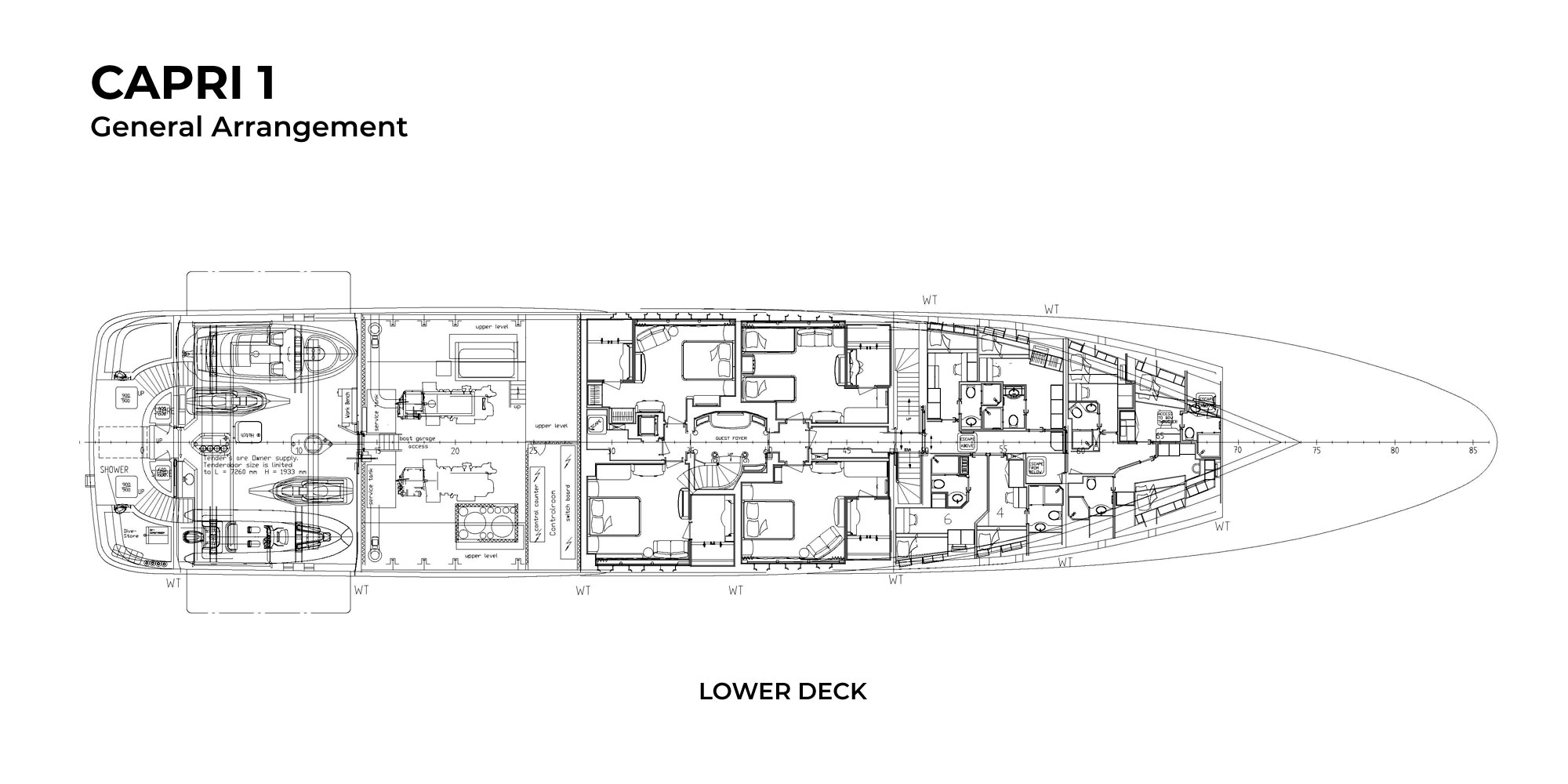 She is a combination of classic style & modern comfort, designed by Glade Johnson. CAPRI I can accommodate 12 guests in six luxurious cabins including a full beam master with king size bed, vanity, and sitting room. The expansive onyx bathroom features his and hers facilities, 4 closets including a large walk in closet, jacuzzi bathtub and spacious shower. One Twin Guest cabin on the main deck , a further three double and one twin cabin can be found on the lower deck. All guest cabins offer spacious marble bathrooms with tubs.