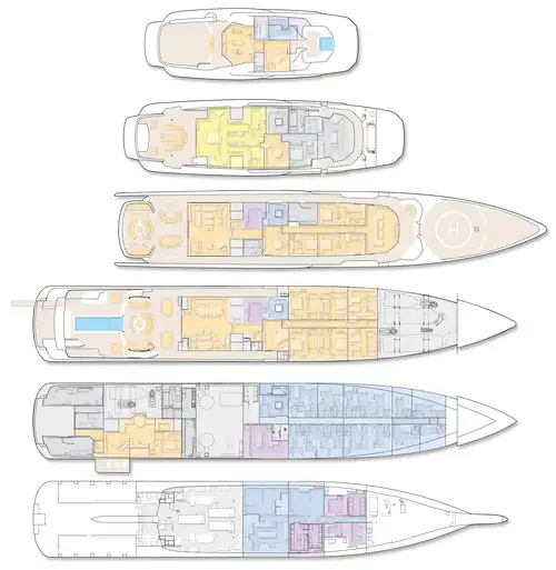 A large sun deck, accessible by an elevator serving all deck from the main deck. has a jacuzzi, sunpads and lounge area forward, a dayhead off the lobby and a climate controlled gym overlooks an enormous aft terrace with bar. The owner's suite looks aft over a terrace with lounge seating and has large his and hers bathrooms and dressing rooms.
