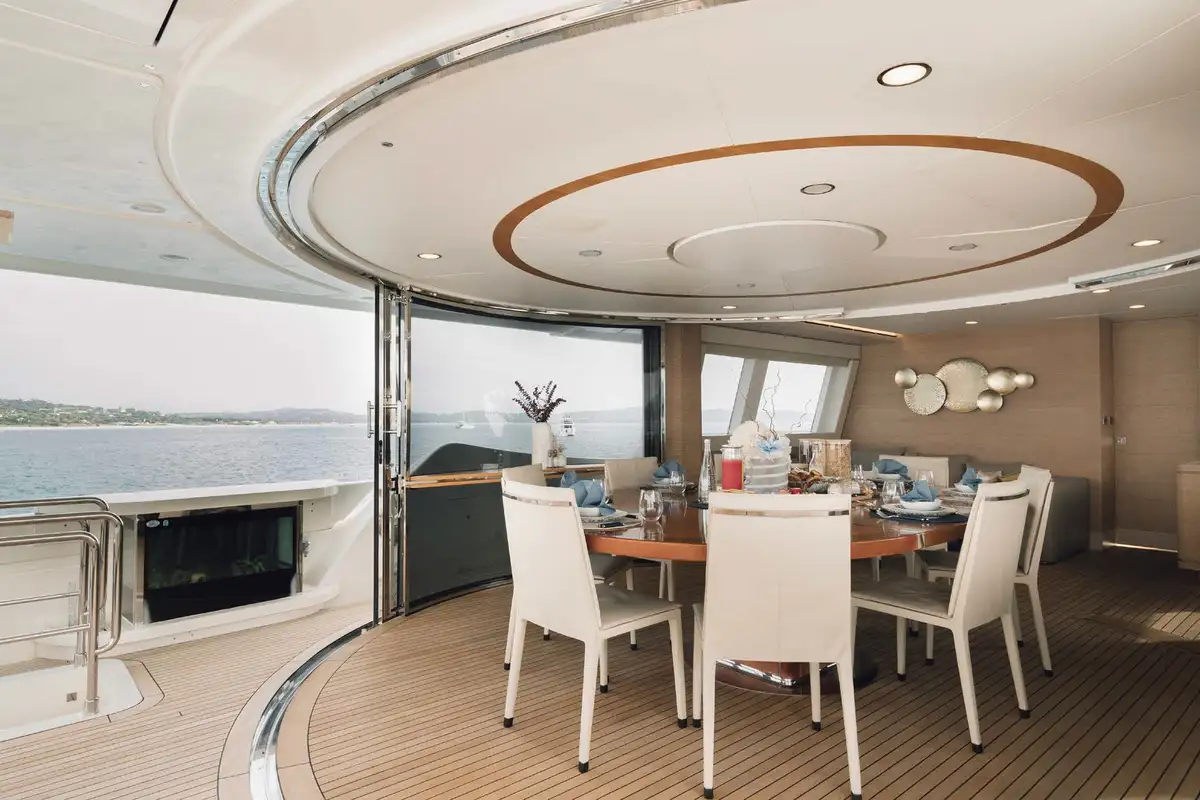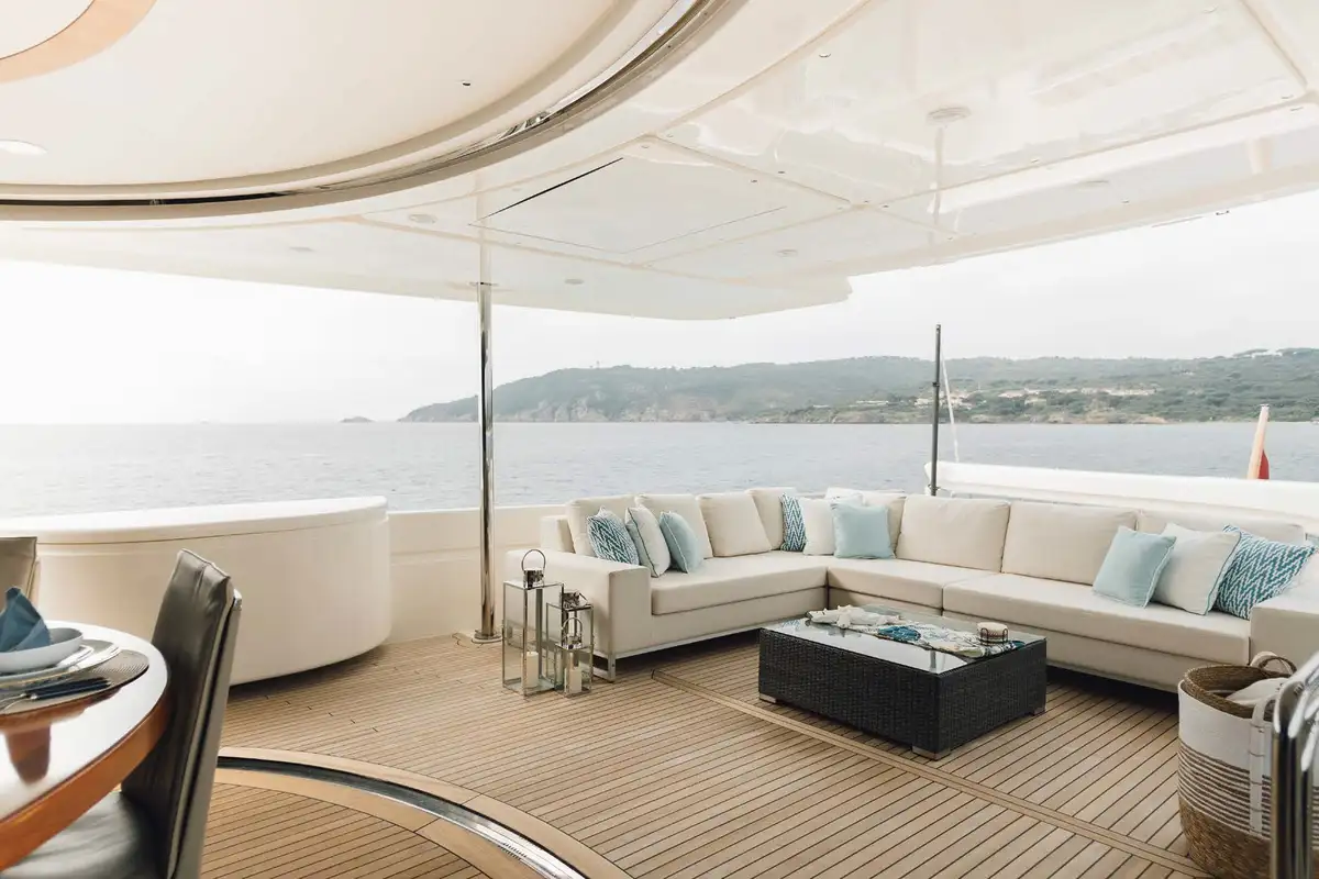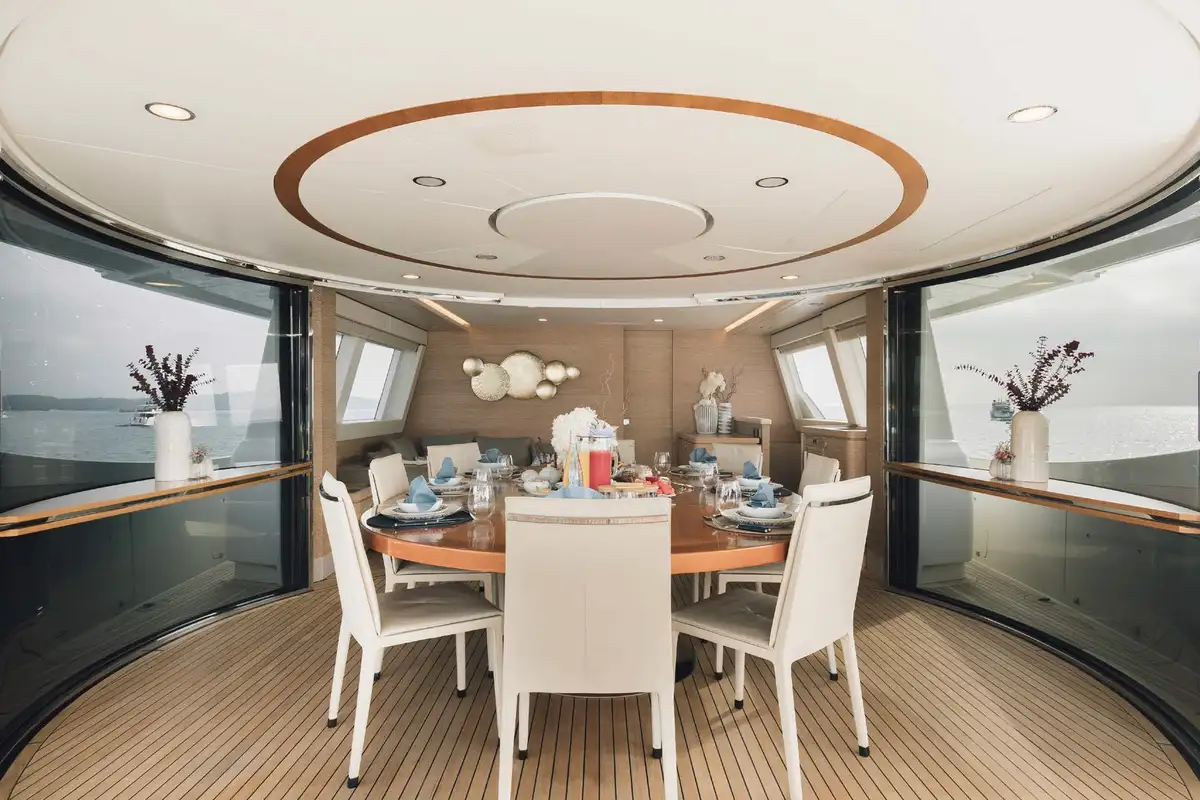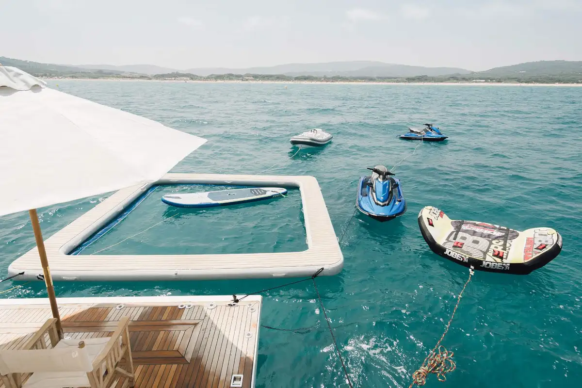 Her sun deck is a true sanctuary, a sweeping space of calm and clarity. With a jacuzzi, bar, relaxed dining and generous sun pads, it’s the perfect setting for sun-drenched afternoons and sociable evenings under the stars. On the main deck aft, elegant alfresco dining flows naturally down to the expansive swim platform, where days begin with a refreshing dive or the launch of SeaBobs, jet skis and paddleboards.