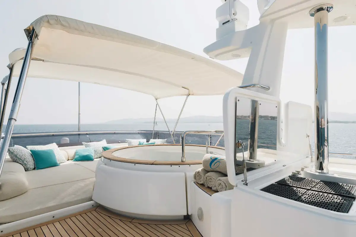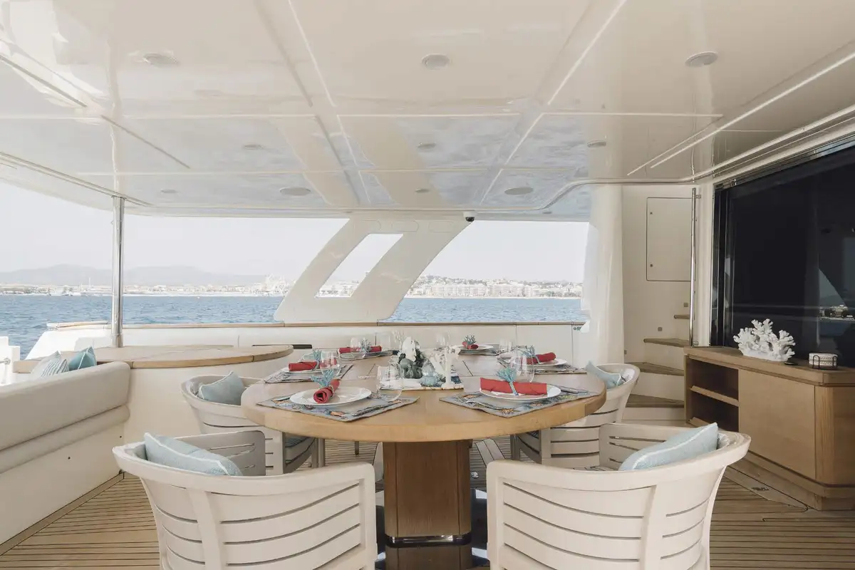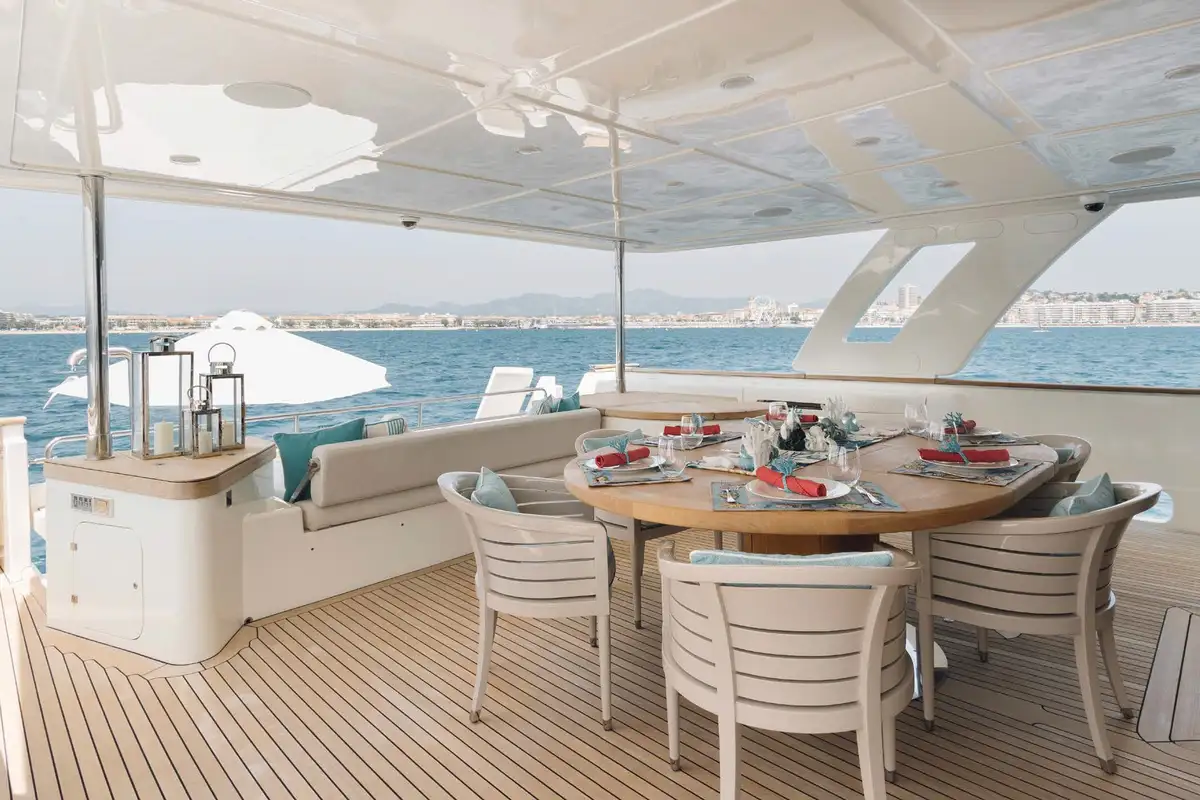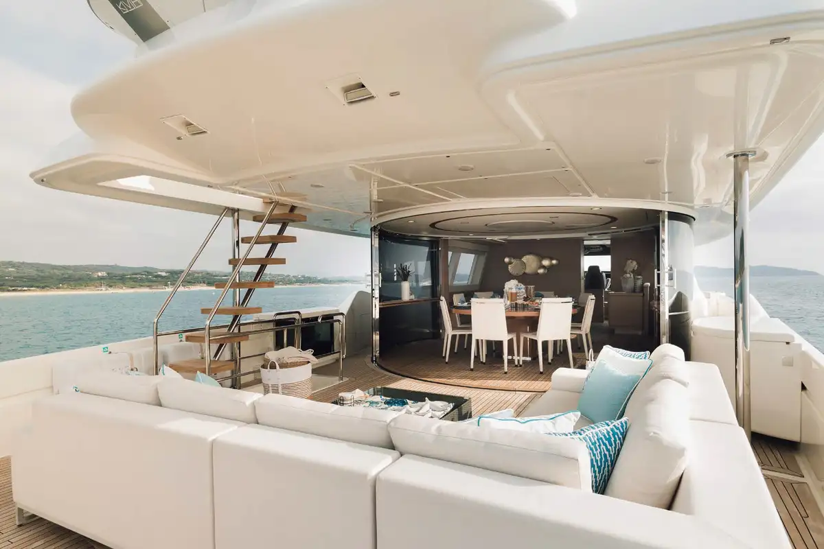 Her sun deck is a true sanctuary, a sweeping space of calm and clarity. With a jacuzzi, bar, relaxed dining and generous sun pads, it’s the perfect setting for sun-drenched afternoons and sociable evenings under the stars. On the main deck aft, elegant alfresco dining flows naturally down to the expansive swim platform, where days begin with a refreshing dive or the launch of SeaBobs, jet skis and paddleboards.