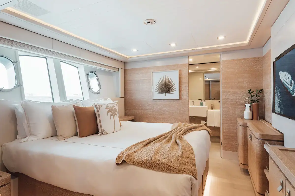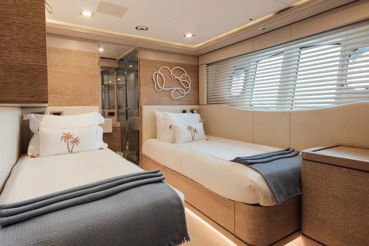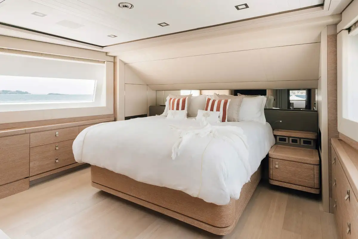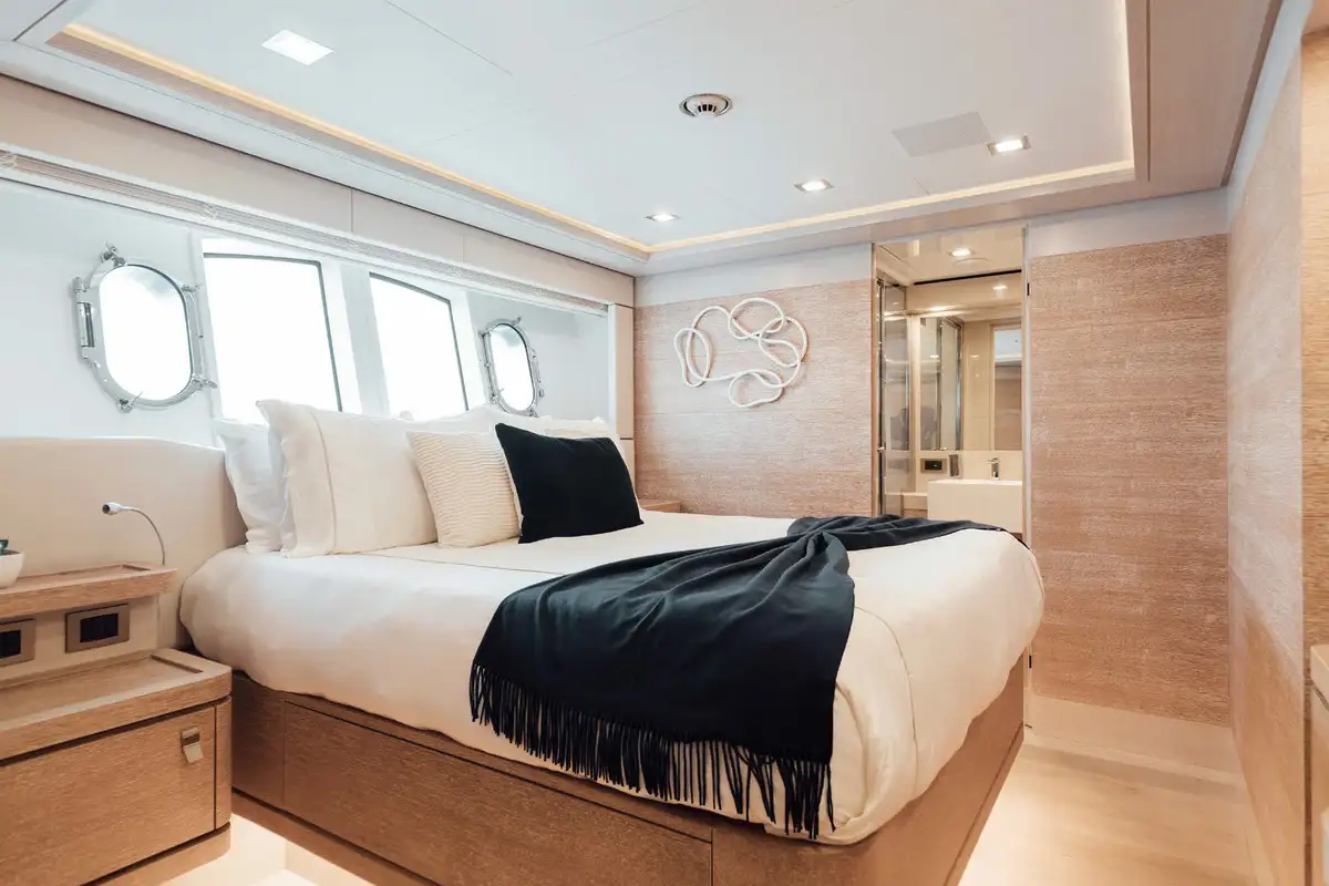 She welcomes up to eleven guests across five beautifully appointed suites. The full-beam master cabin sits forward on the main deck, offering supreme privacy and views, while two double and two twin cabins, one with an additional berth, ensure comfort for families or groups.