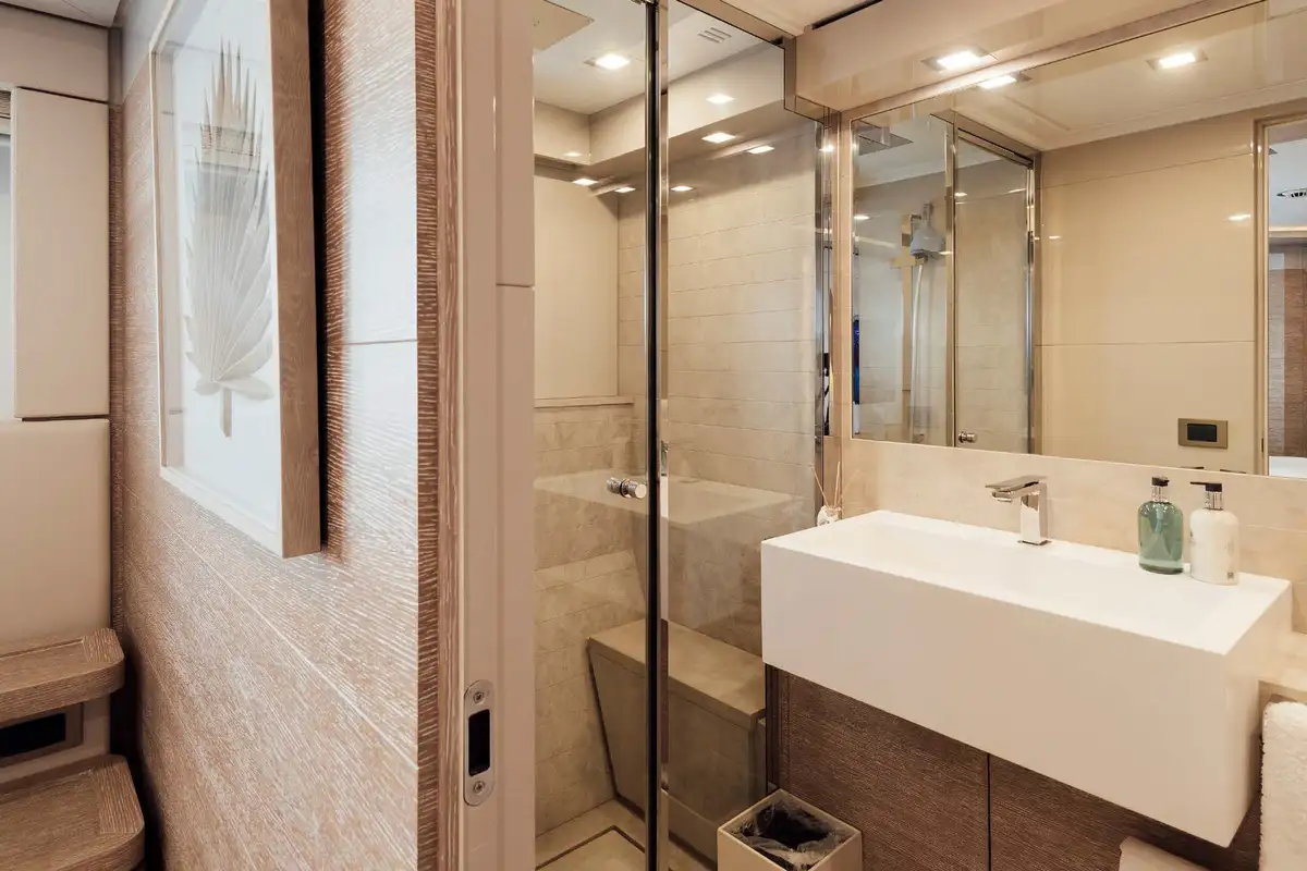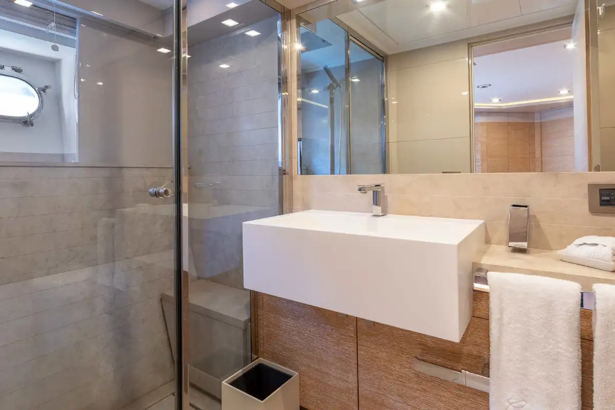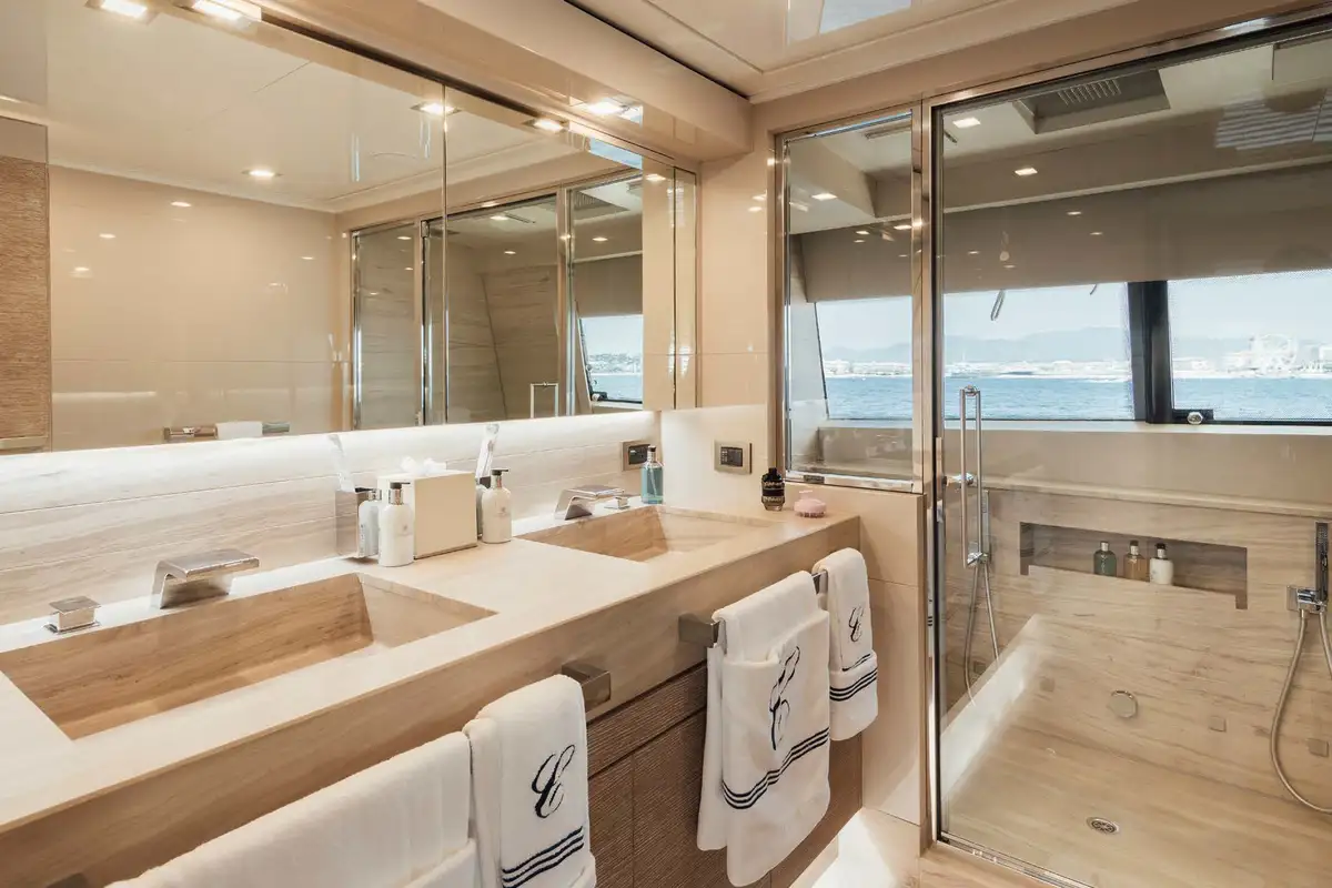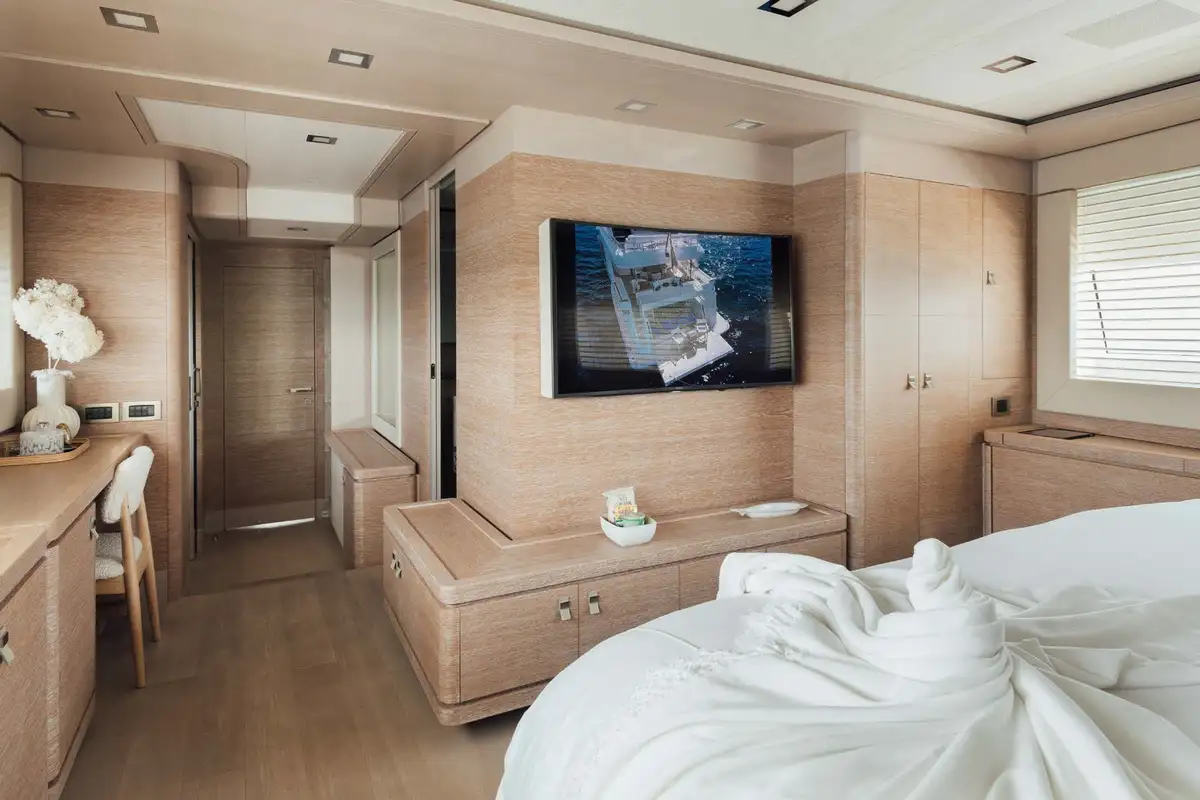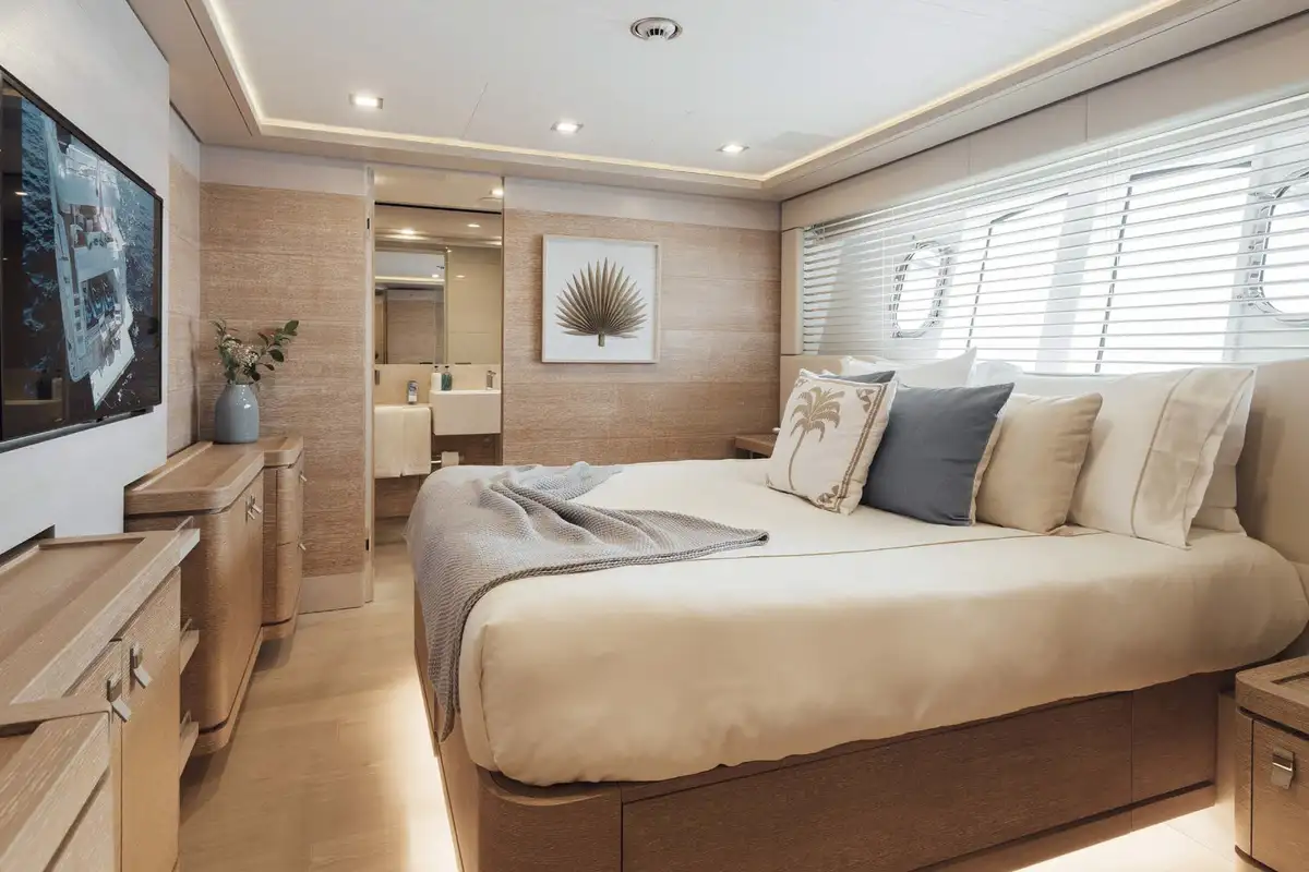 She welcomes up to eleven guests across five beautifully appointed suites. The full-beam master cabin sits forward on the main deck, offering supreme privacy and views, while two double and two twin cabins, one with an additional berth, ensure comfort for families or groups.