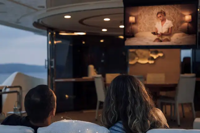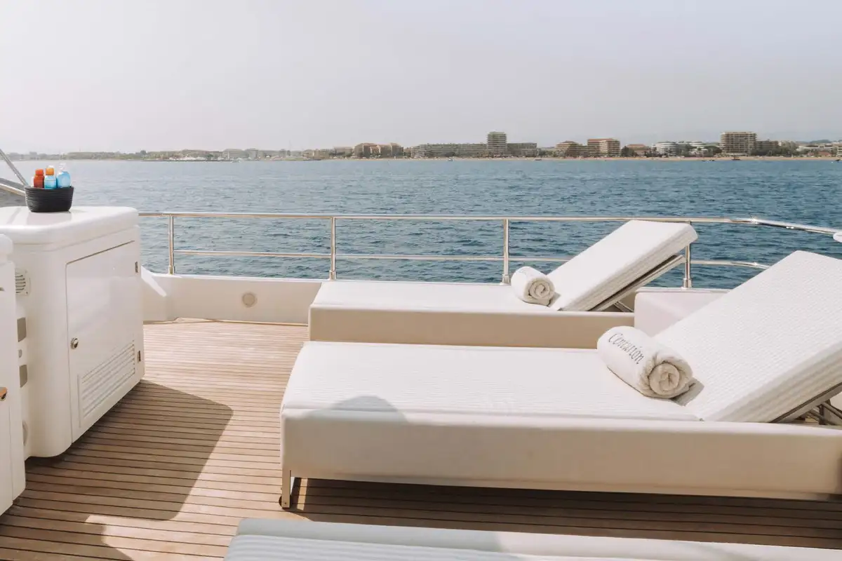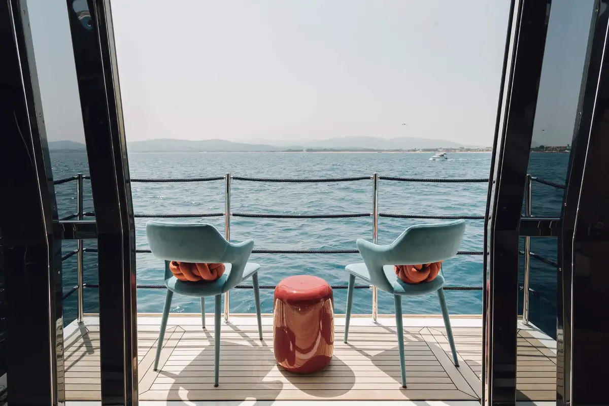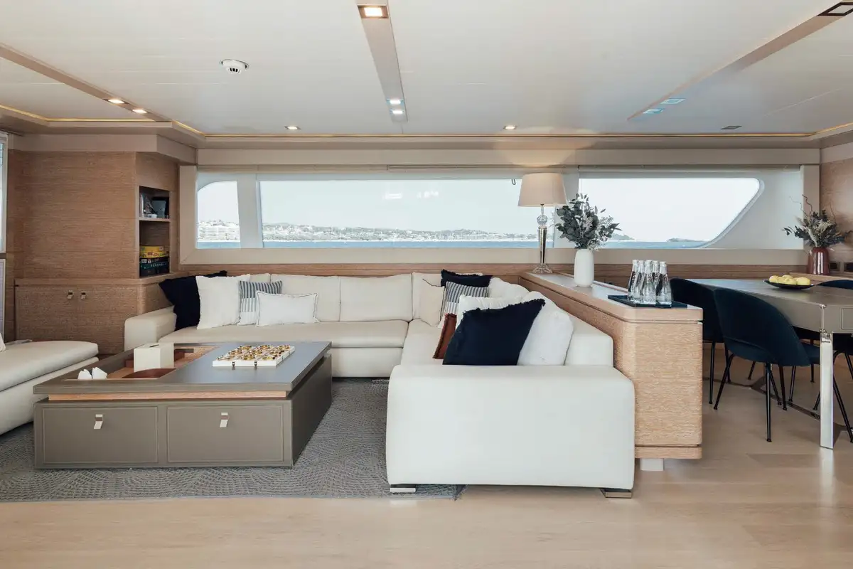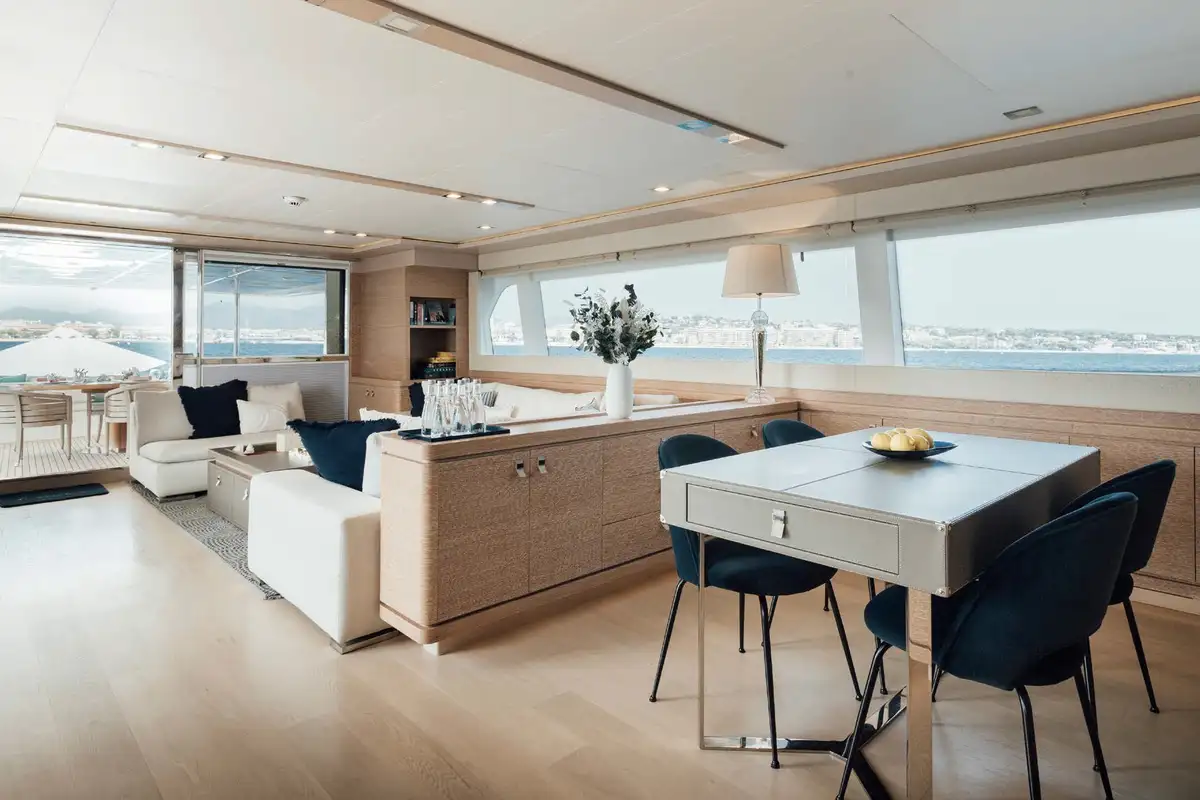 Step inside and the mood is serene. Cool, contemporary interiors are bathed in light from panoramic windows, while soft tones and refined finishes bring an atmosphere of calm throughout. A fold-down balcony extends the saloon above the waterline, offering a quiet corner to pause, breathe and take in the horizon.