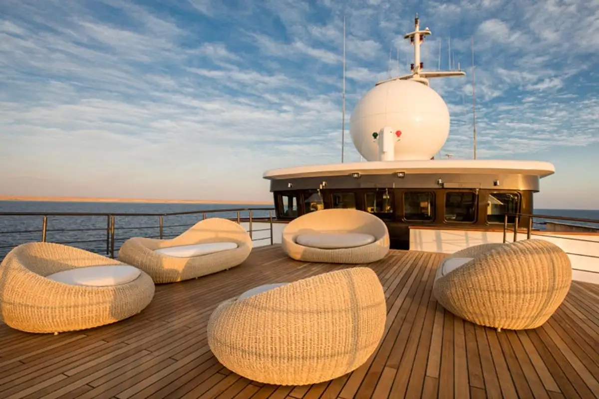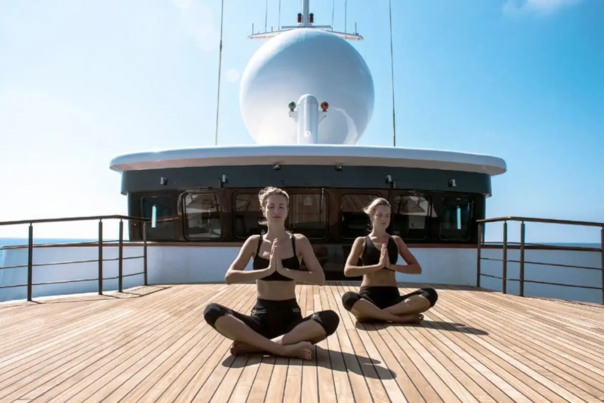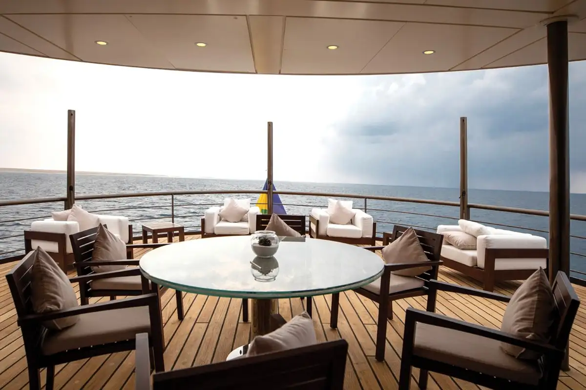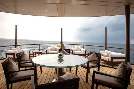 Up on the bridge deck there’s a dedicated yoga deck and lounge in full sun, with breathtaking views, as well as a big sundeck facing aft with plenty of shade and a large jacuzzi flanked by sunpads on a raised dais astern. The largest of her many outdoor dining spaces can easily seat 36 guests with ample room to spare. With two further big outdoor lounges, she could even host several social events separately at the same time.