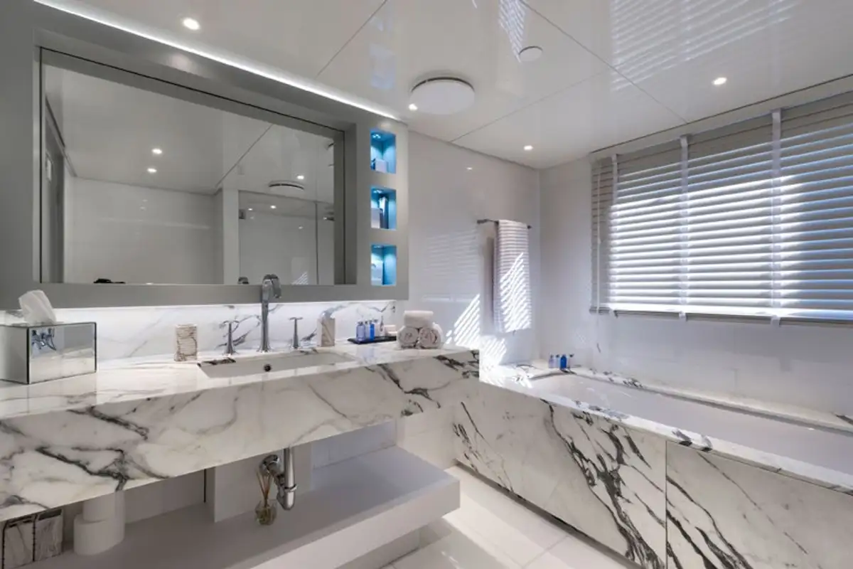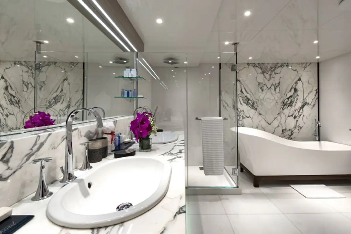 Up front on B Deck, the master suite has its own private hallway, a large separate office, a private dressing room and a marble-clad his-and-hers en suite bathroom as well as the 85m2 main cabin, which has two lounge areas. The full-beam VIP suite at the forward end of B Deck is almost equally impressive. Its 50m2 cabin has a private lounge, a huge walk-in closet, a full-size bathtub in its marble bathroom and four large forward-facing windows.