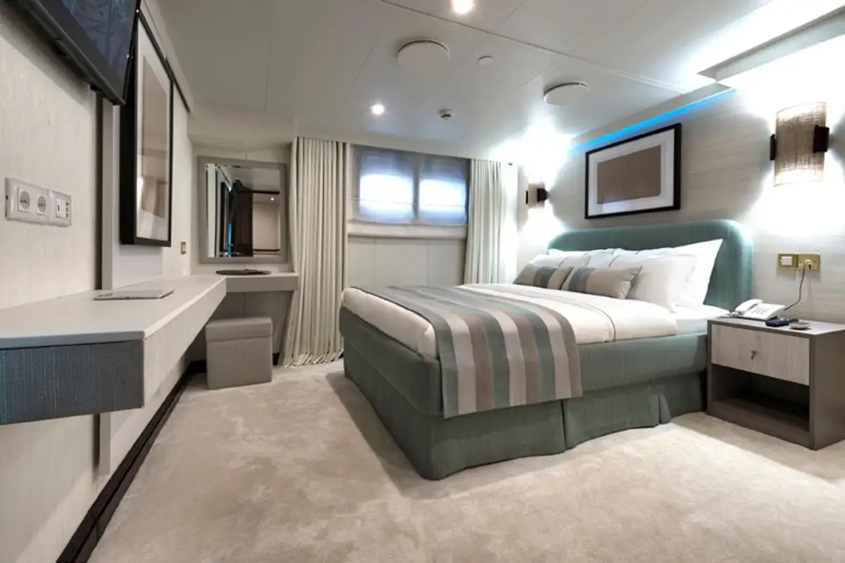 Her interior style is bright, contemporary and opulent with dark hardwood floors and marble inlays offsetting pale fabrics and carpets, along with some notable pieces of modern art. The three upper decks are lined with huge tinted windows that flood the interior spaces with natural light while ensuring complete privacy for those inside. The stand-out interior spaces include the impressive club and lounge bar on A Deck, and the vast main saloon on B Deck with its 18-seat formal dining room next door.