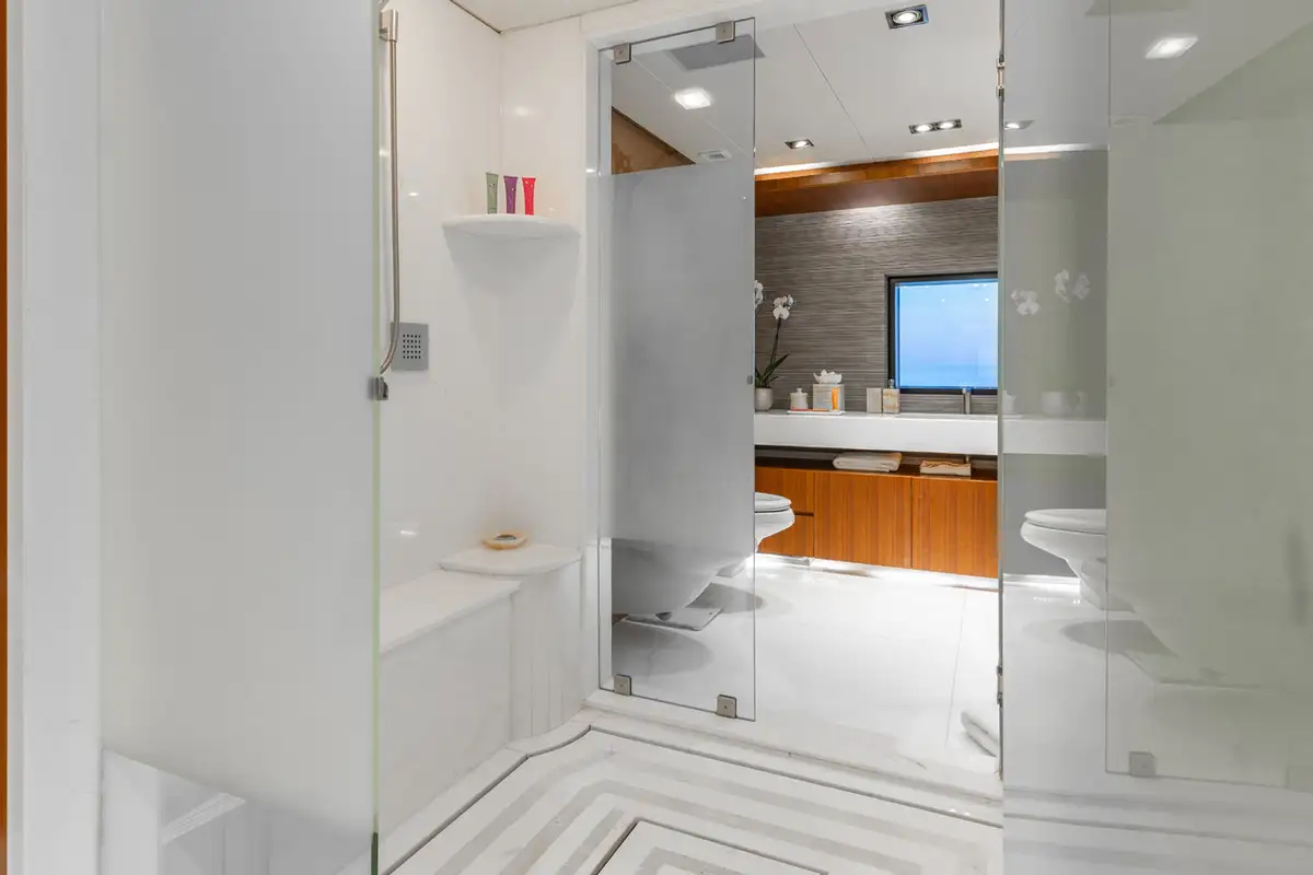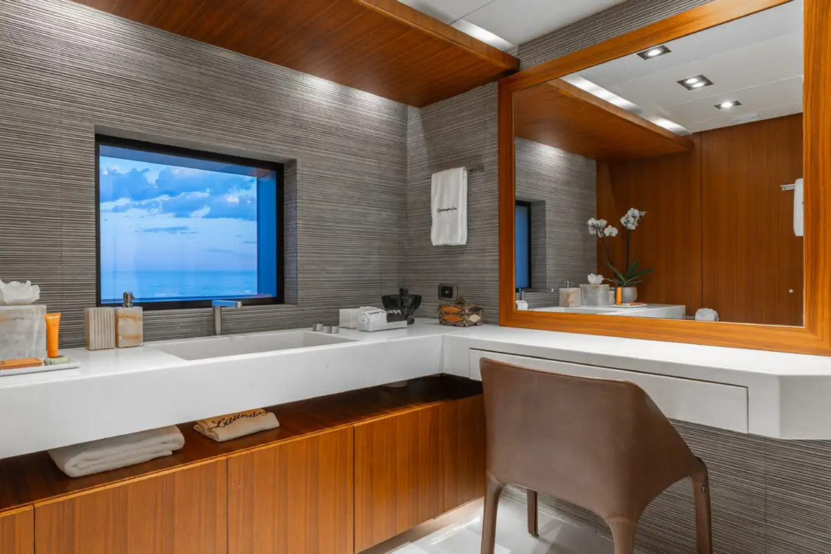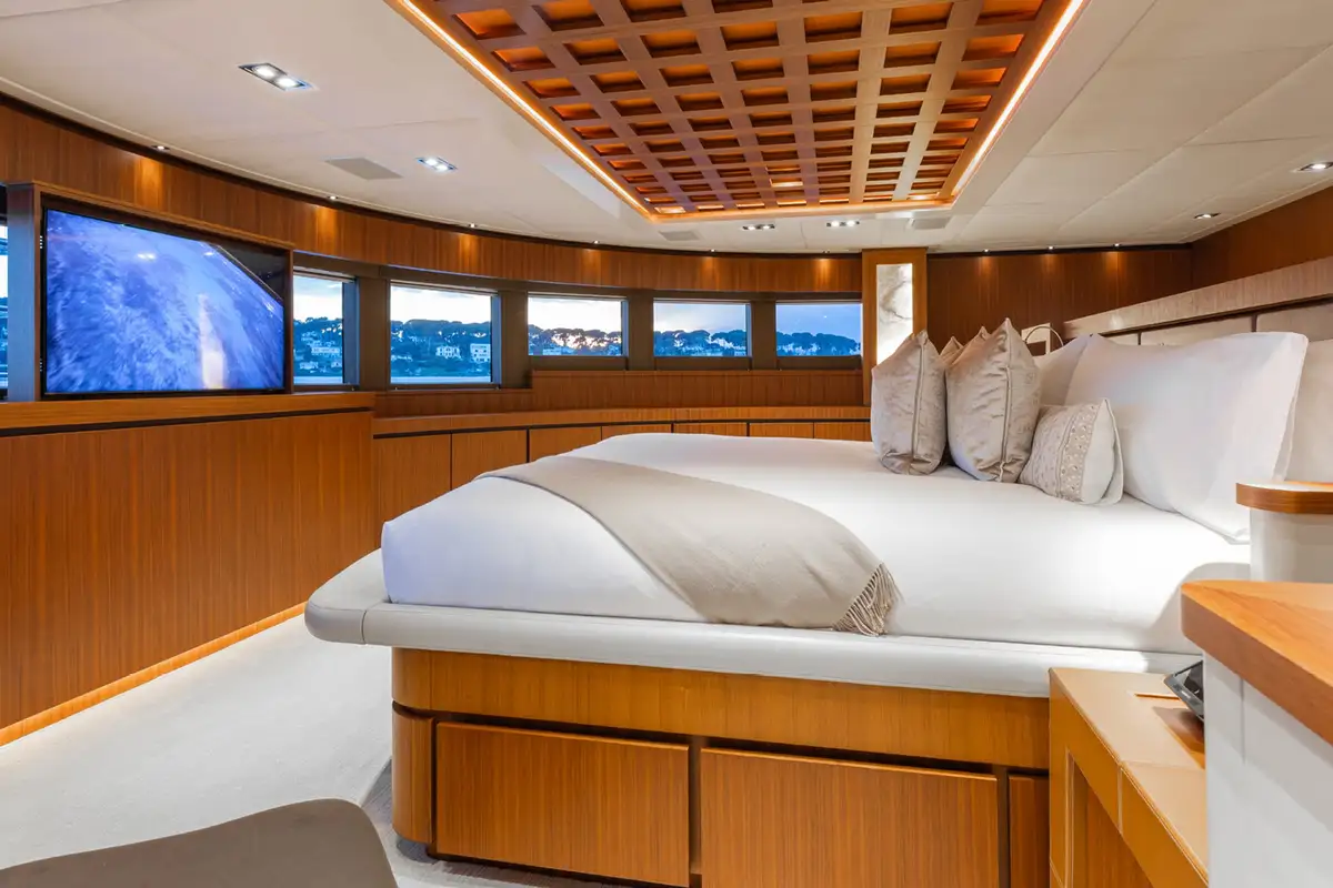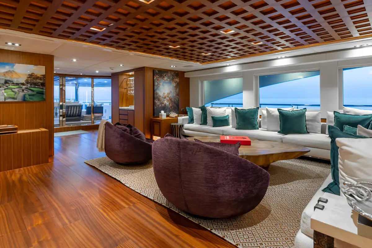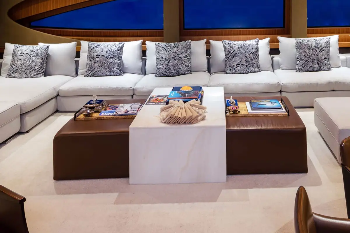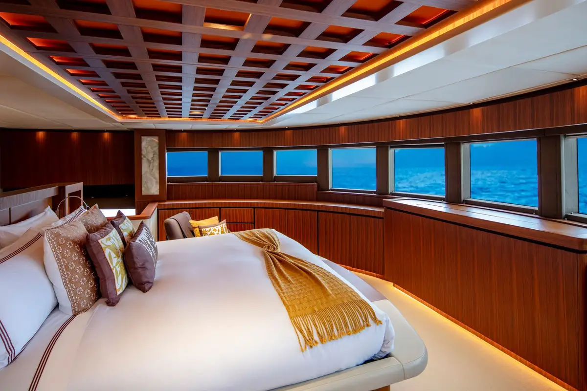 A grand central staircase will take you all to your suites. The master suite is on the main deck, and there are four more on the lower deck: two VIP suites and two twins sleep another eight. Plus there’s the option to create a sixth suite in the sky lounge if your party requires.
