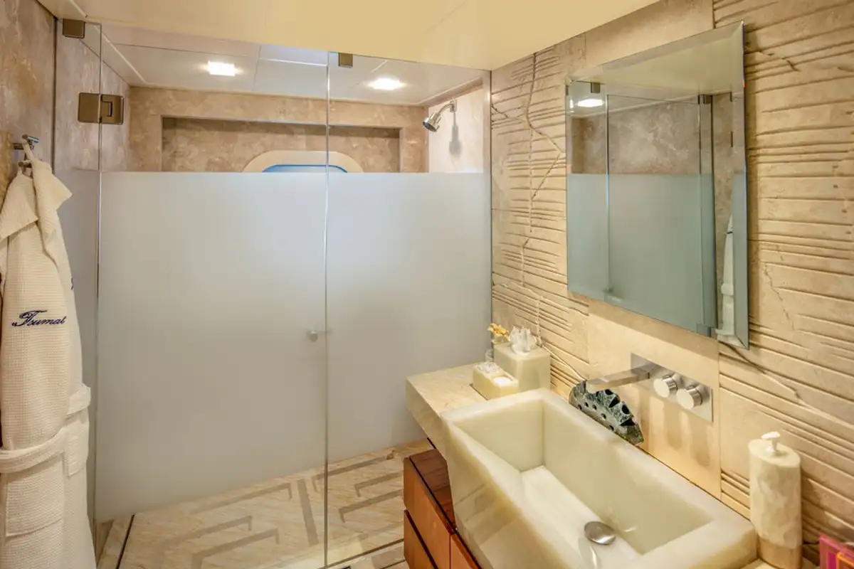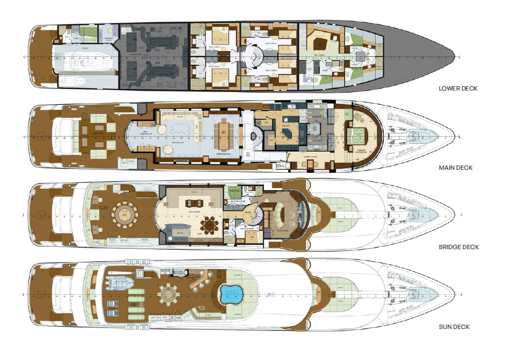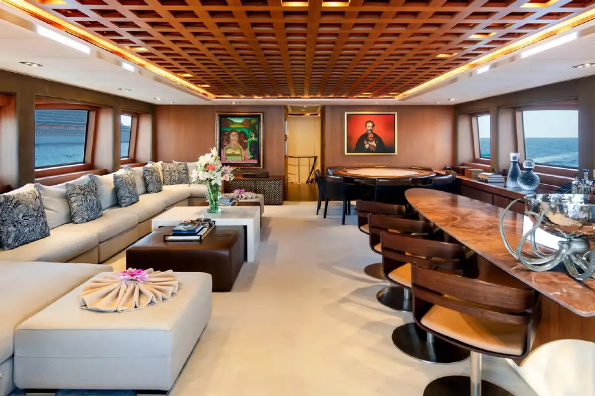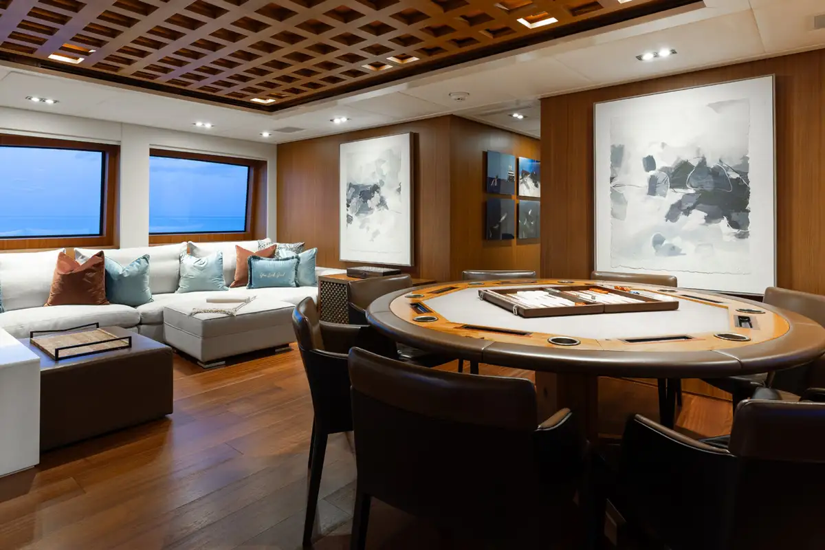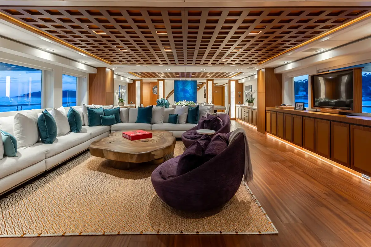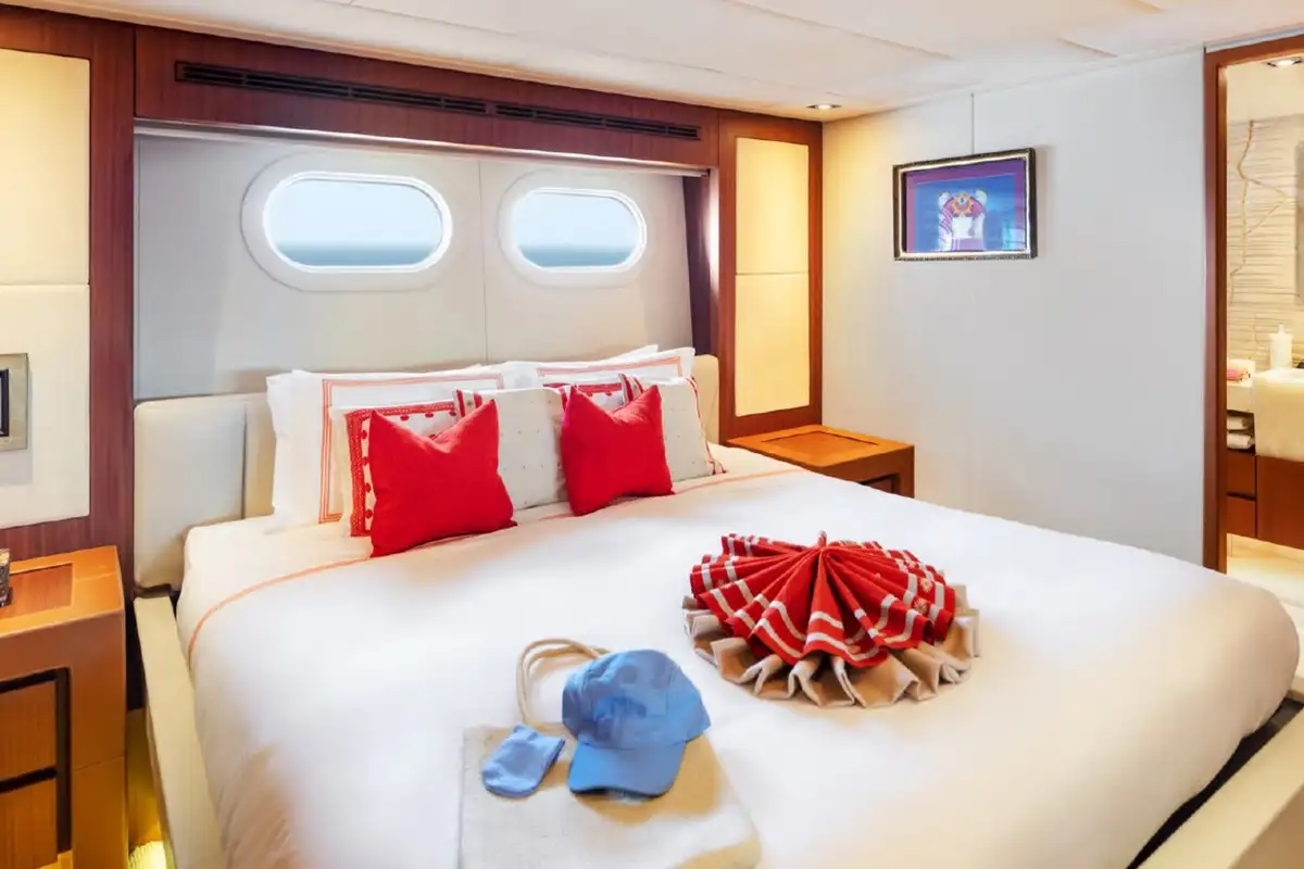 A grand central staircase will take you all to your suites. The master suite is on the main deck, and there are four more on the lower deck: two VIP suites and two twins sleep another eight. Plus there’s the option to create a sixth suite in the sky lounge if your party requires.