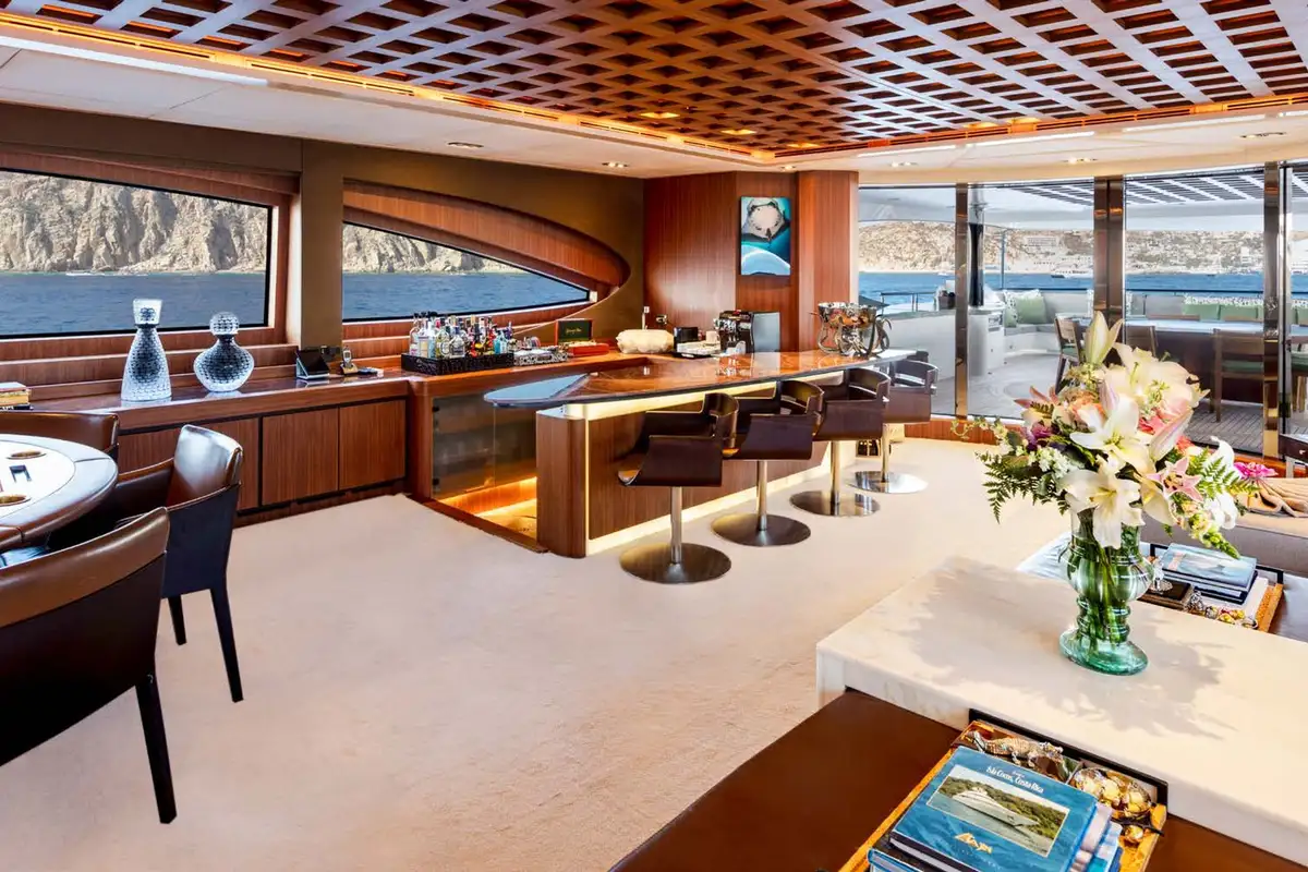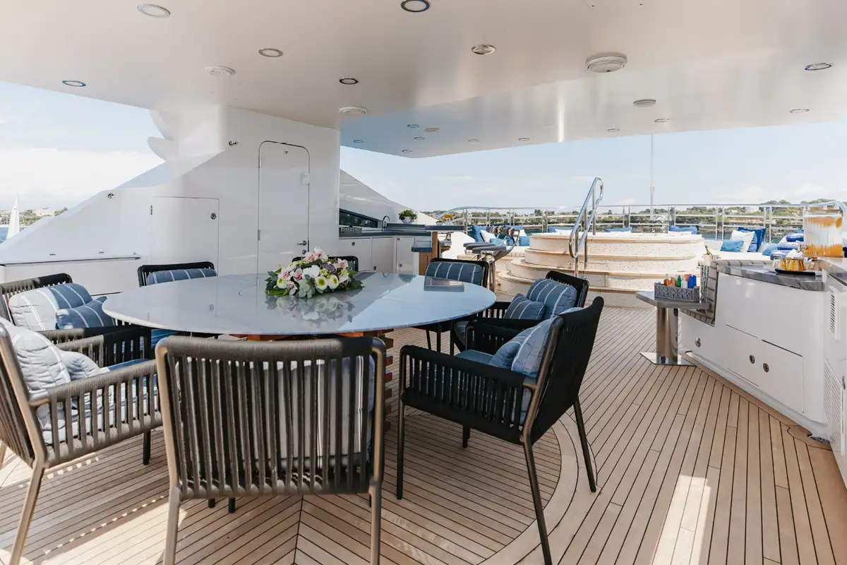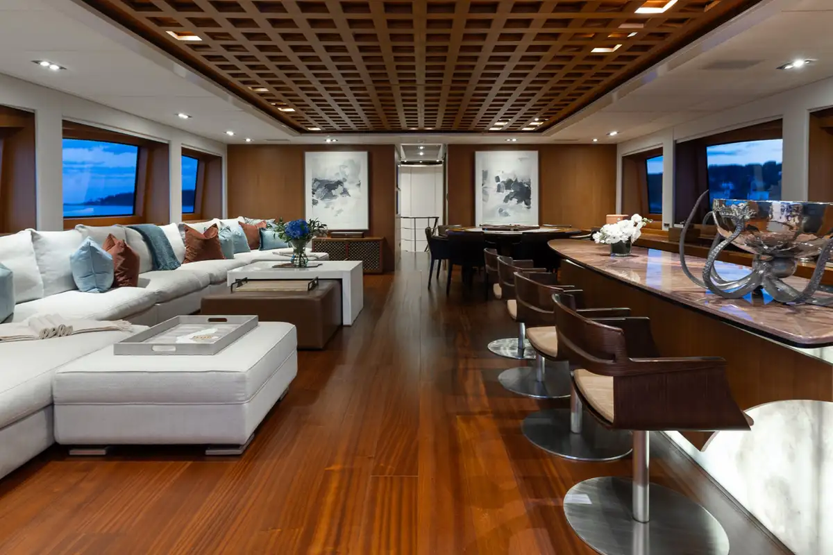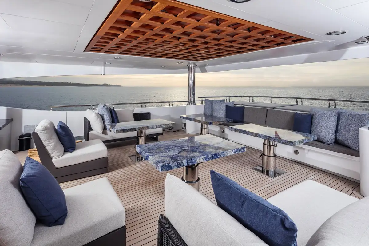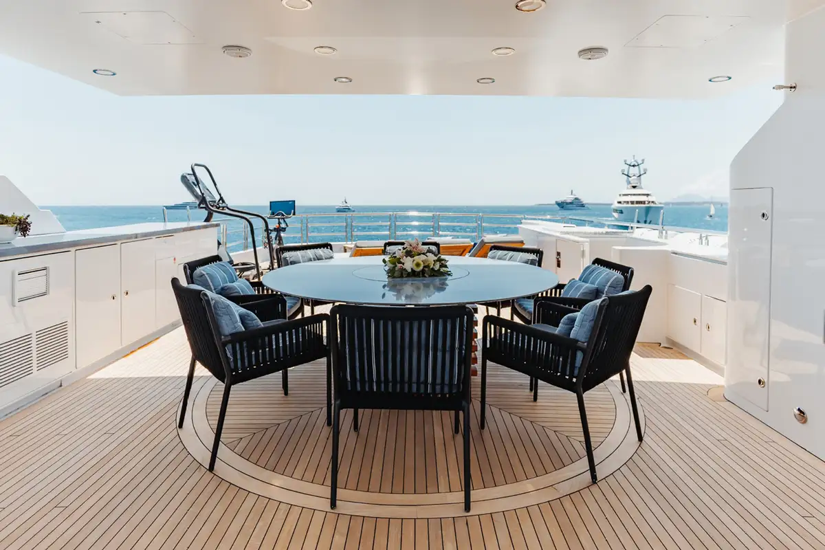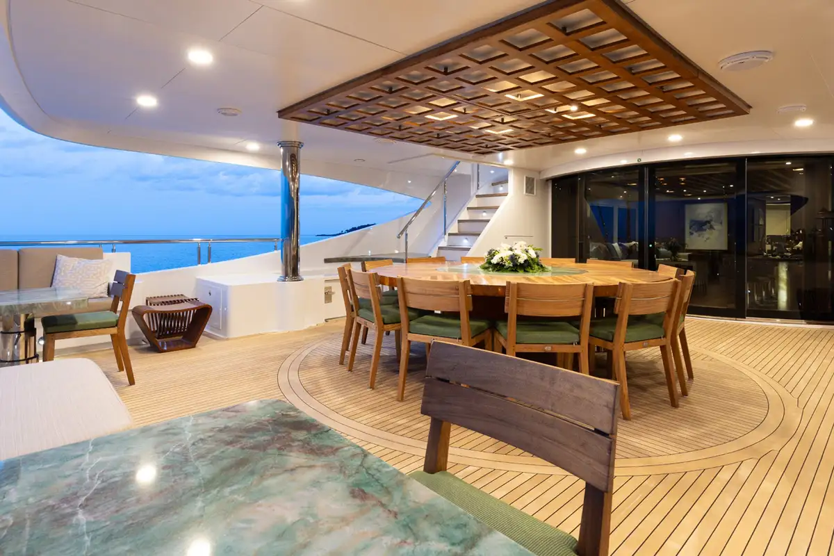 The upper aft deck is the spot for lunch. The sociable round table welcomes you with a fine spread of freshly caught fish and baked breads. If the mood takes you to make it a long lunch, the sky lounge bar is just a step through the full-length glass doors to order something thirst-quenching.