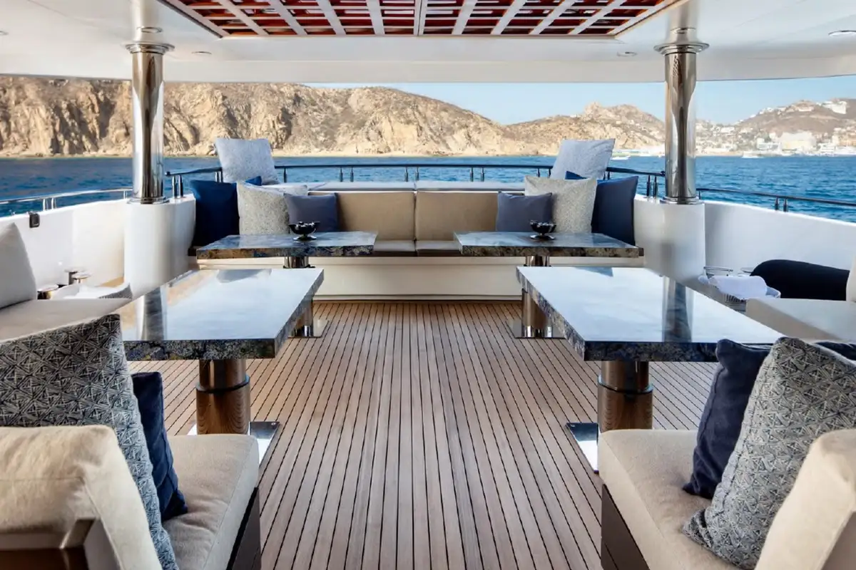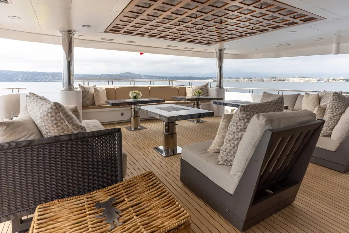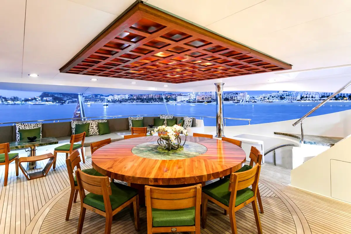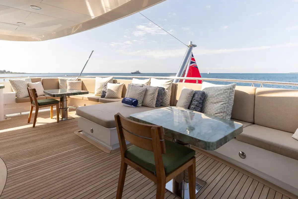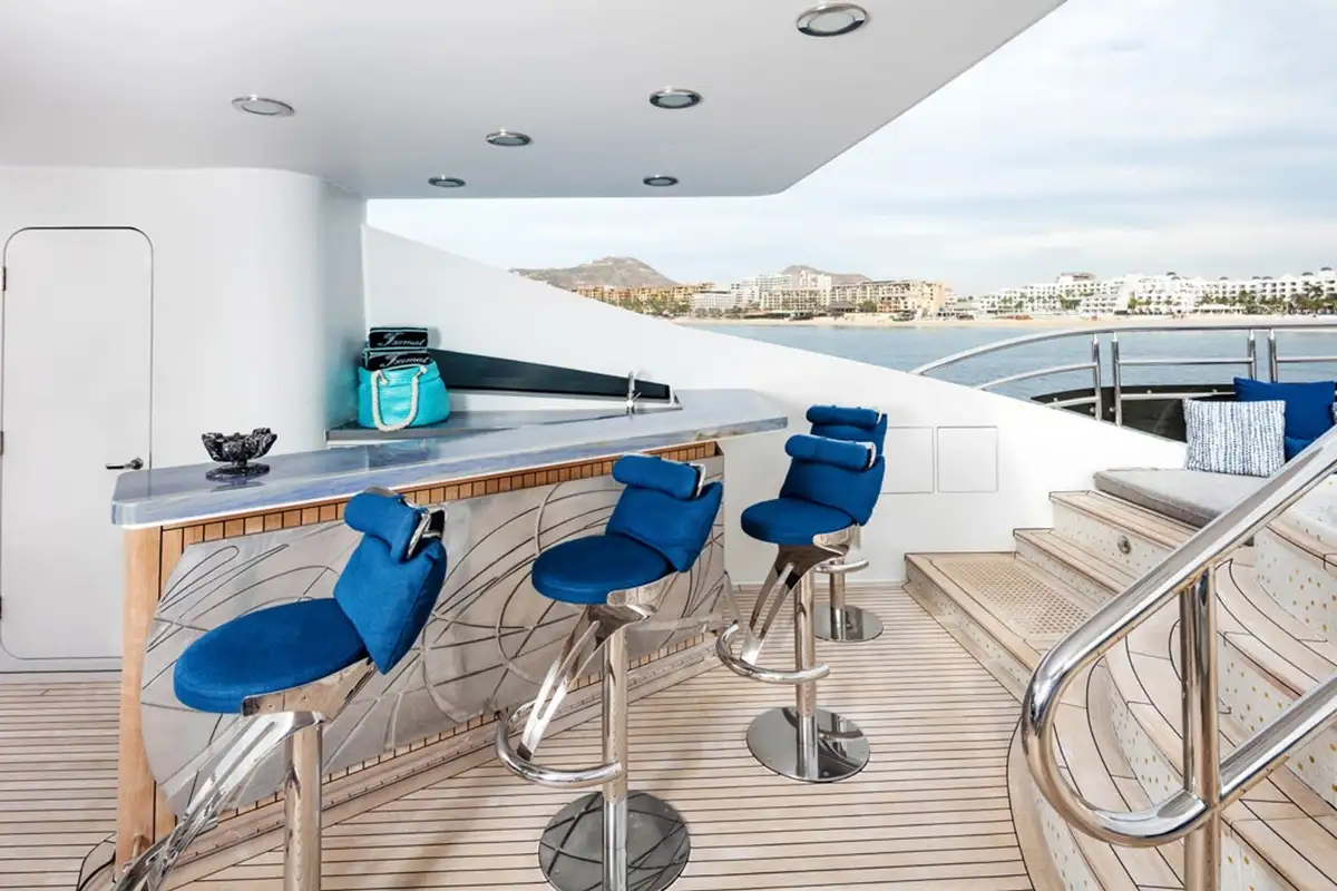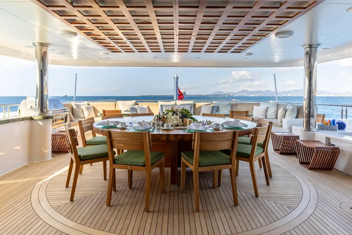 The upper aft deck is the spot for lunch. The sociable round table welcomes you with a fine spread of freshly caught fish and baked breads. If the mood takes you to make it a long lunch, the sky lounge bar is just a step through the full-length glass doors to order something thirst-quenching.