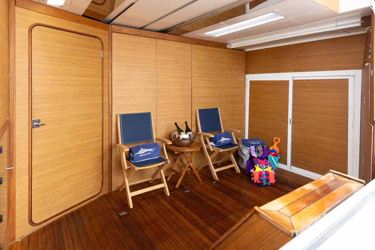 CHAMPAGNE SEAS is a head-tuner in any anchorage. Ready to entertain a party of 12, she will give you an unforgettable charter - with fast passage along the coast, spacious decks to explore and water toys galore.