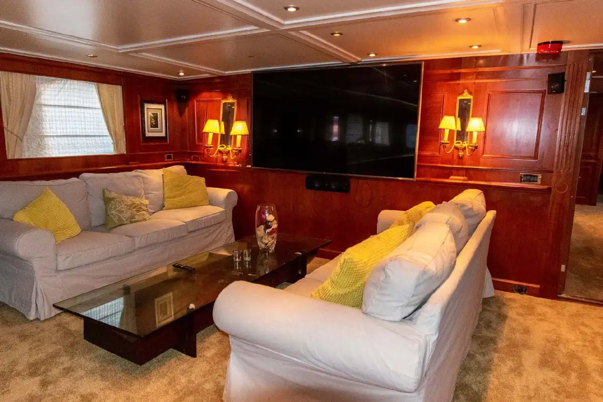A cosy interior is crucial for cold-water cruising and CHANTAL has an opulent, exceptionally comfortable main deck lounge where you’ll feel instantly at home. There’s a bar, a dining table and a sociable lounge with soft leather sofas and a big TV. She also has a snug skylounge on the upper deck.