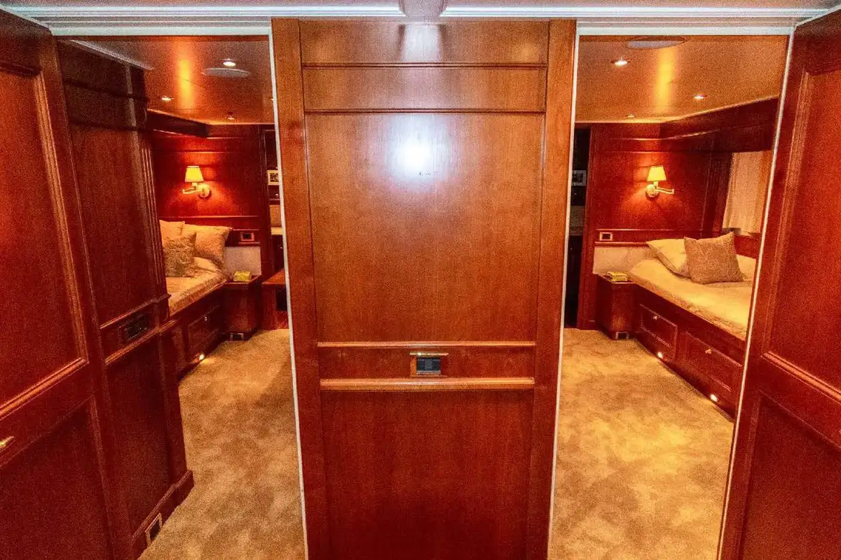 There’s also a full-beam suite on the lower deck, located aft with its own separate dressing room. The other cabins are two nice twins, one with bunk beds and a desk which would make a luxurious single cabin with the upper bunk folded away.