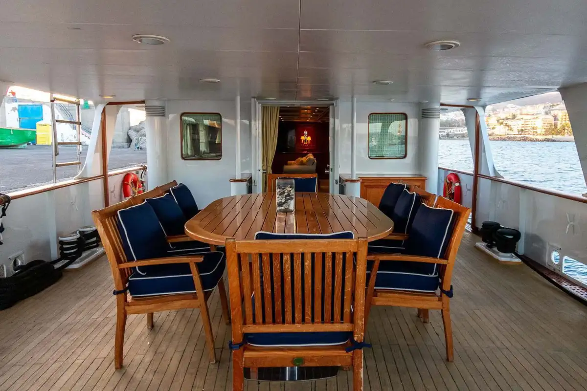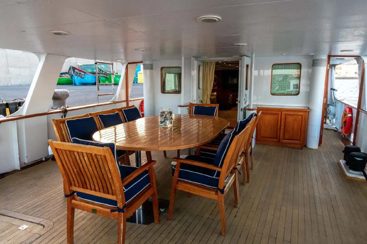 The upper aft deck has comfy seats with more shelter from the breeze and the main deck aft is a covered outdoor space where guests can gather for breakfast, lunch or dinner around the big oval dining table.