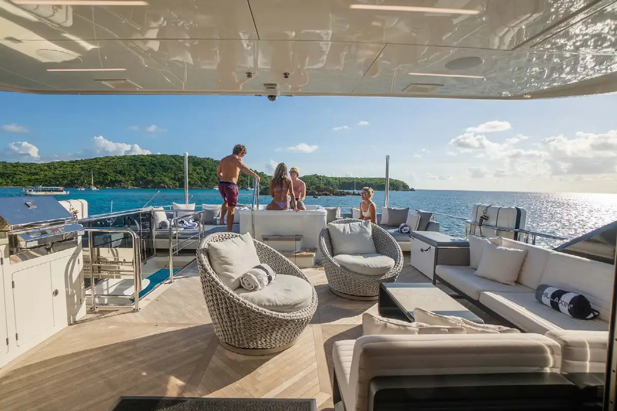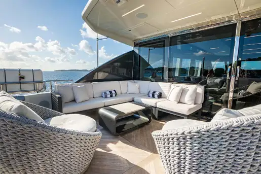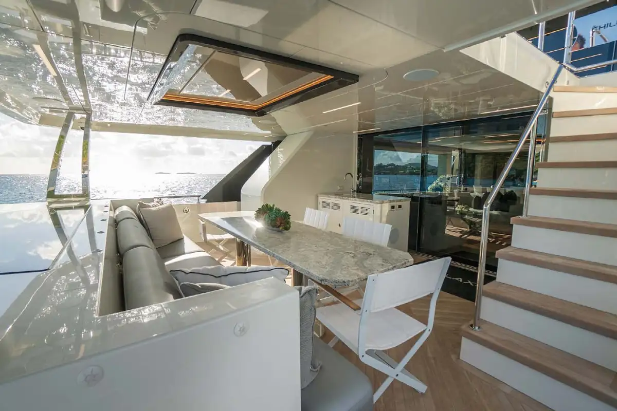 The skylounge aft encourages entertaining and endless evenings of fun. An L-shaped seating area is just outside the sliding glass doors and a full wet bar is to starboard. Further aft is a luxurious four-person spa Jacuzzi flanked by sunpads. A manual awning provides plenty of shade to the area and a disco ball adds an element of excitement to liven up the nights spent onboard. CHILLAXIN’s vertical bow expands the alfresco living possibilities with a plethora of seating areas .