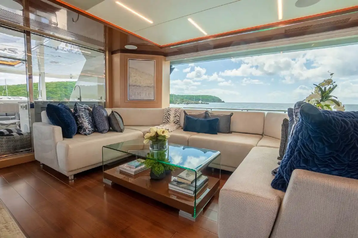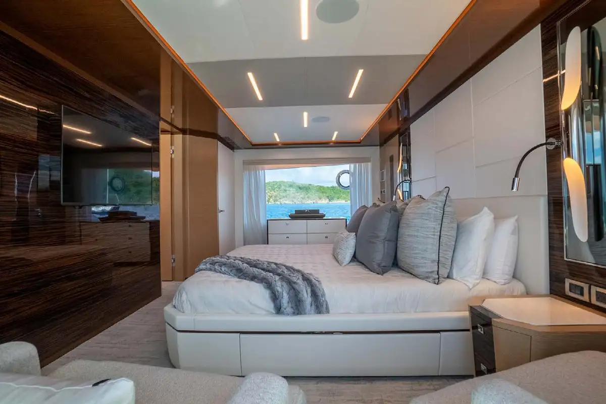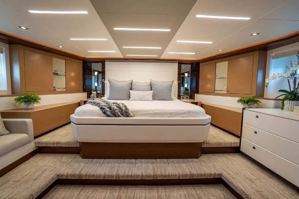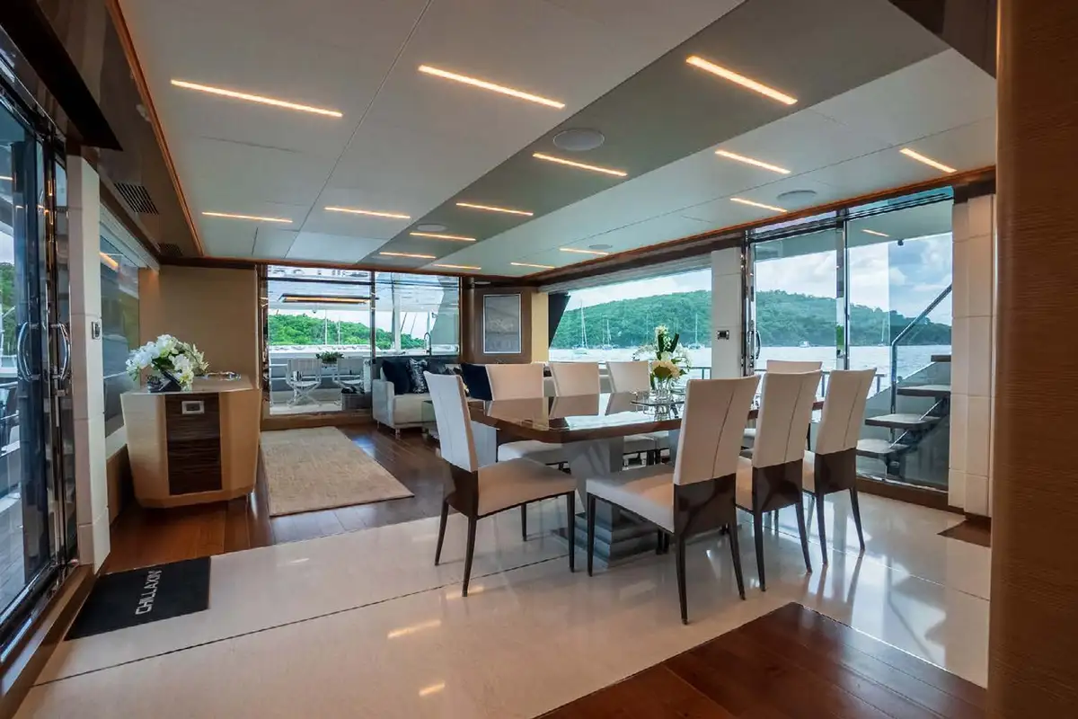 Enter the main salon via the whisper-quiet automated door, and notice the generous space and natural light. A sizeable U-shaped couch is the focal piece of the room, welcoming guests to gather and socialize. A fold-down TV comes from the ceiling above the hidden bar/sink to starboard. The formal dining table hosts up to eight guests with excellent visibility of the blue waters courtesy of the expansive floor-to-ceiling windows. CHILLAXIN’s interior combines light oak wood with high-gloss ebony and walnut molding, creating a warm and welcoming atmosphere.