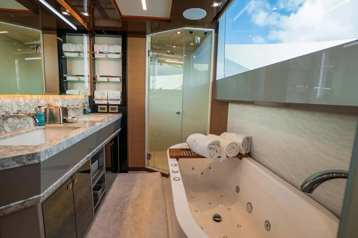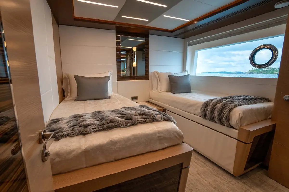 Four beautifully-appointed cabins welcome eight guests to spend restful nights in absolute elegance. The owner’s suite is full-beam with stunning floor-to-ceiling windows on either side. There is plenty of storage space in custom cabinetry and cedar-lined walk-in closets. The spa-like en-suite bathroom is a haven of relaxation with white and grey marble, an oversized Jacuzzi tub with an overhead window and heated stone flooring. The three additional guest cabins include a VIP with a king-size bed and two cabins with twin beds that can be transitioned into kings when desired. Large windows, TVs and en-suites with standing showers accompany each additional cabin.
