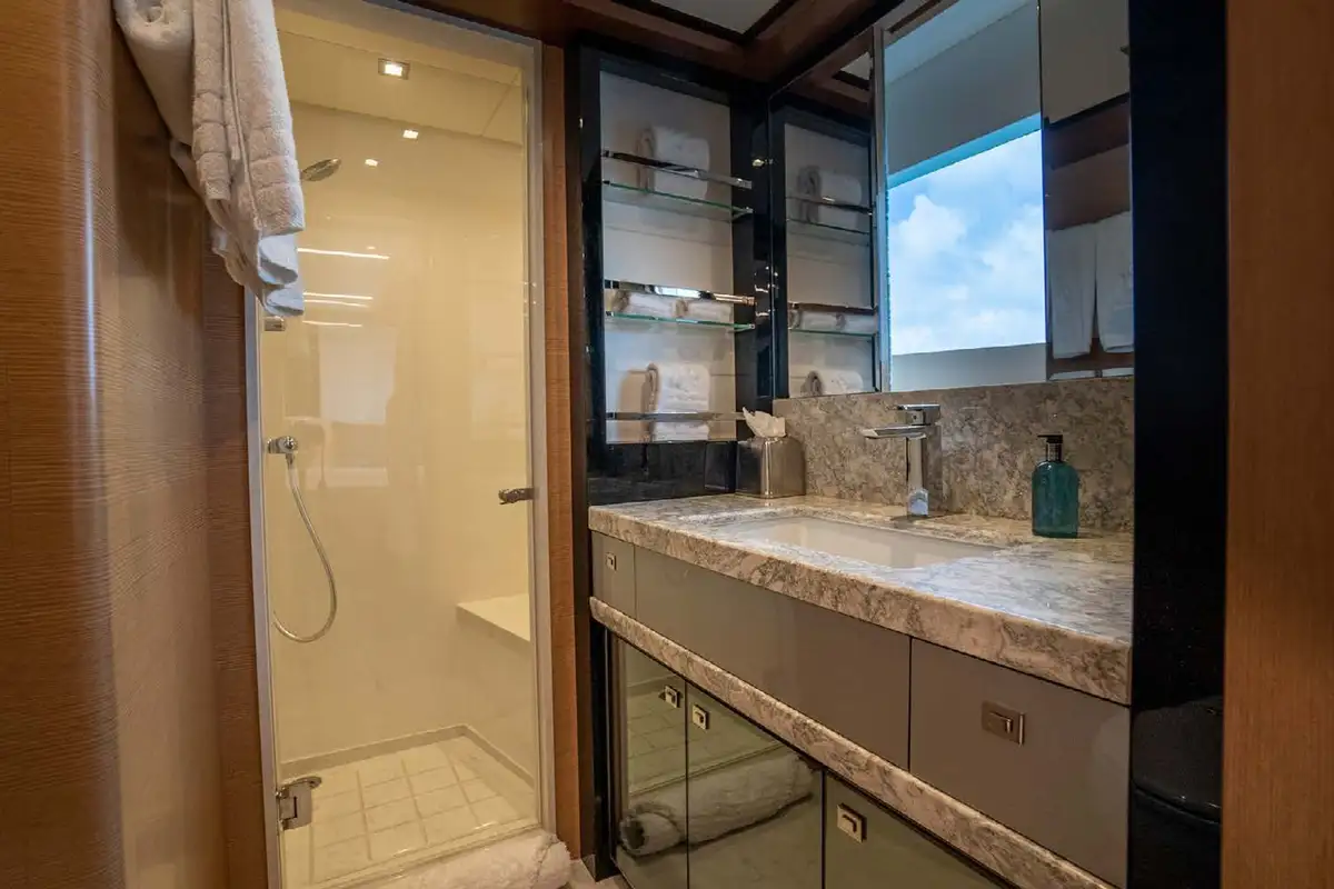 CHILLAXIN’s main deck aft is, as her model name suggests, revolutionary. This area is a testament to her entertainment capabilities, with an alfresco dining area for eight and a set of stairs that lead guests to her impressive beach club. When the garage door is opened, a tranquil lounge area is revealed with a sitting area, a bar and plenty of shade. When you’re itching to try your hand at the water toys, the hydraulic platform extends into the water allowing seamless access. The built-in freshwater shower just off the enclosed beach club is a refreshing rinse to wash away the salty water.