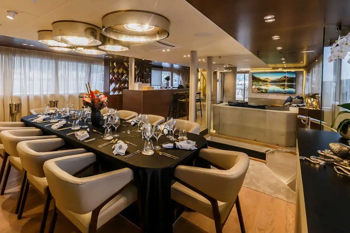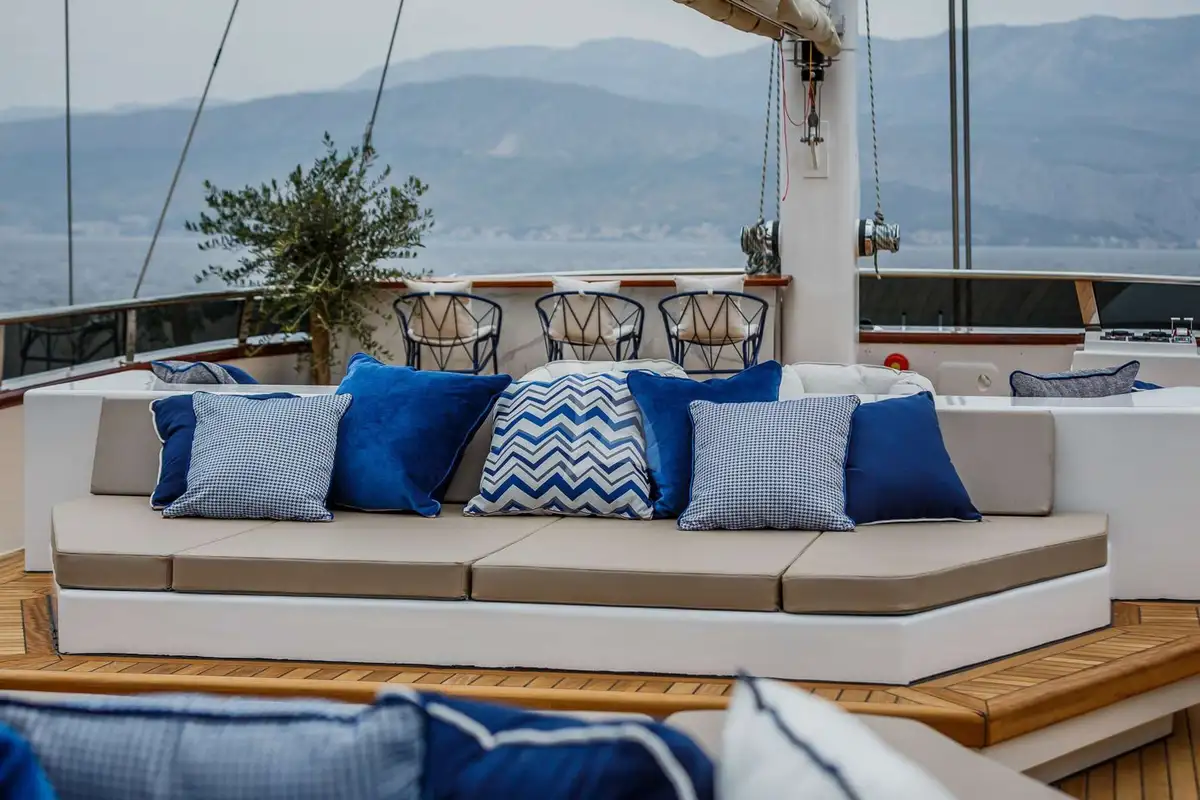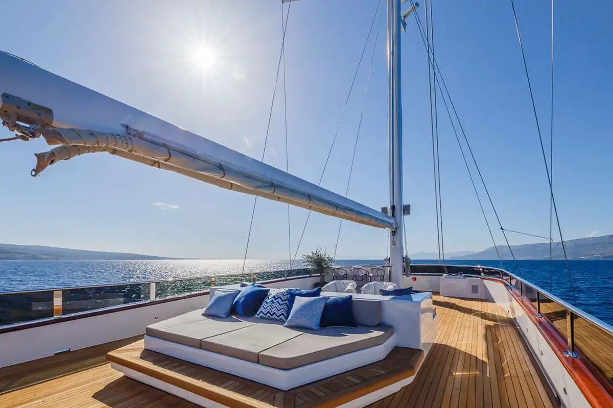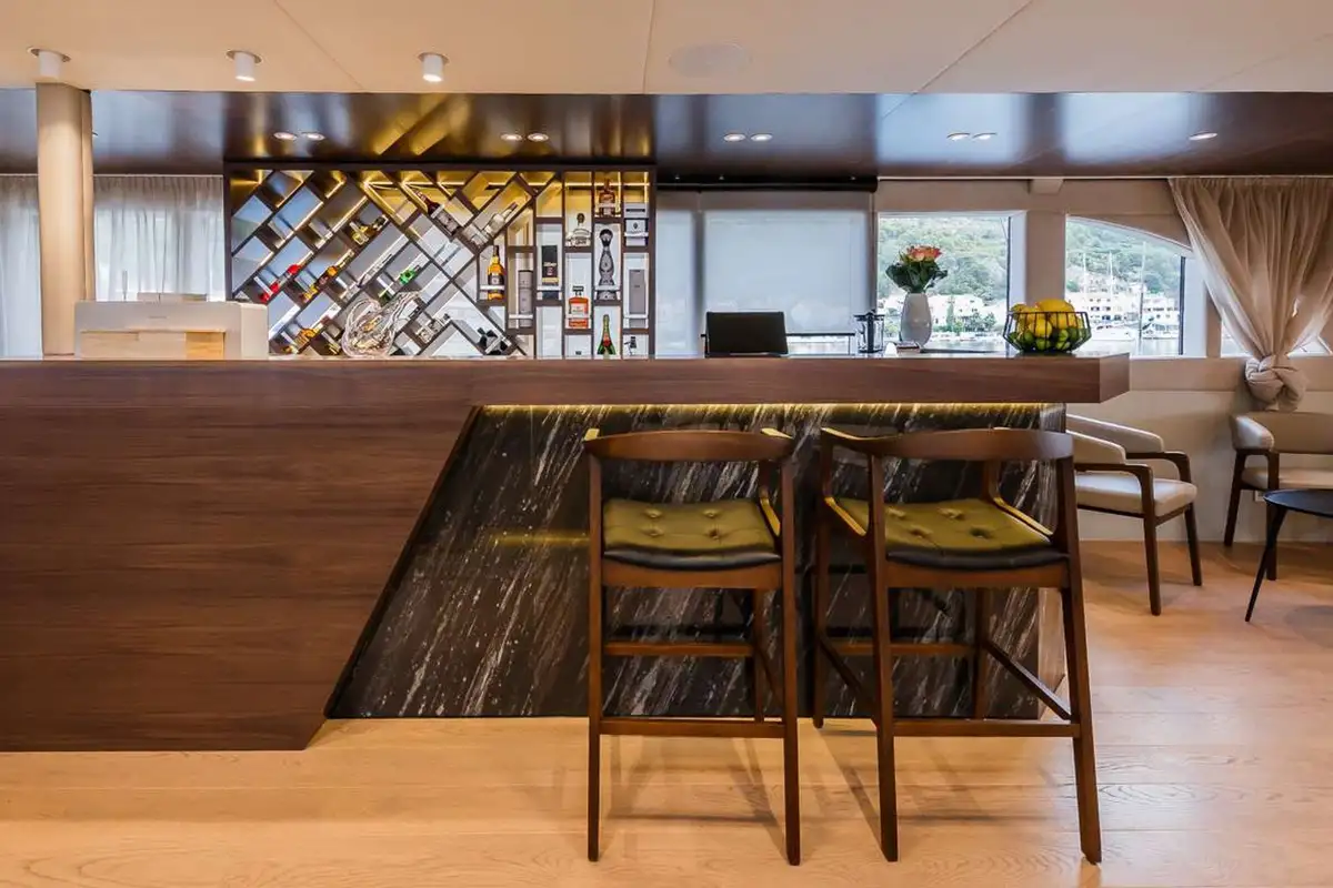Forward of the firepit is a huge sunpad around the mizzen mast and there’s another just aft of the sundeck’s wet bar. Overlooking the bow are three bar stools, the perfect place to watch the scenery glide by while cruising. By night, a TV projector turns the sundeck into an outdoor cinema for atmospheric movie nights.
