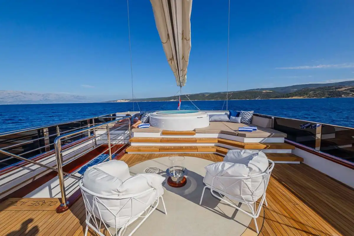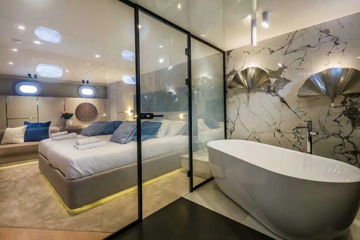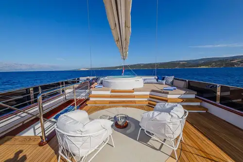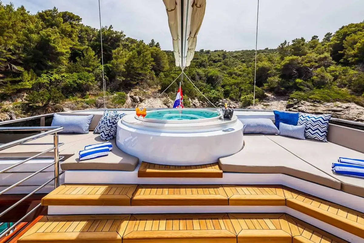 A huge sundeck is the focus of the family day, and awnings roll out to provide you and your guests with shade in the midday heat. Aft is an eight-person jacuzzi set amid a platform of sunpads and a couple of steps lead down to a firepit, a mesmerising feature at the heart of any evening.