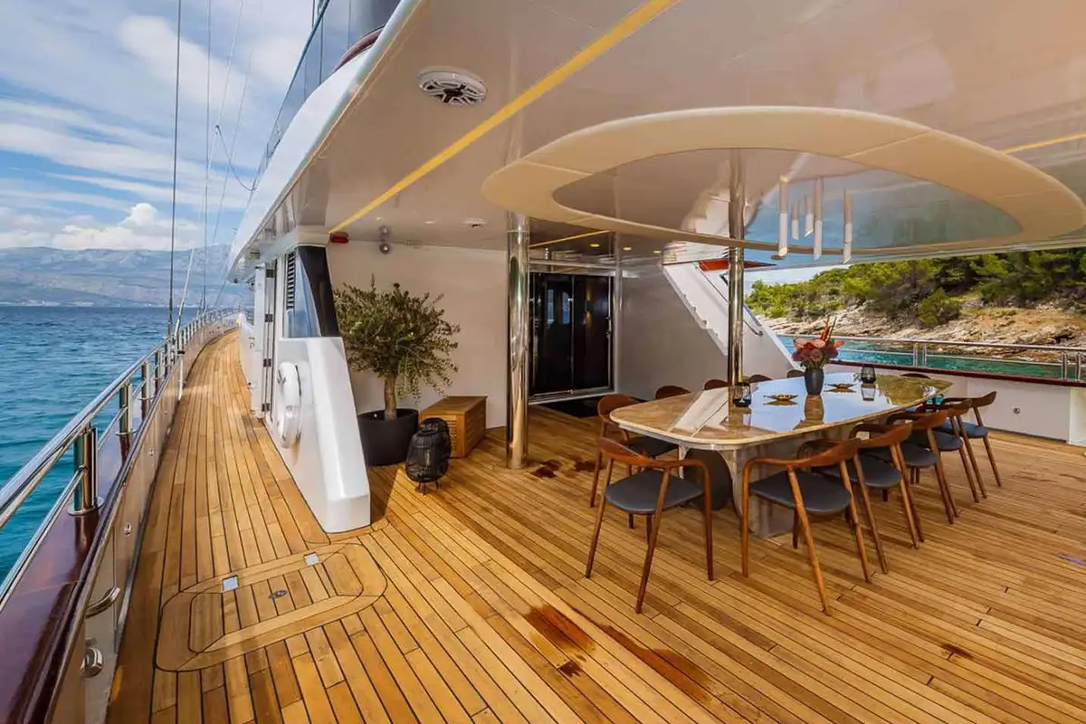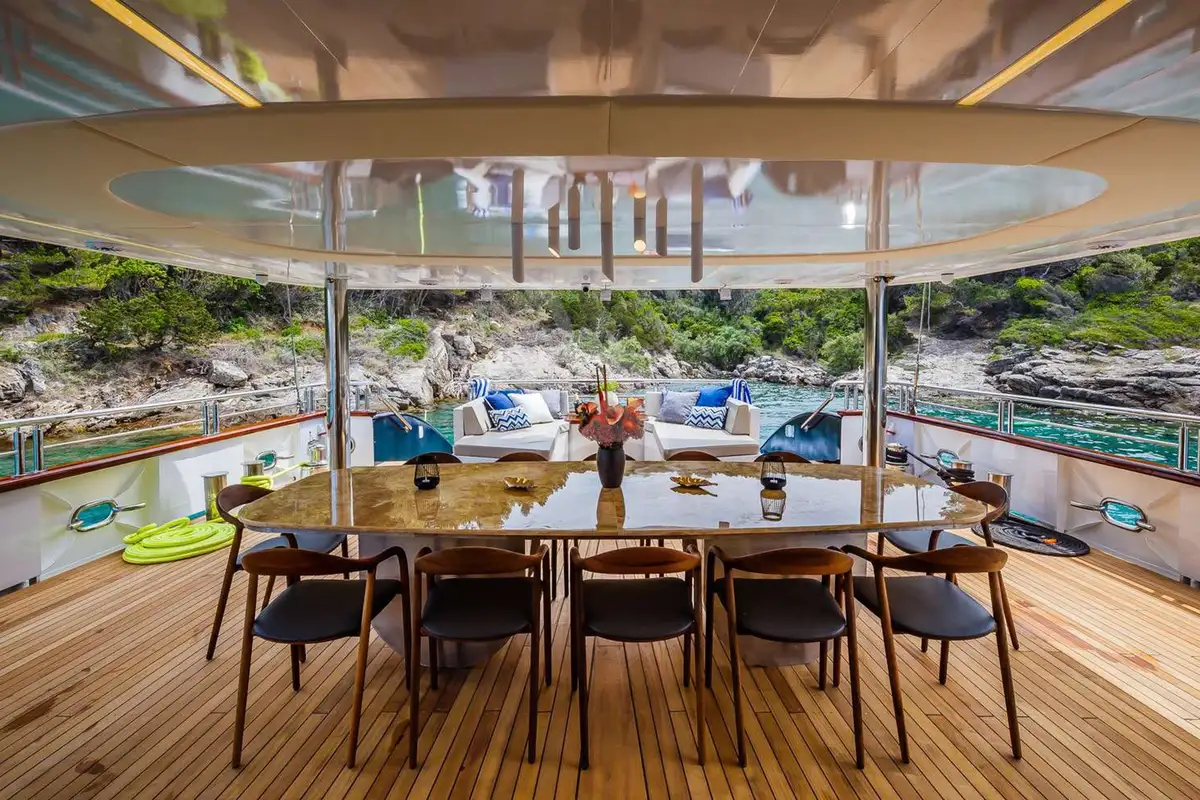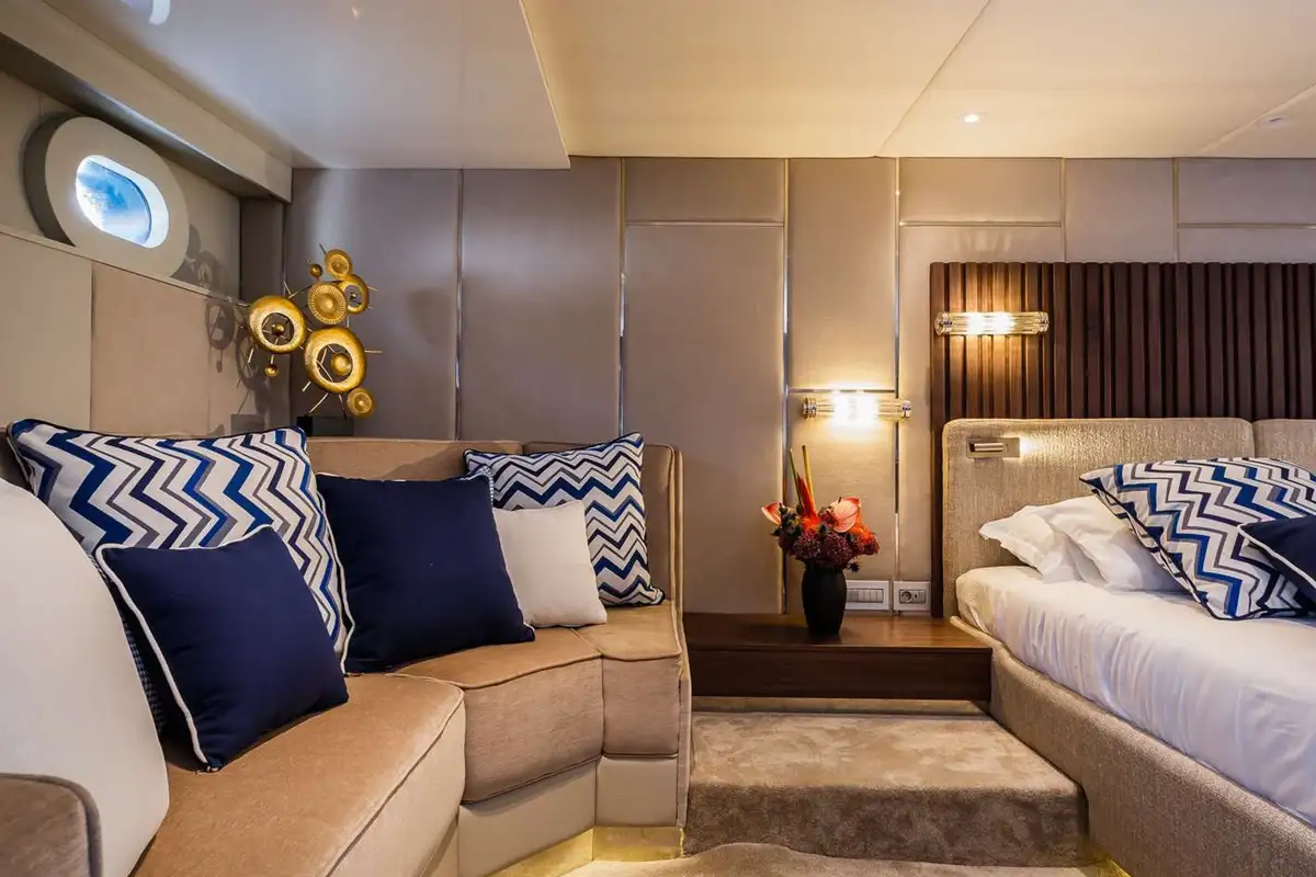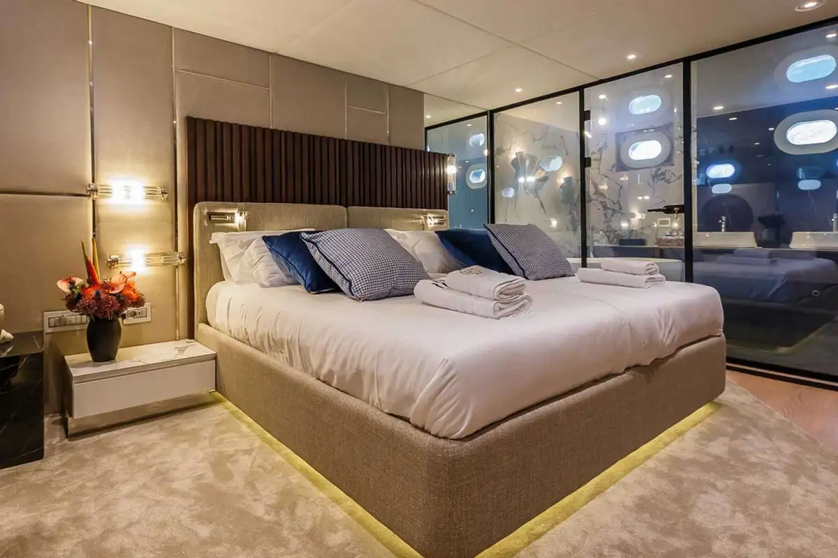 A huge sundeck is the focus of the family day, and awnings roll out to provide you and your guests with shade in the midday heat. Aft is an eight-person jacuzzi set amid a platform of sunpads and a couple of steps lead down to a firepit, a mesmerising feature at the heart of any evening.