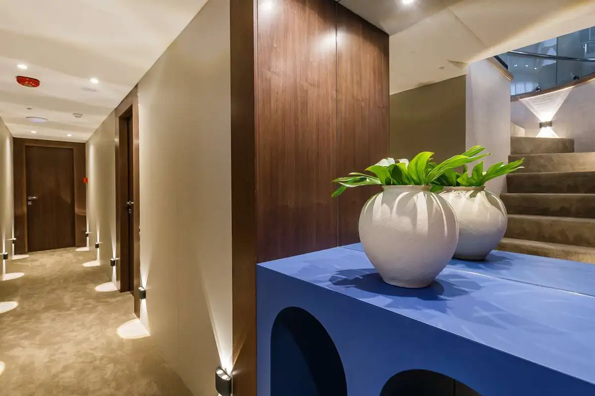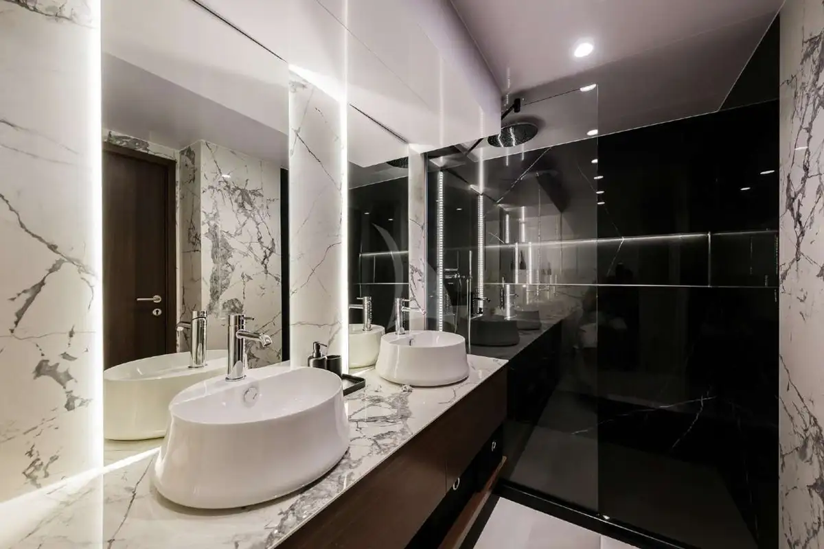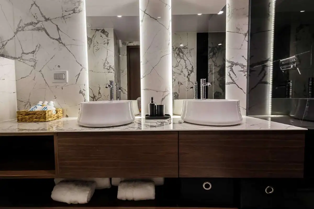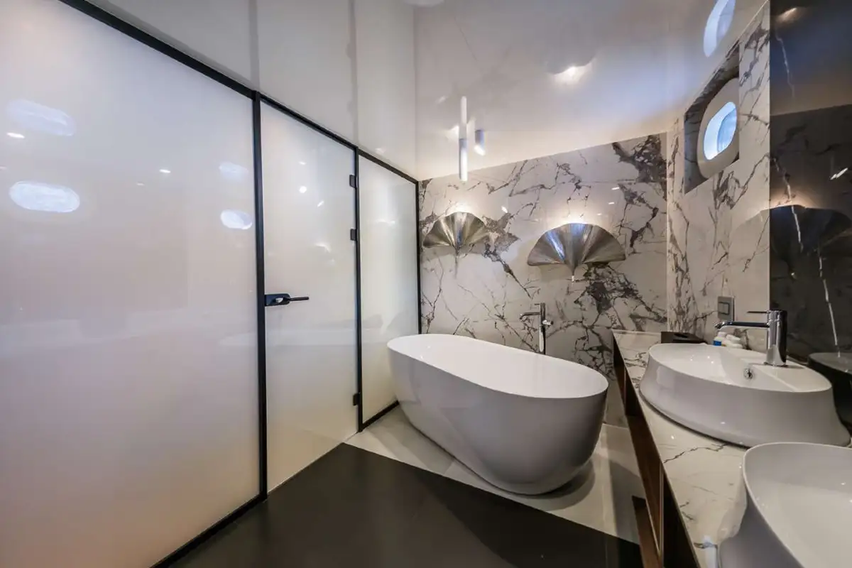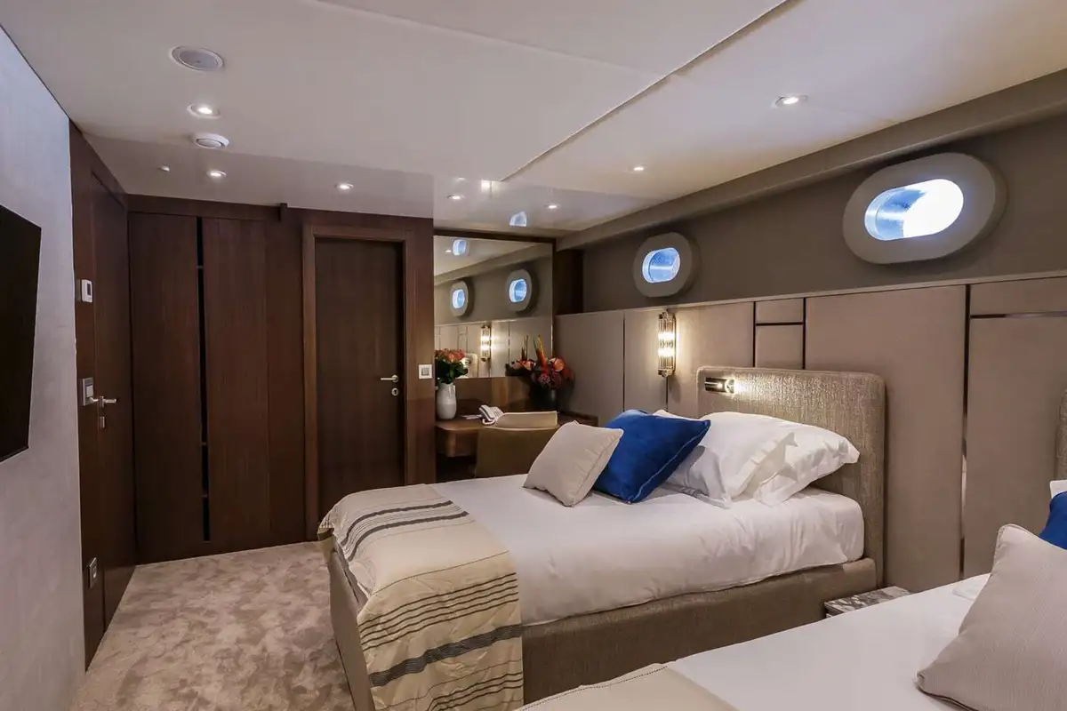 From the lounge stairs to port lead down to the guest lobby. Forward is your full-beam master suite with bath, shower room and sofa seating. Off the lobby, your guests will find four convertible en suite cabins that are adaptable to suit any party. From the main lounge another private staircase aft leads down to a full-beam VIP suite, so similar in size and style to the master suite that it could serve as a second master suite.