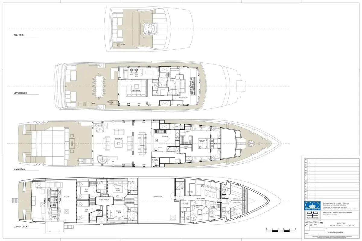 A design classic from the 1990s in beautiful condition, CLOUD ATLAS stands out from the crowd with her crisp exterior lines and bold, striking livery. Fresh and fully updated in a recent refit, this is a unique and distinctive yacht with her own individual sense of style. She’s a 46-metre (150ft) tri-deck vessel with ample living space, designed to host up to 12 guests in five cabins with service from a crew of nine.