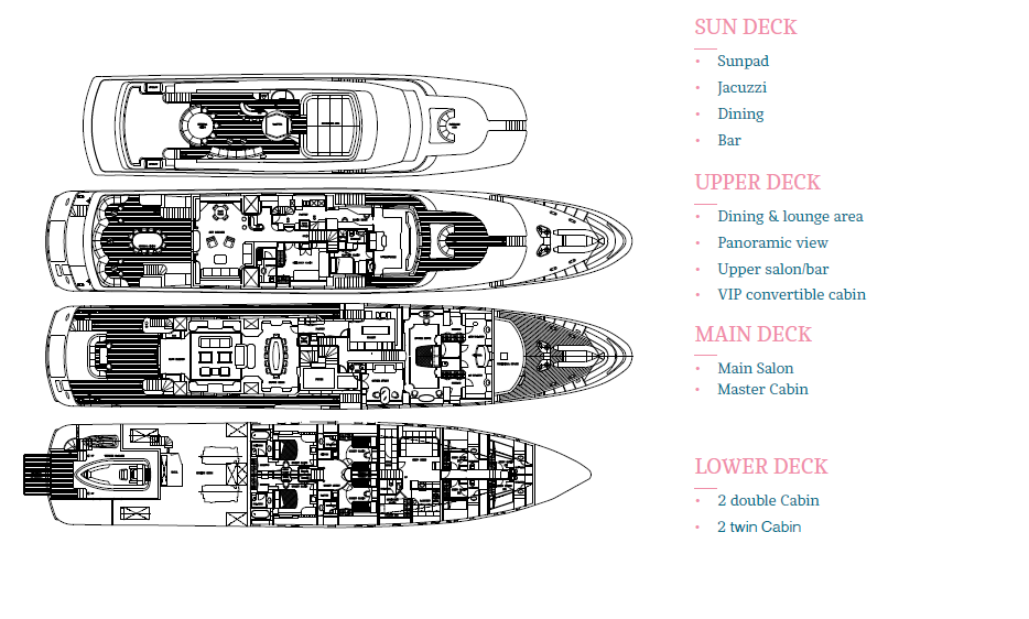 Leaving the best to last, COME PRIMA’s crowning delight is her sundeck. It’s a haven of relaxation to make the most of your surroundings and, of course, the weather. You can relax in the jacuzzi, on the sumptuous oversized sunpads, sitting at the bar, or just enjoy drinks reclining on the sun loungers. Every moment on COME PRIMA promises to be an unforgettable experience.