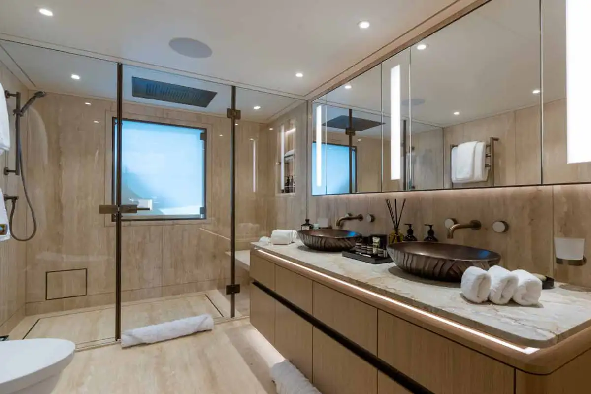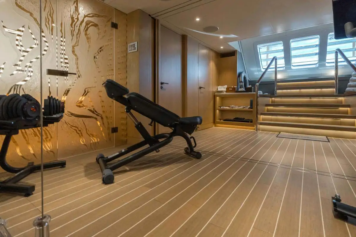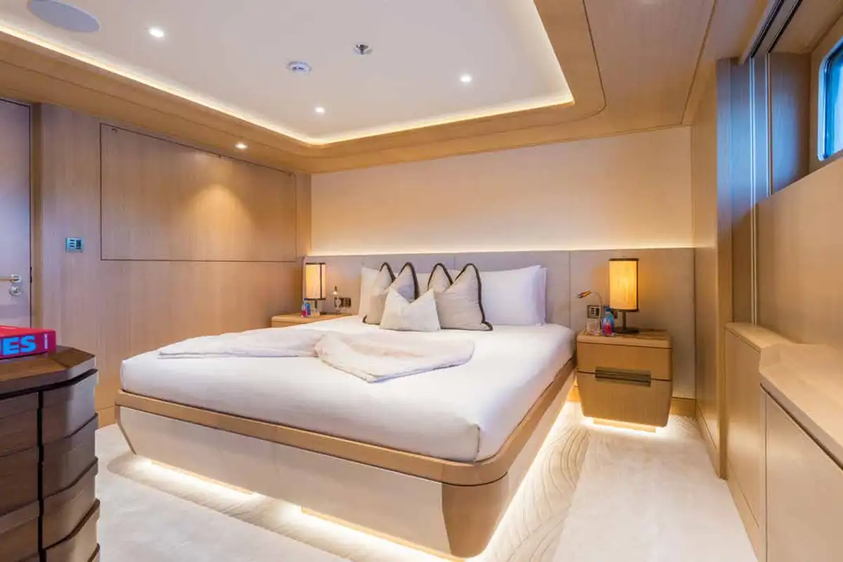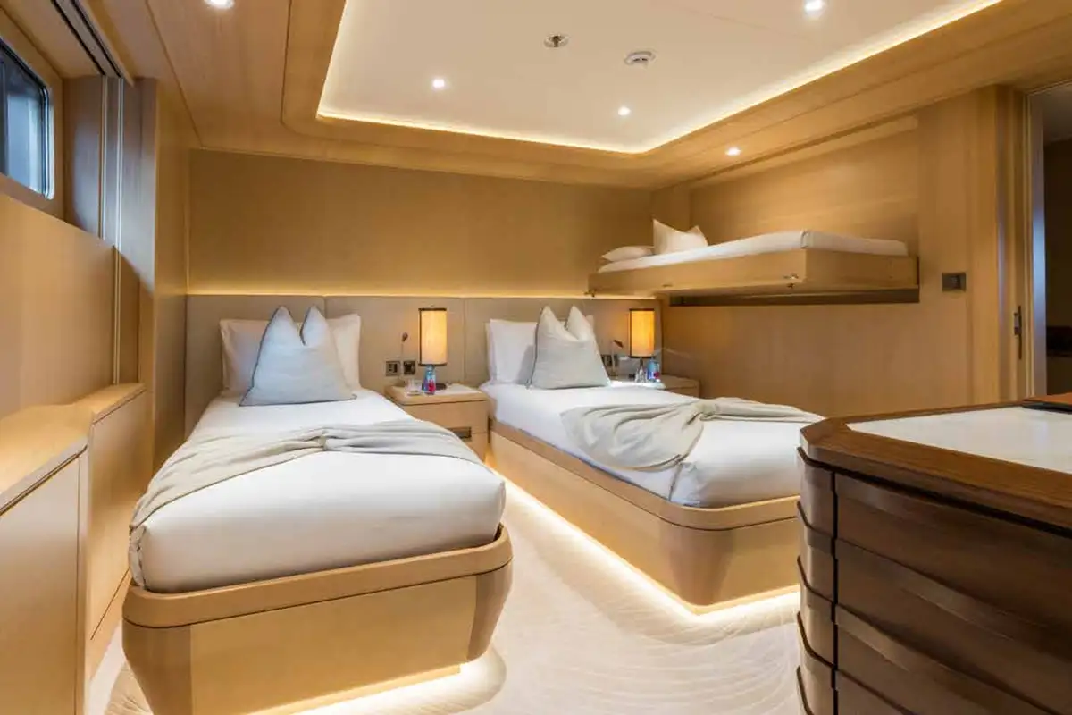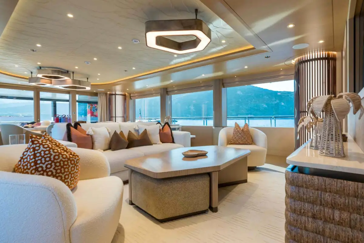 Accommodation for 12 is provided in 6 light-filled staterooms, including a vast principal suite with folding 7-square-metre terrace, a main deck double suite and four additional lower deck cabins with direct access to the beach club with its sauna, ice bath and swim platform. Her 27m sun deck, with its large Jacuzzi, raised foredeck sunbathing area, gym equipment, sheltered bar, cinema screen and extendable dining table for 18 guests is a social space that can host the entire complement of guests, while a Portuguese bridge located forward of the wheelhouse provides seclusion, privacy and stunning ocean vistas.