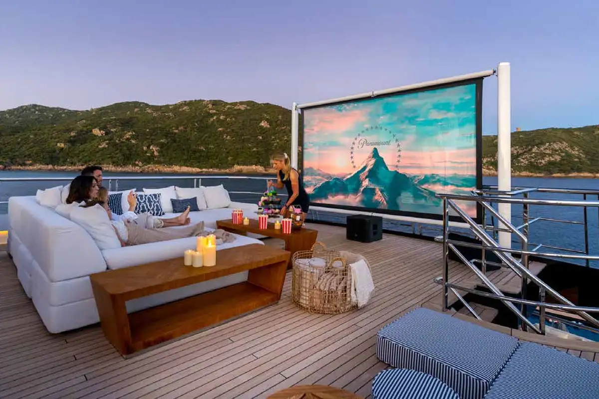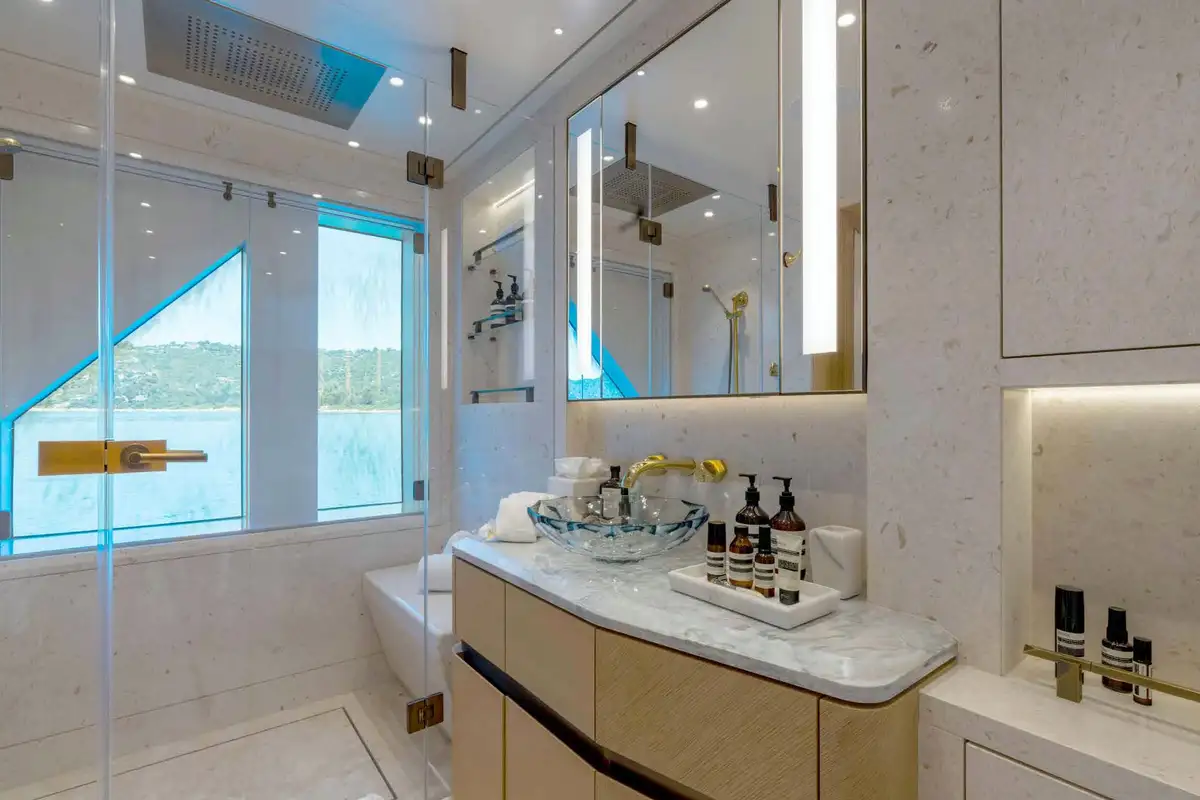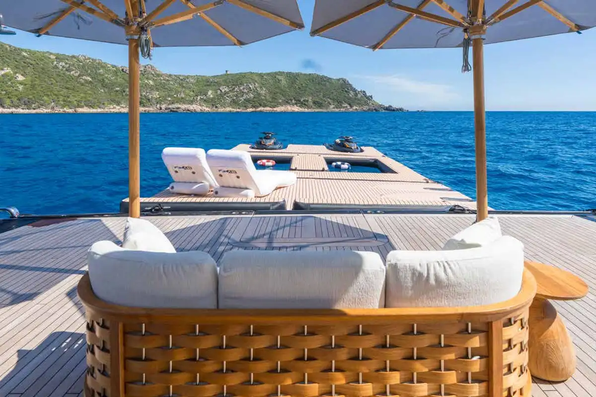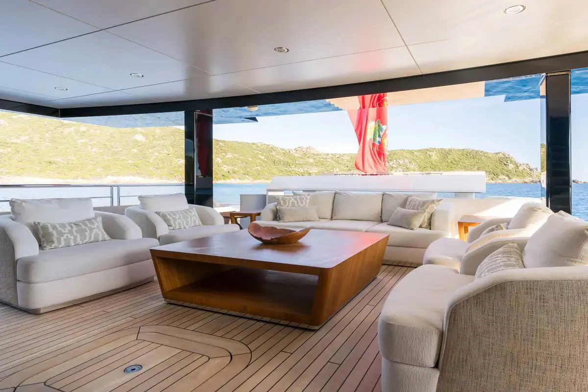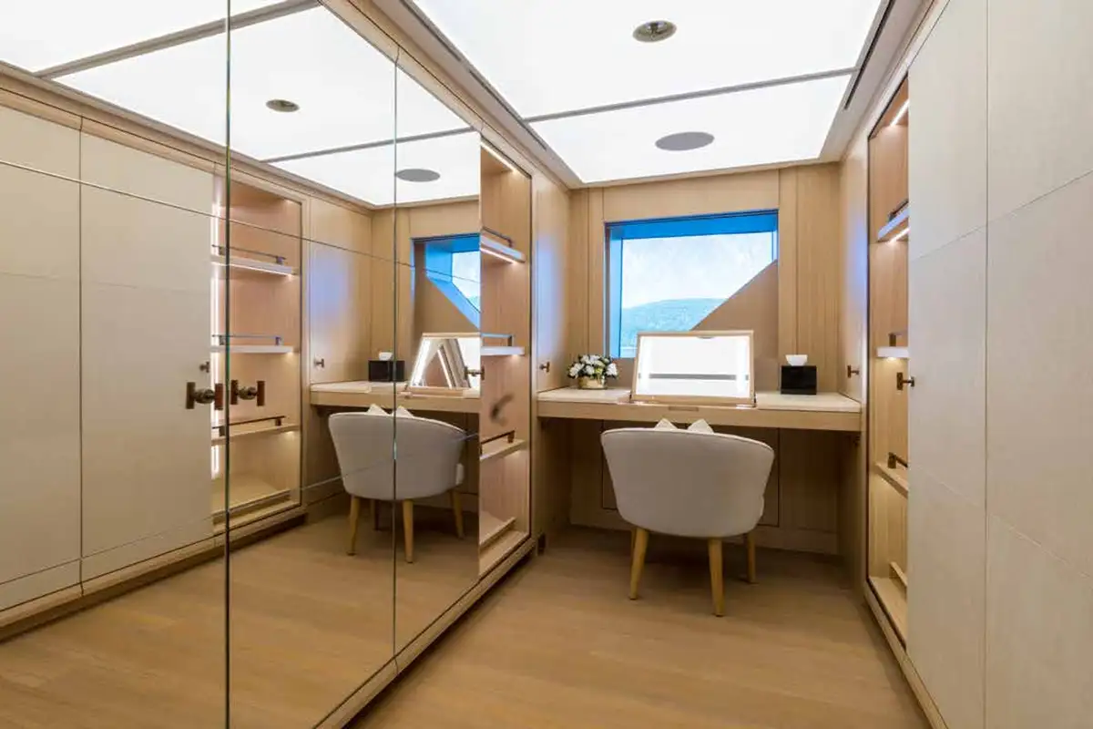 Accommodation for 12 is provided in 6 light-filled staterooms, including a vast principal suite with folding 7-square-metre terrace, a main deck double suite and four additional lower deck cabins with direct access to the beach club with its sauna, ice bath and swim platform. Her 27m sun deck, with its large Jacuzzi, raised foredeck sunbathing area, gym equipment, sheltered bar, cinema screen and extendable dining table for 18 guests is a social space that can host the entire complement of guests, while a Portuguese bridge located forward of the wheelhouse provides seclusion, privacy and stunning ocean vistas.