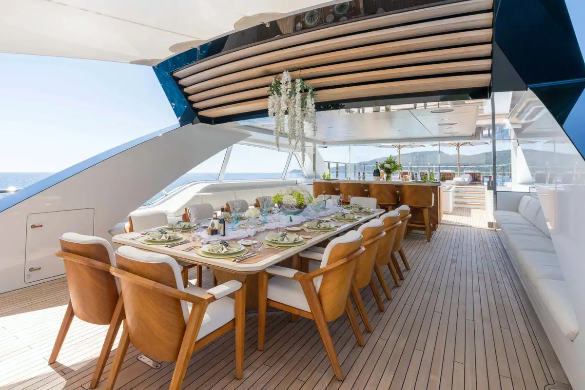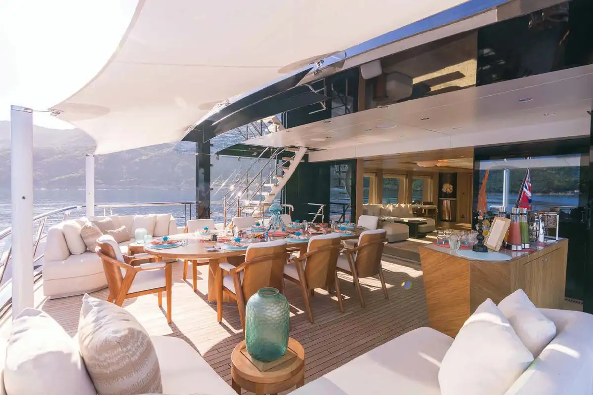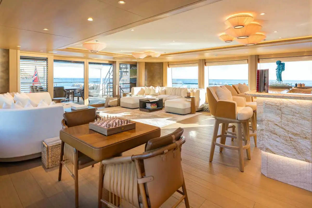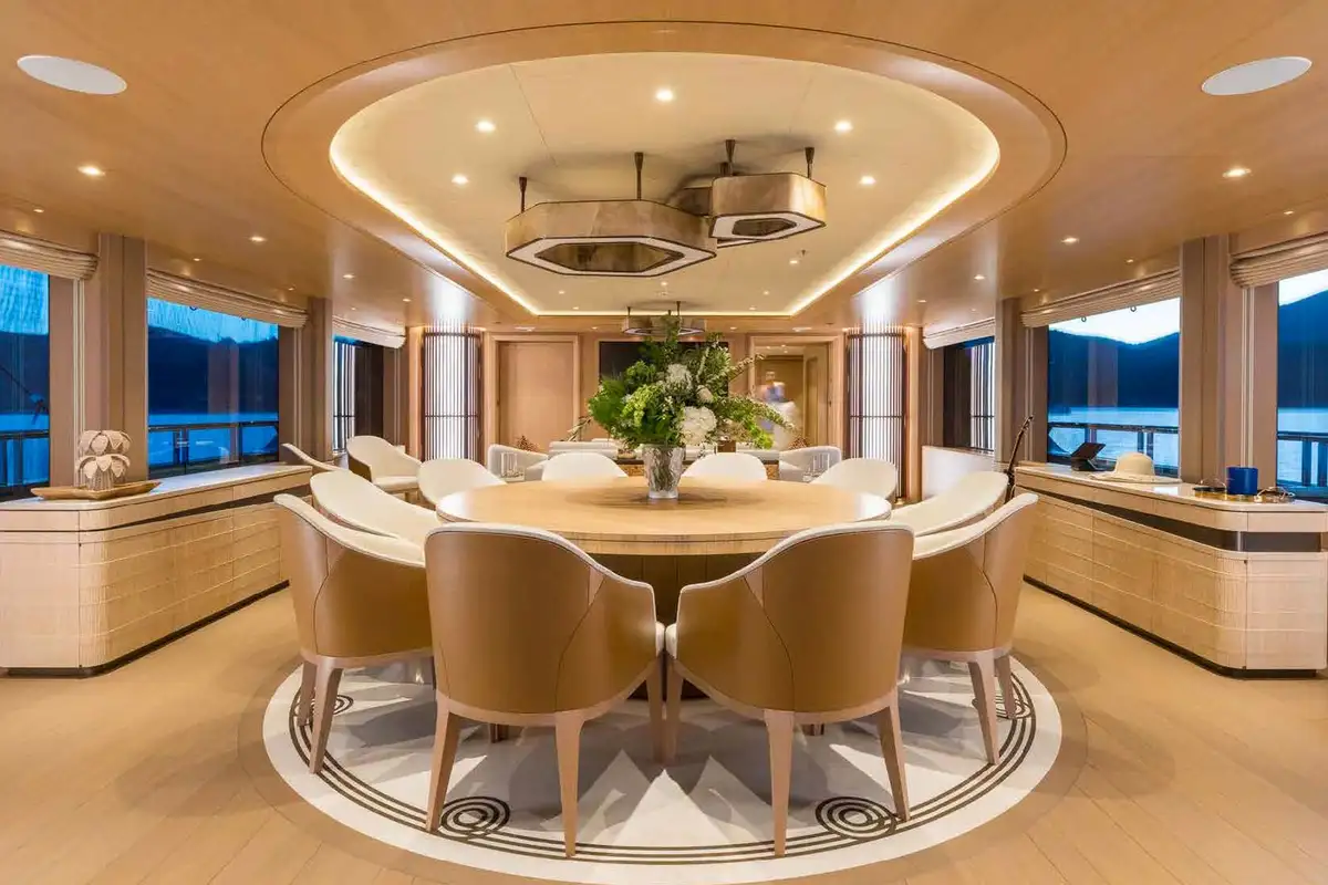 Custom interiors from London studio Winch Design capture all the comfort of a relaxed family home on the water. In keeping with the name of the yacht, convivial spaces – all flooded with light through the yacht’s striking trapezoid windows and connected by a magnificent central staircase - provide the perfect backdrop for any social occasion, whether it’s pre-dinner drinks in the sky lounge or a formal meal enjoyed at the main salon’s round table.