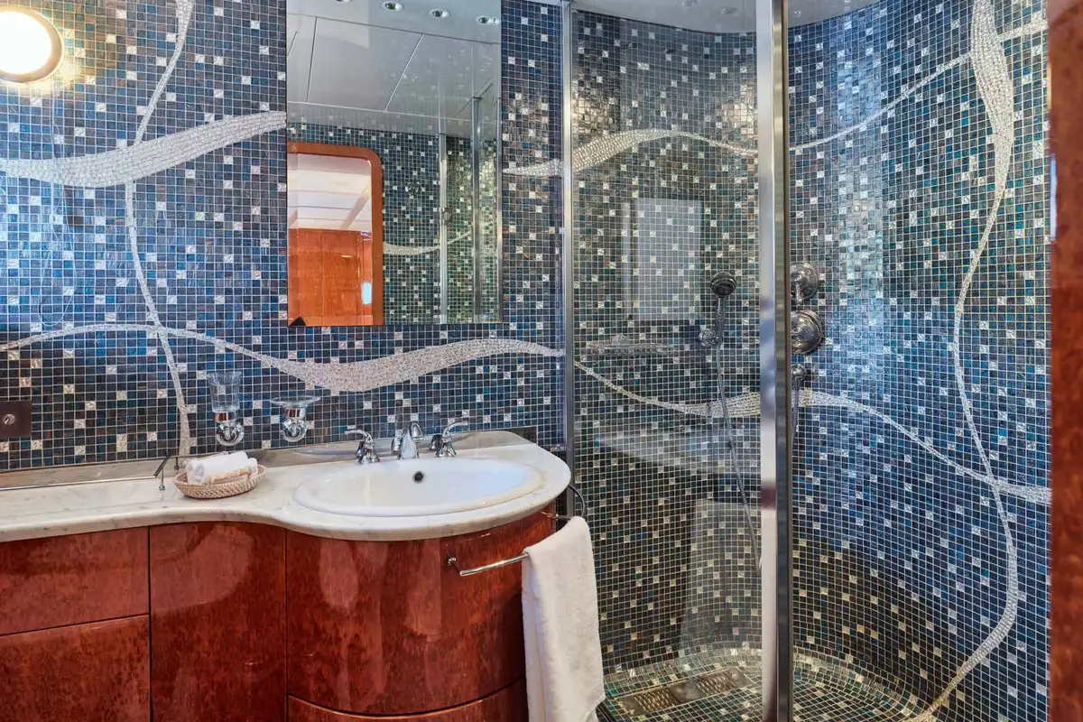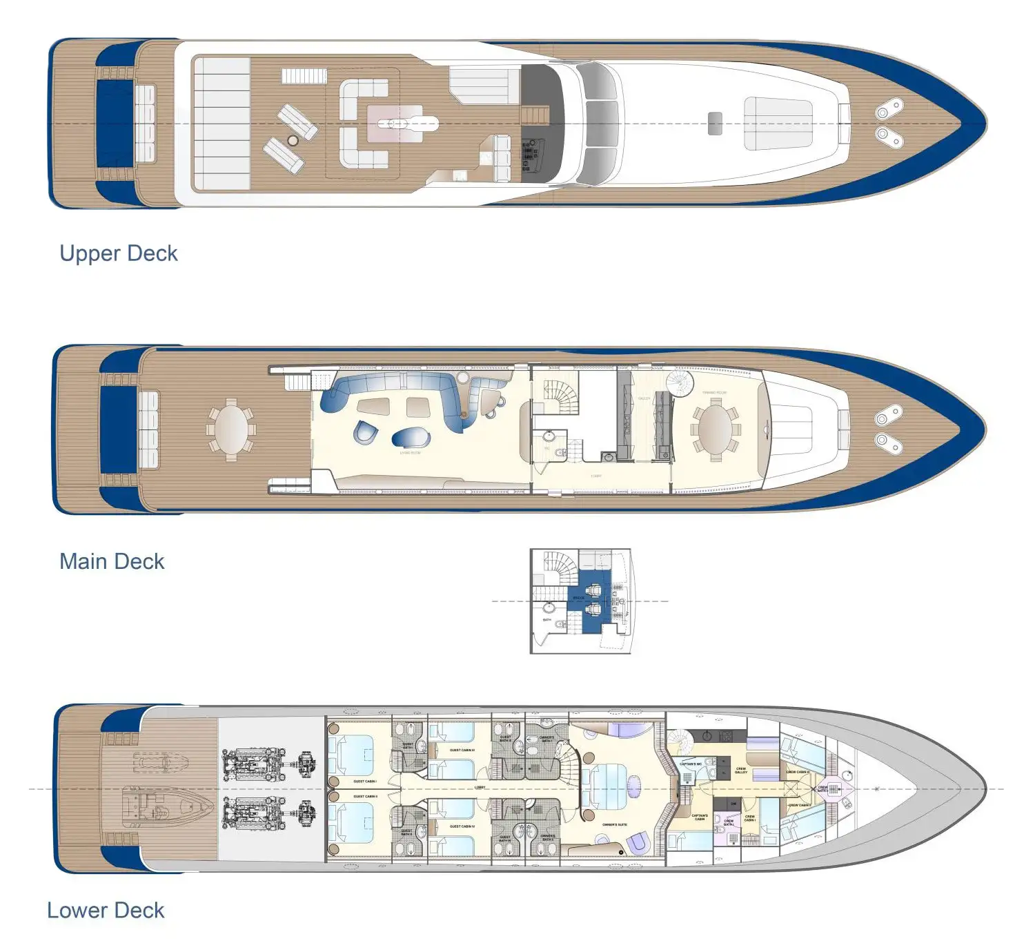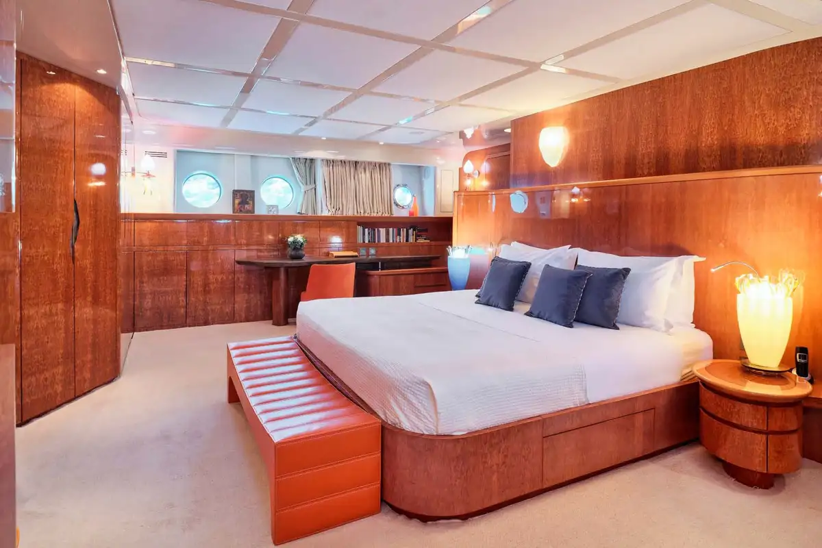 On the lower deck, you’ll discover the sumptuous guest suites, meticulously prepared to cater for you and your guests. Comfort and style run throughout the accommodation. There are two lavish double suites aft, while centrally located are two twin-berth cabins. Each suite features stylish en suite bathrooms. The pick of the accommodation is the full-beam master suite. Positioned ahead of the guest quarters, this relaxing area features a desk, a plush sofa, and his and hers en suite bathrooms.