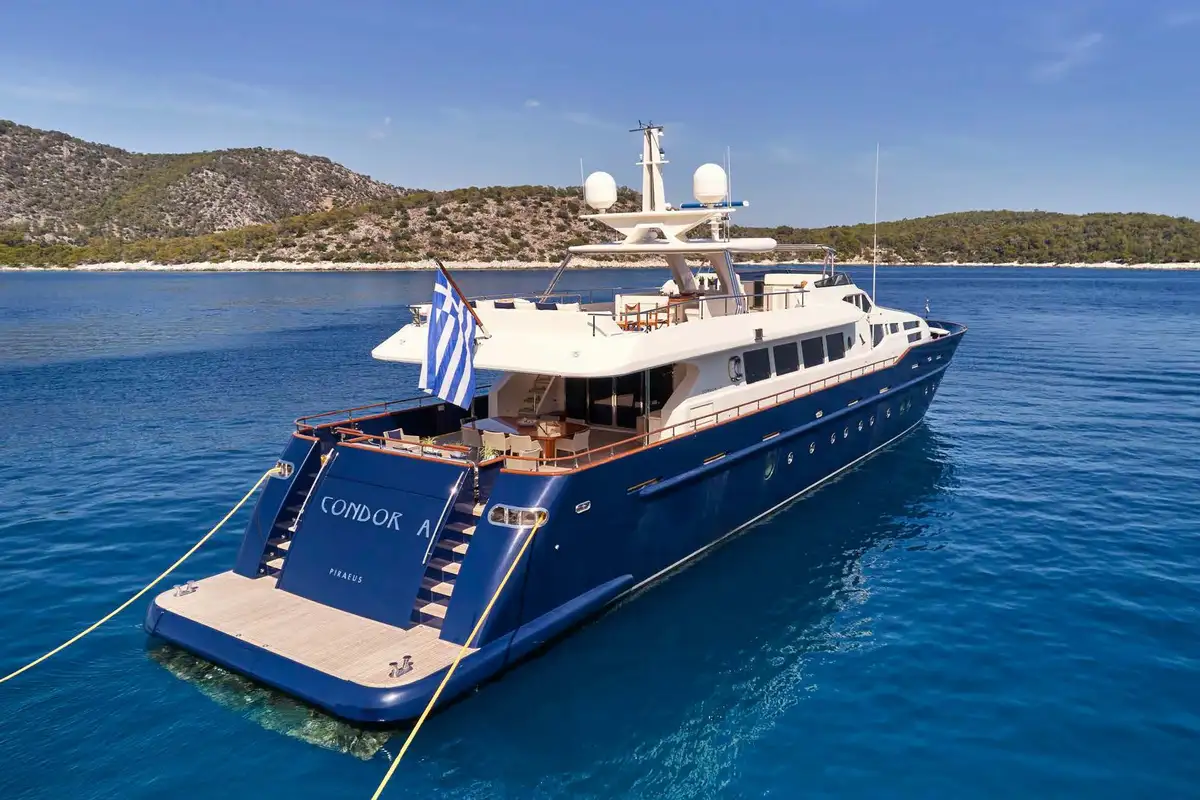 Embark on a refined escape aboard CONDOR A, a beautifully presented three-deck planing yacht. Boasting a refined elegance, she can cruise effortlessly at around 20 knots. This helps you get more from your holiday by expanding your cruising grounds and enabling you to explore more of the beautiful and varied coastline.