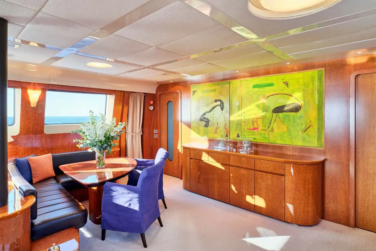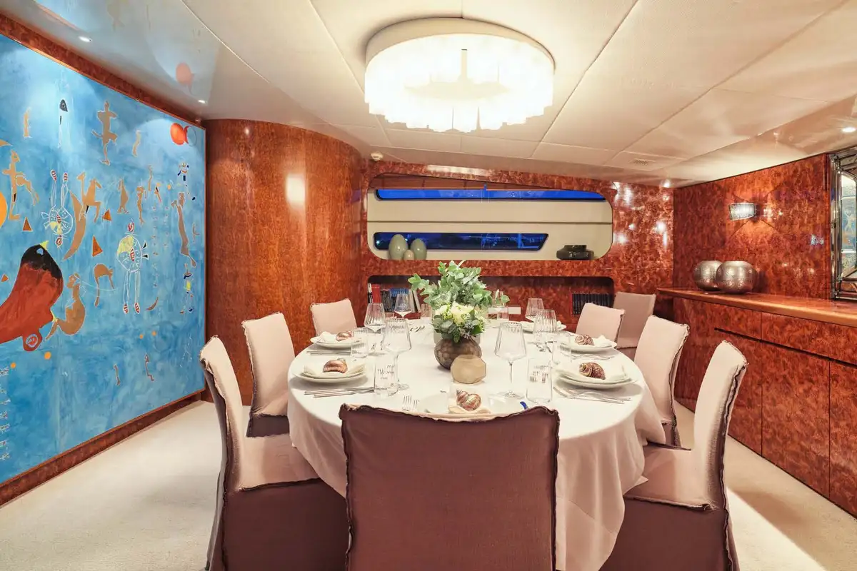 As you ascend to the main deck, you’ll be greeted by an al fresco dining area in the cockpit, and expansive aft deck seating. Step inside the main saloon, a spacious haven with a large L-shaped sofa and freestanding armchairs. Ahead is a dinette for games, snacks or just to wait for your guest to appear from the lower deck. Forward of the saloon, a formal dining area awaits, the rich burr woodwork creates an atmosphere of refined sophistication.