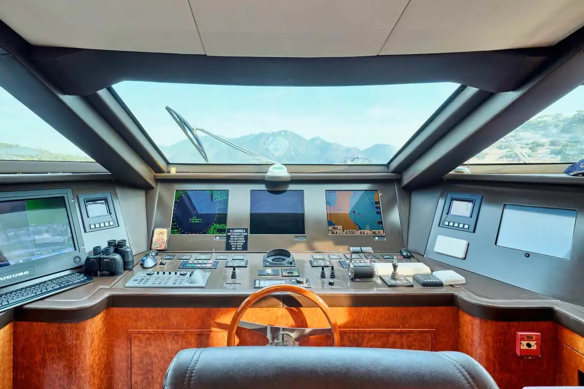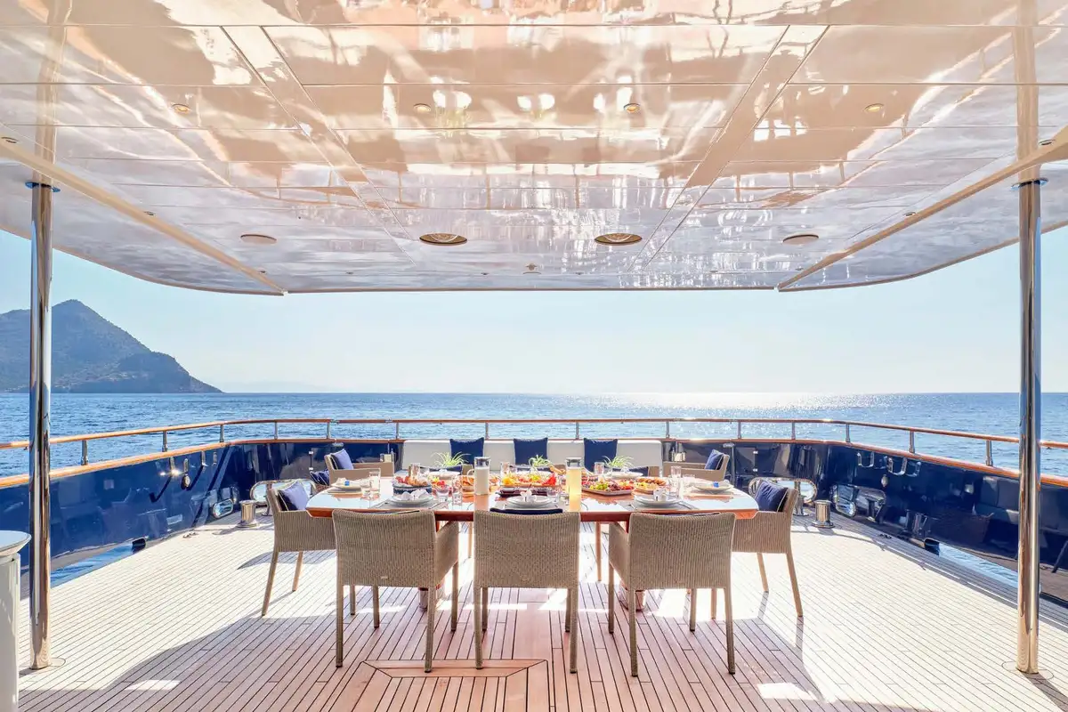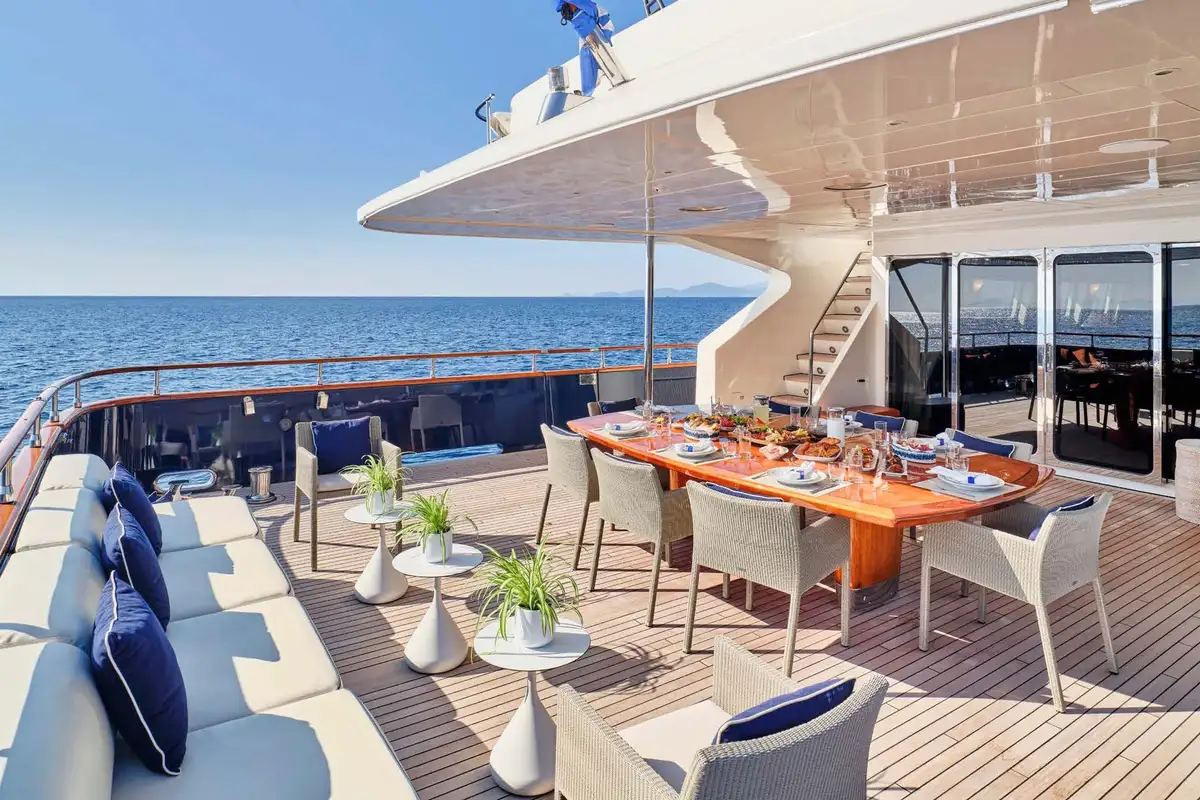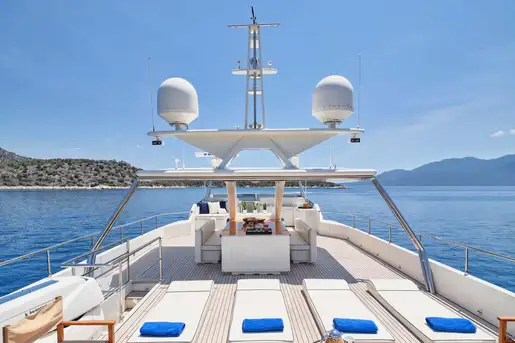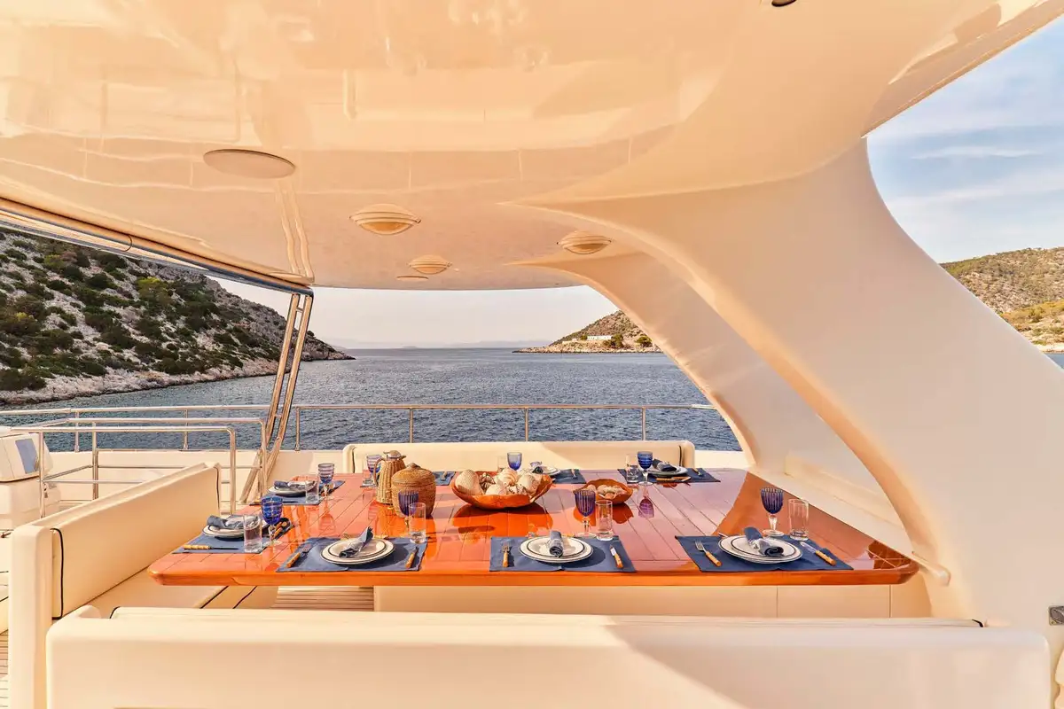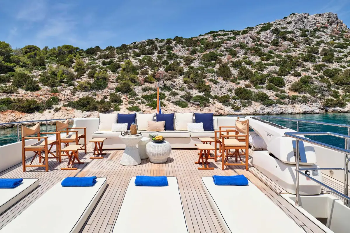 On deck, the sun deck, invites you and your guests to revel in the open air. A central al fresco dining area sets the stage for breakfast, lunch or dinner experiences, while forward-facing seating at the flybridge provides panoramic views of your surroundings. To the rear, low-level sun loungers beckon, offering a luxurious space to bask in the sun's warmth.