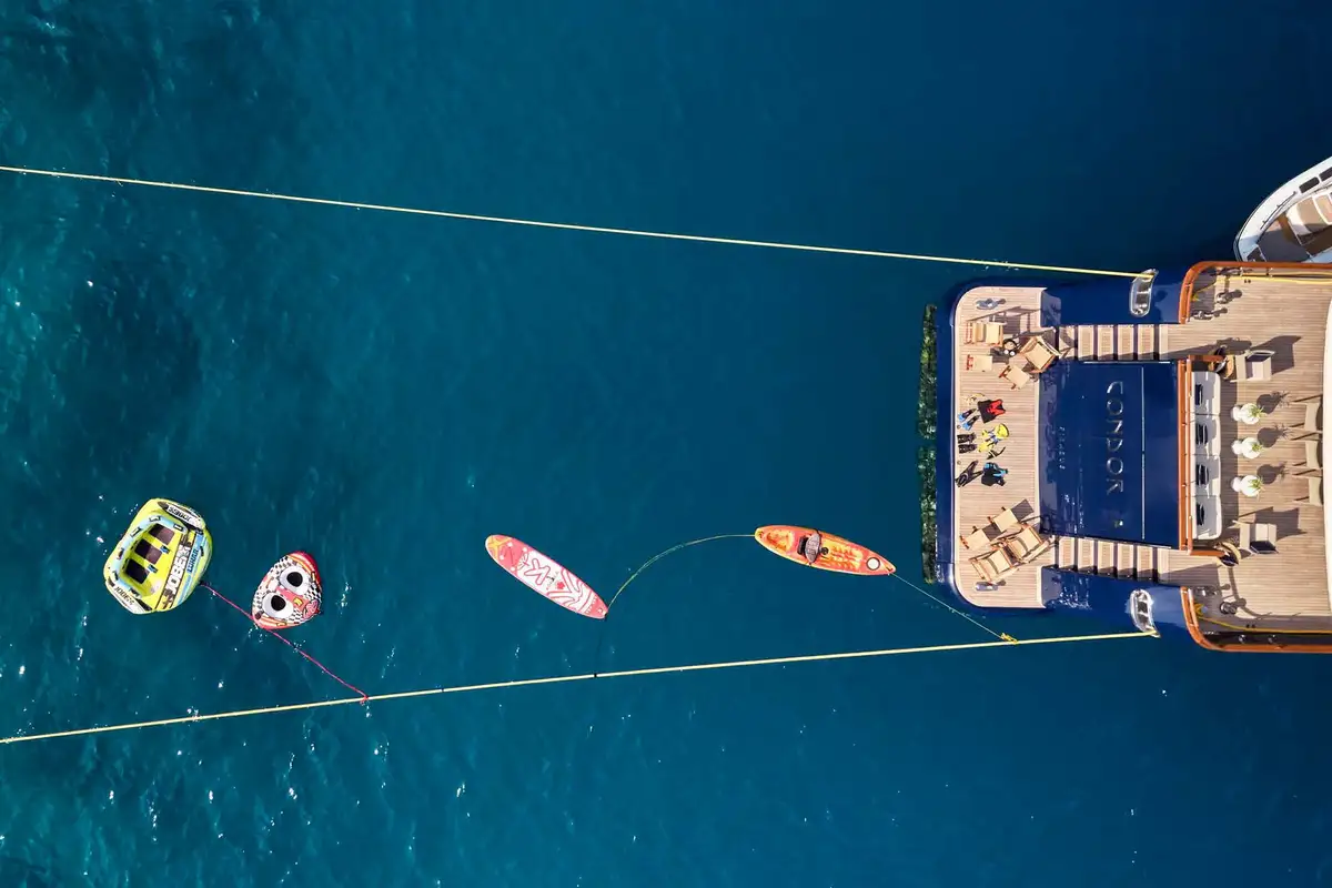 CONDOR A offers more than just wonderful living spaces; she has a tender garage with a fine collection of water sports equipment to enhance your time on board.