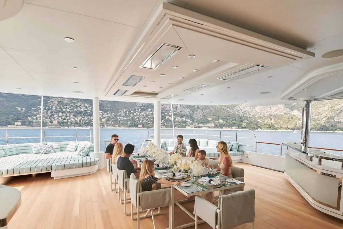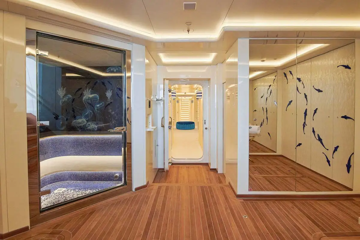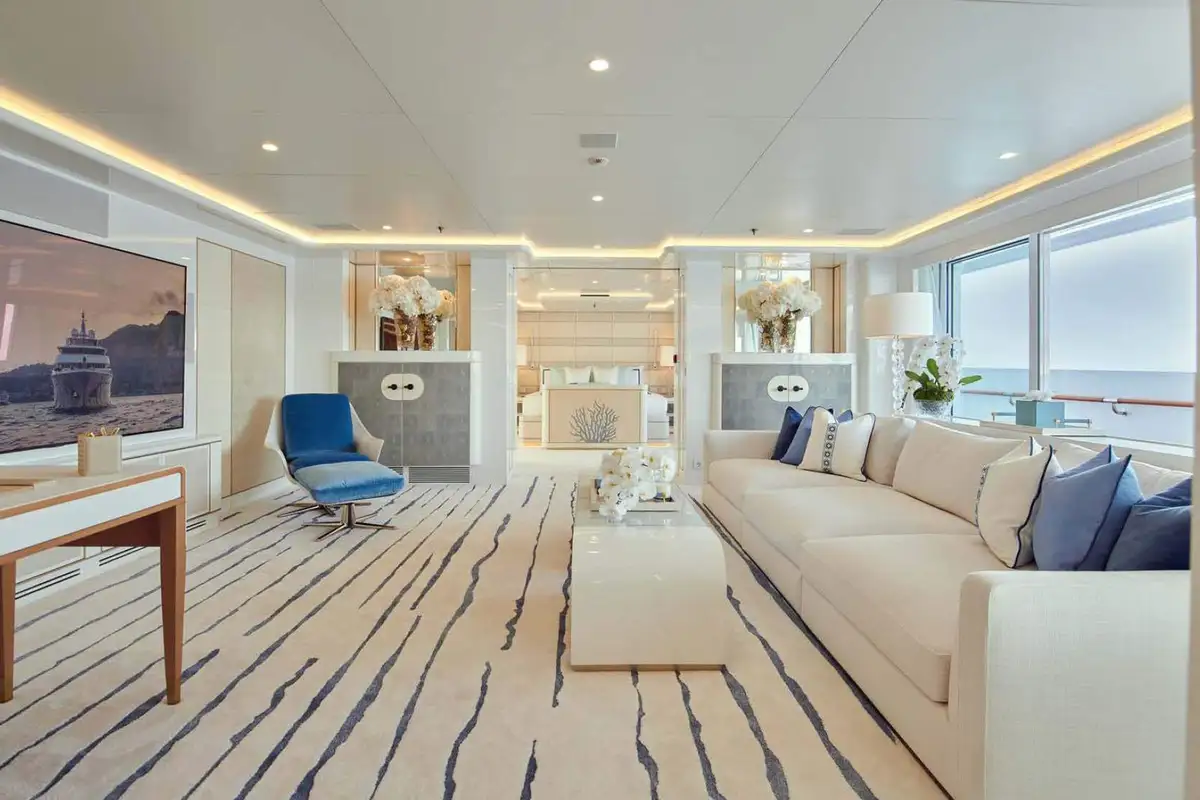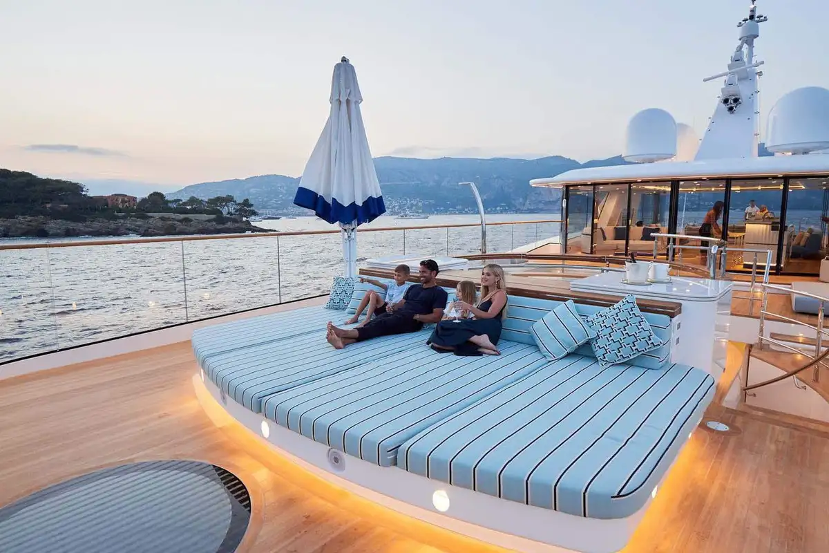 With direct access from the lower deck guest suites, the gym and spa complex- complete with steam room- leads to the swim platform and beach club. The vast sun deck with pool is surrounded by extensive seating and a bar.