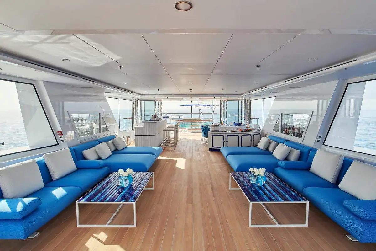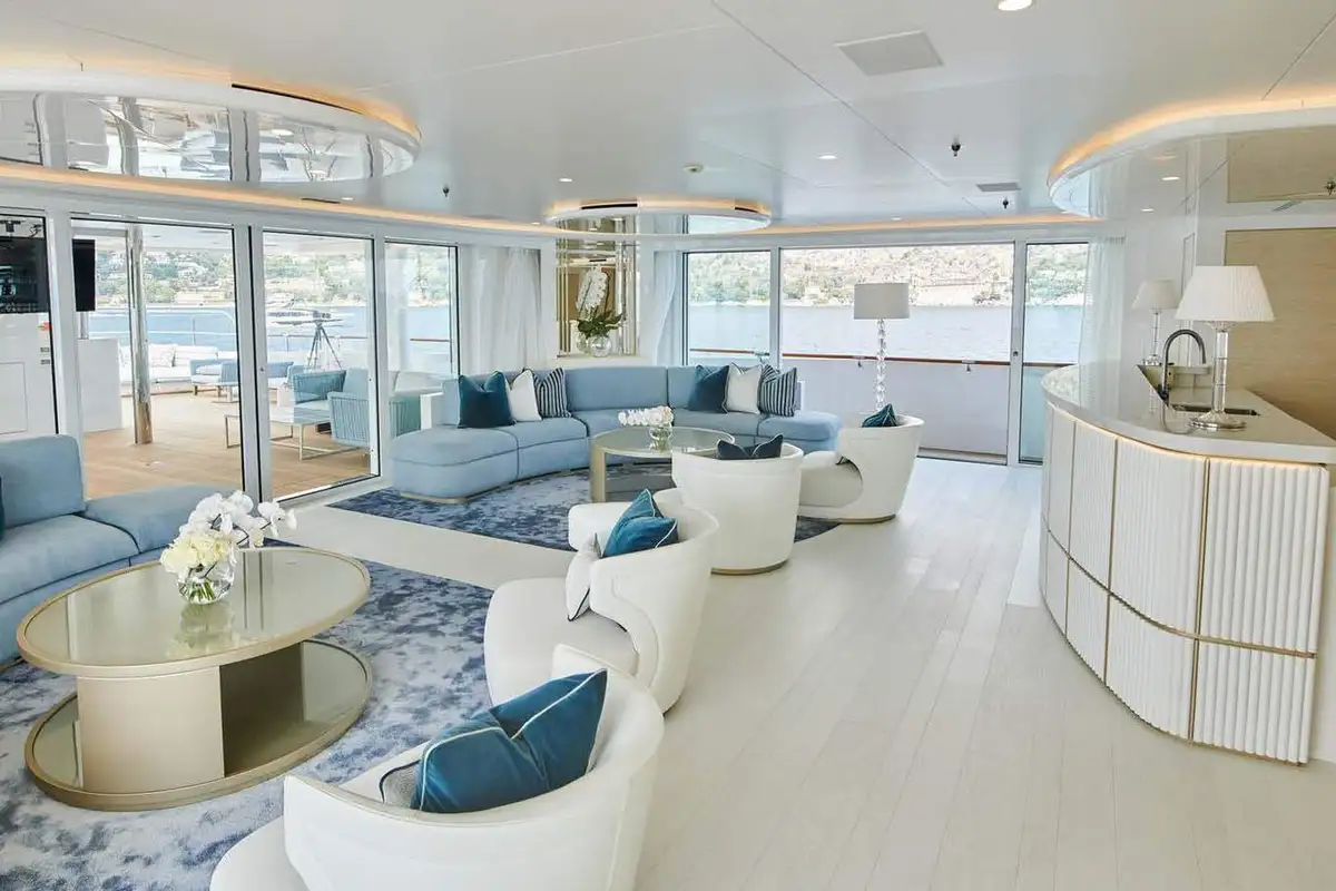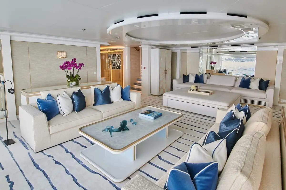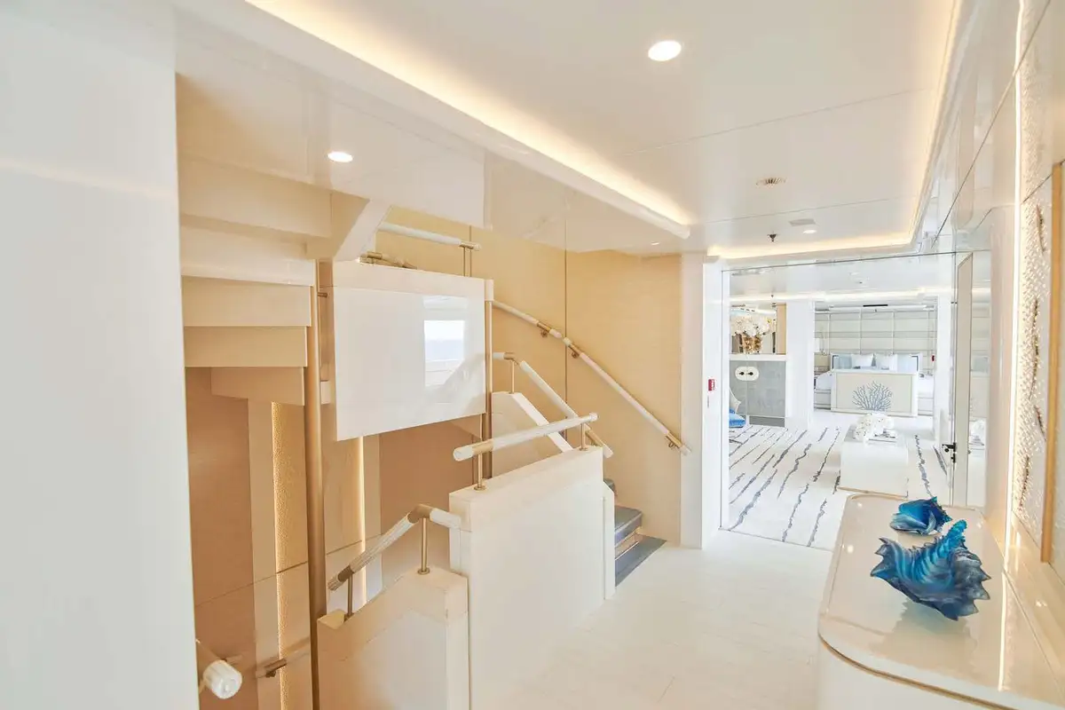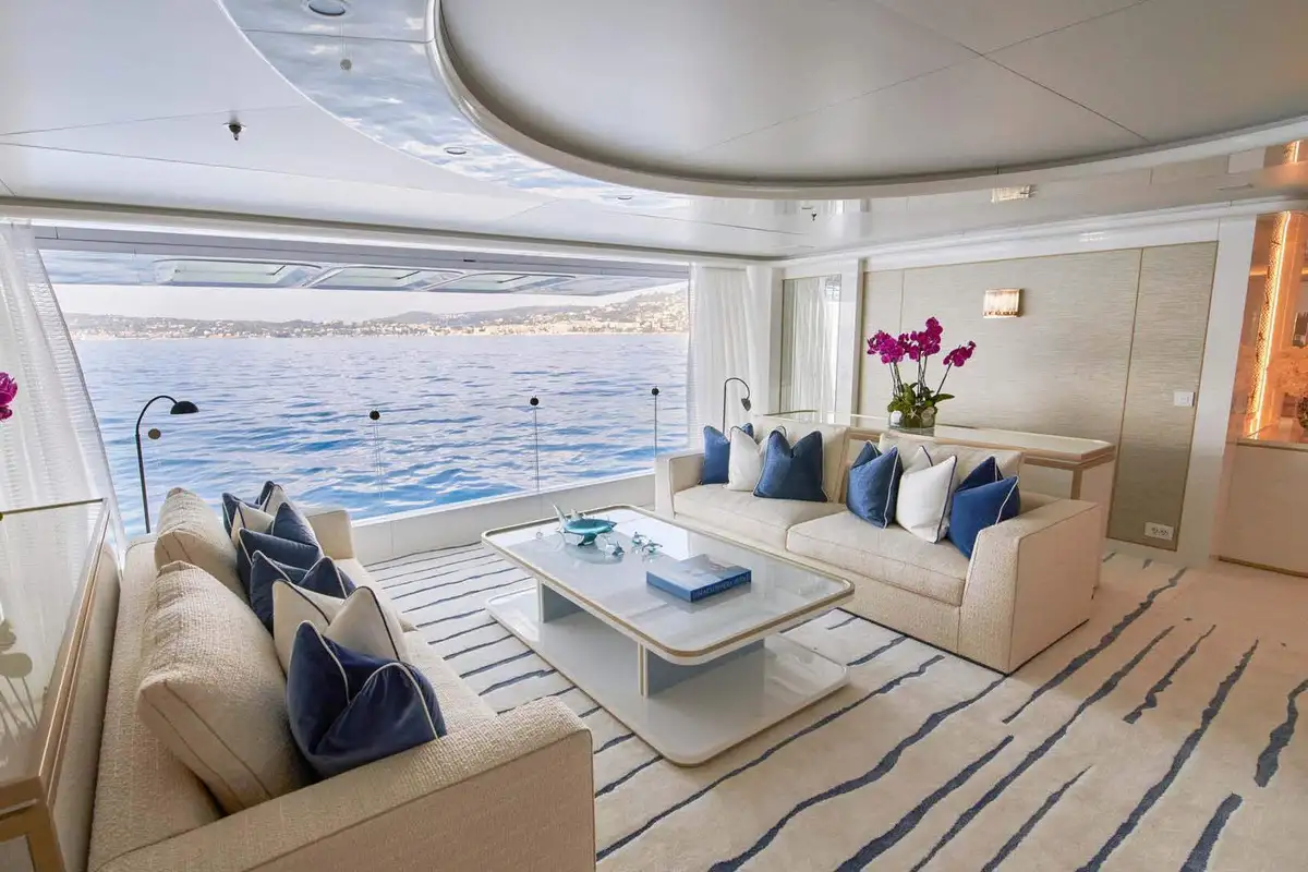With direct access from the lower deck guest suites, the gym and spa complex- complete with steam room- leads to the swim platform and beach club. The vast sun deck with pool is surrounded by extensive seating and a bar.