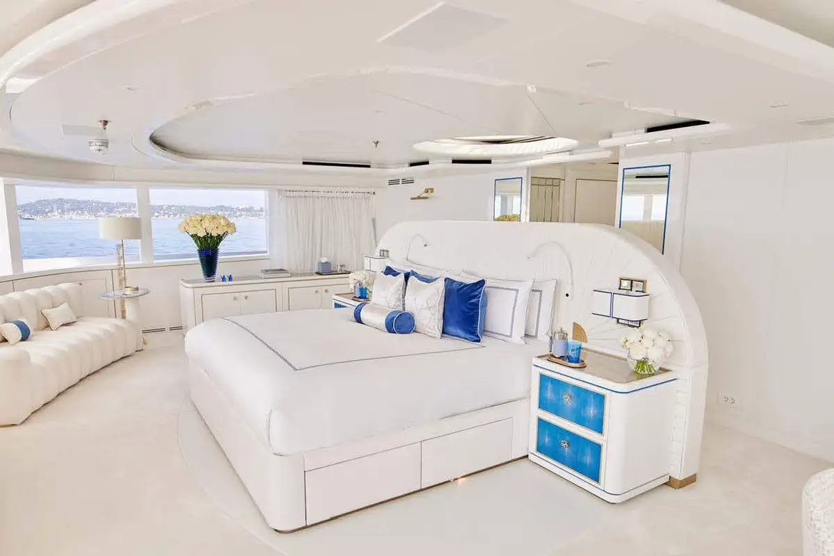 A neutral palette of creams and browns create a calming interior ambience and the owner's suite takes pride of place on the top deck, extending down to the upper deck. The owner's top deck sleeping area offers panoramic views forward.