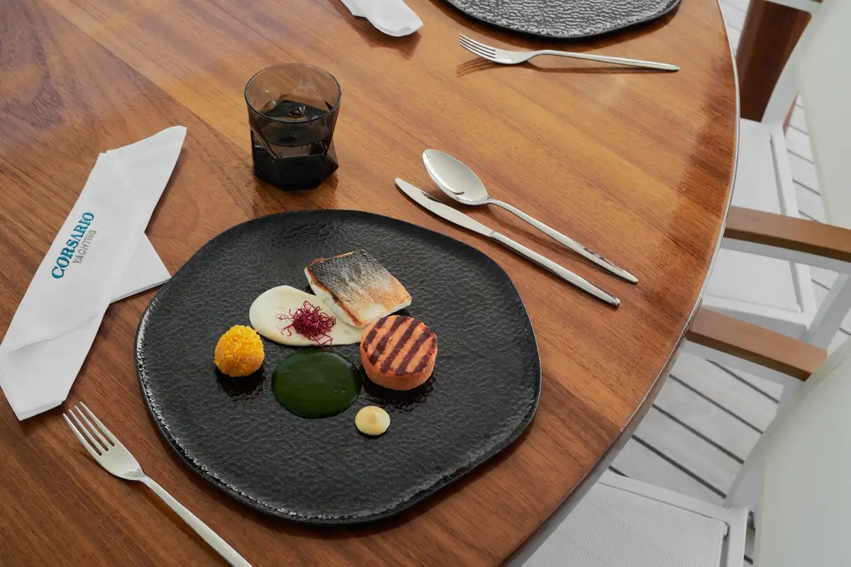 It’s in CORSARIO ‘s gorgeous saloon where you’ll find the formal dining area – there is an al fresco dining area in the cockpit too. Whichever area you choose, CORSARIO’s highly trained chef will delight you and your party with many memorable dining experiences while you’re on board.
