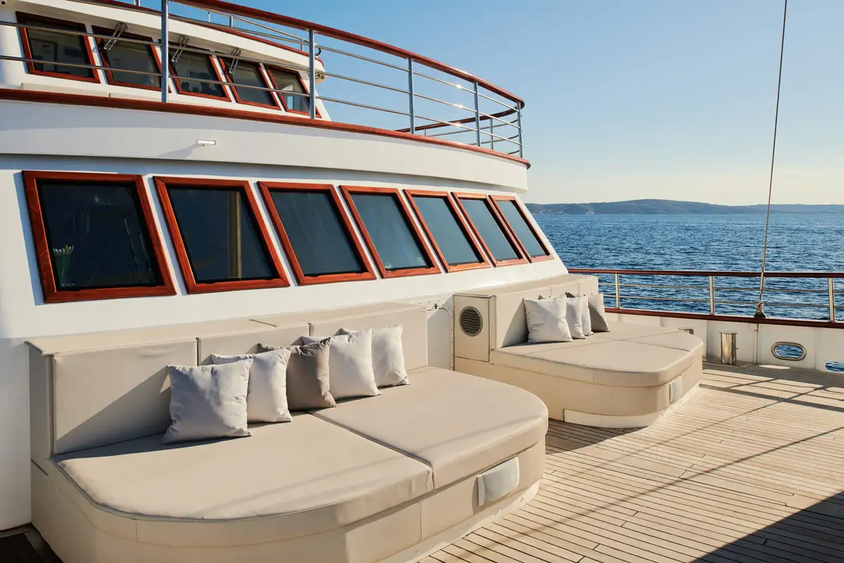 Crafted in 2019, CORSARIO’s traditional design offers numerous wonderful guest areas to help you all relax. On deck, there are large sun pads and social seating areas, but the focal point is the upper deck. It has a jacuzzi, a Finnish sauna and a huge aft deck sun pad space. High above the water, this deck gives everyone an elevated vista and affords you greater privacy.