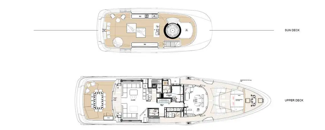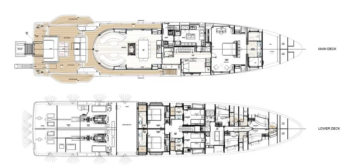 If you and your guests like to spend time outside, this is a yacht designed just for you. From main and upper decks, you can reach the foredeck sun lounge, which is a great place to spend some private time when you’re in port moored stern to the quay. If you want to dine surrounded by the sights, sounds and scents of your anchorage, the upper deck aft is where you can enjoy al fresco dining at its best.