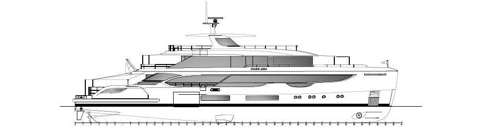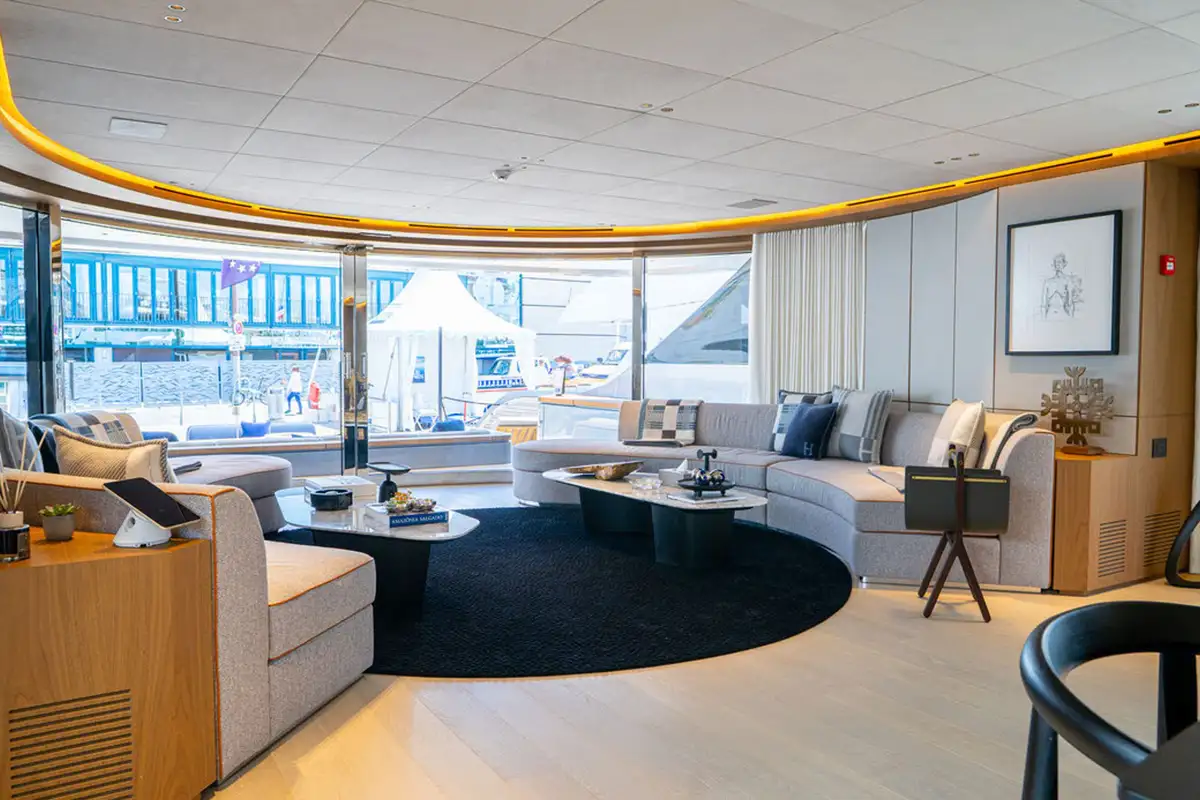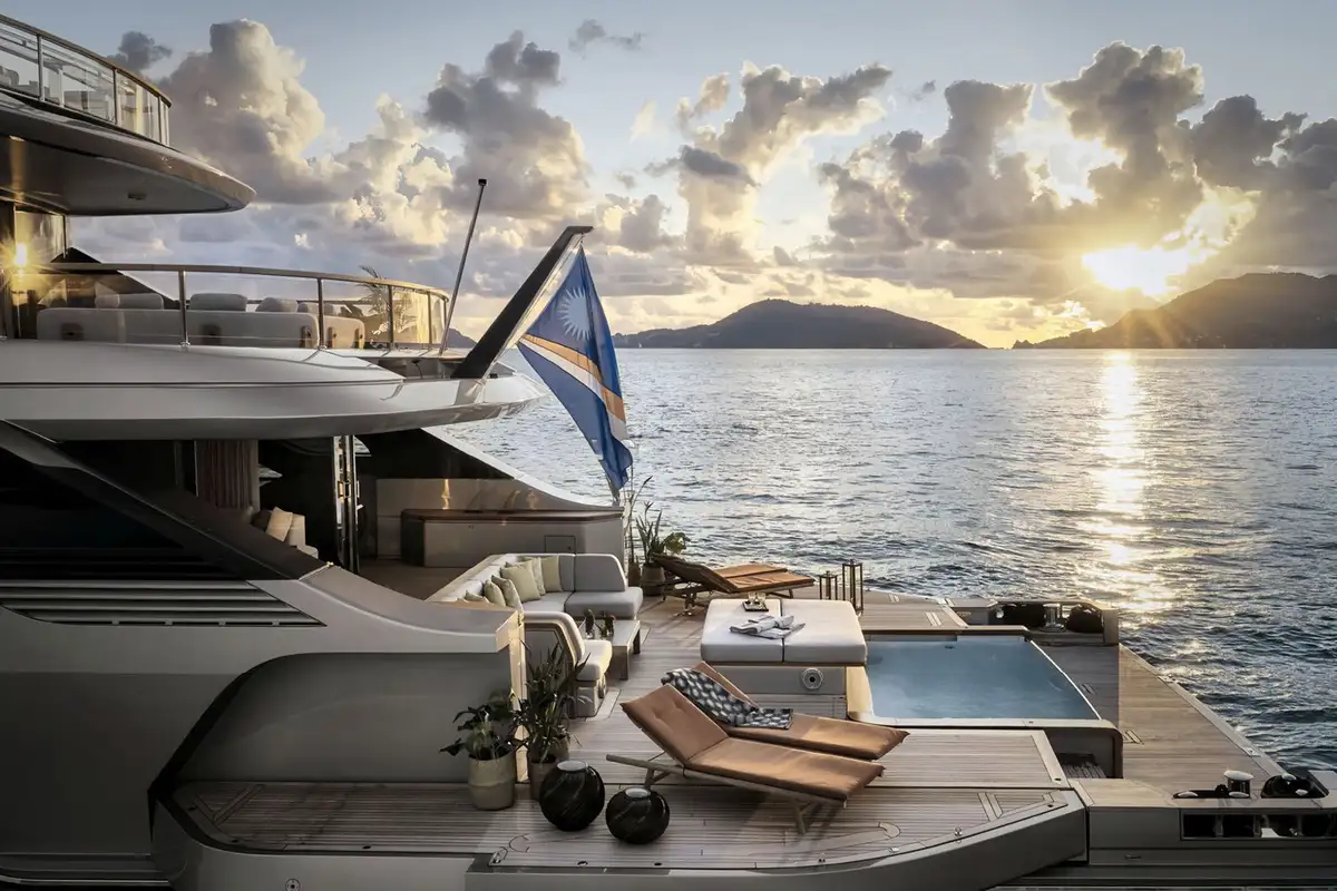 The feature that blows everyone’s minds is the beach club, the ‘oasis’ that gave the range its name. The sides of the hull fold down to create a huge 90sqm sea terrace with uninterrupted views and an infinity pool at its heart.