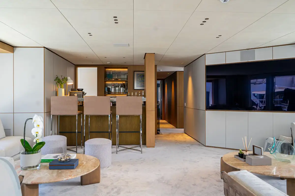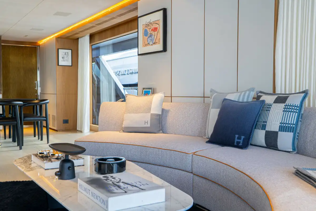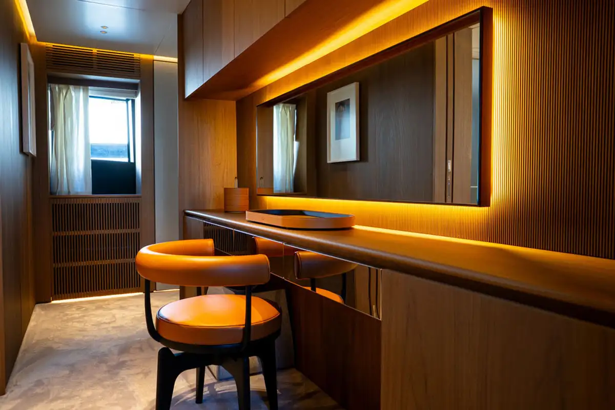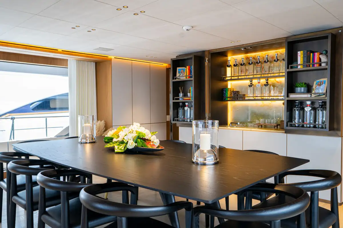 This is also where the crew will help you and your guests make the very most of COSMICO’s impressive toy selection. It’s also where you arrive on and leave the yacht for trips ashore in the bran- new Fjord chase tender.