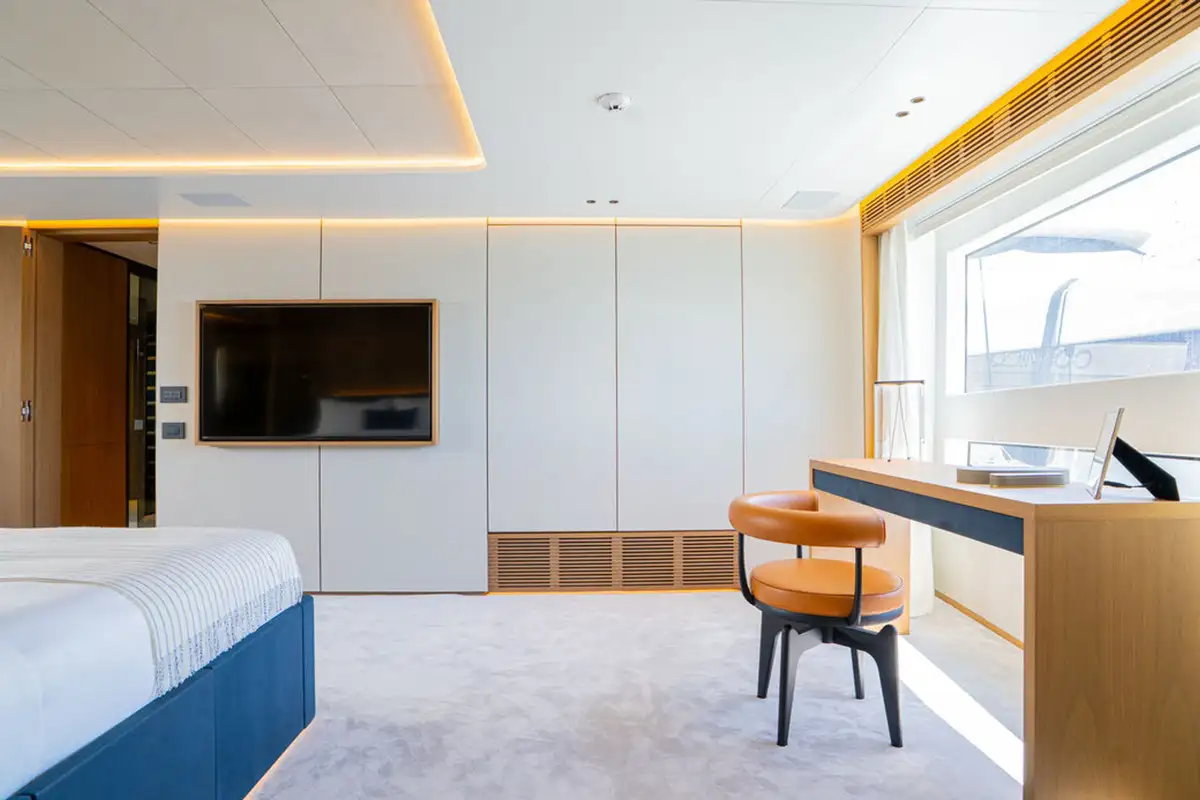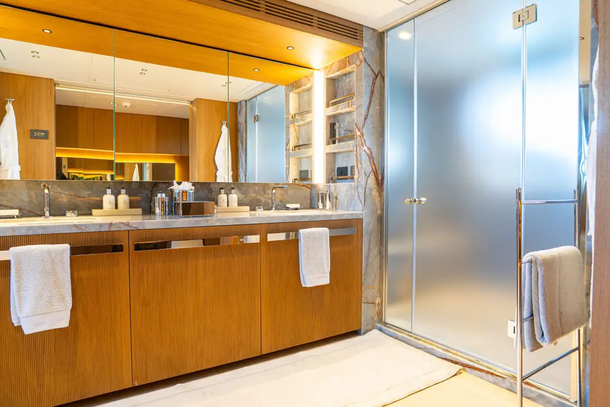 The master suite, forward on the main deck, has huge picture windows either side, and you can enjoy the views from the vanity table to port or the armchair seating to starboard, perfect for waking up to the day with your morning coffee. Forward, you’ll find your en suite with twin basins and a large shower room.