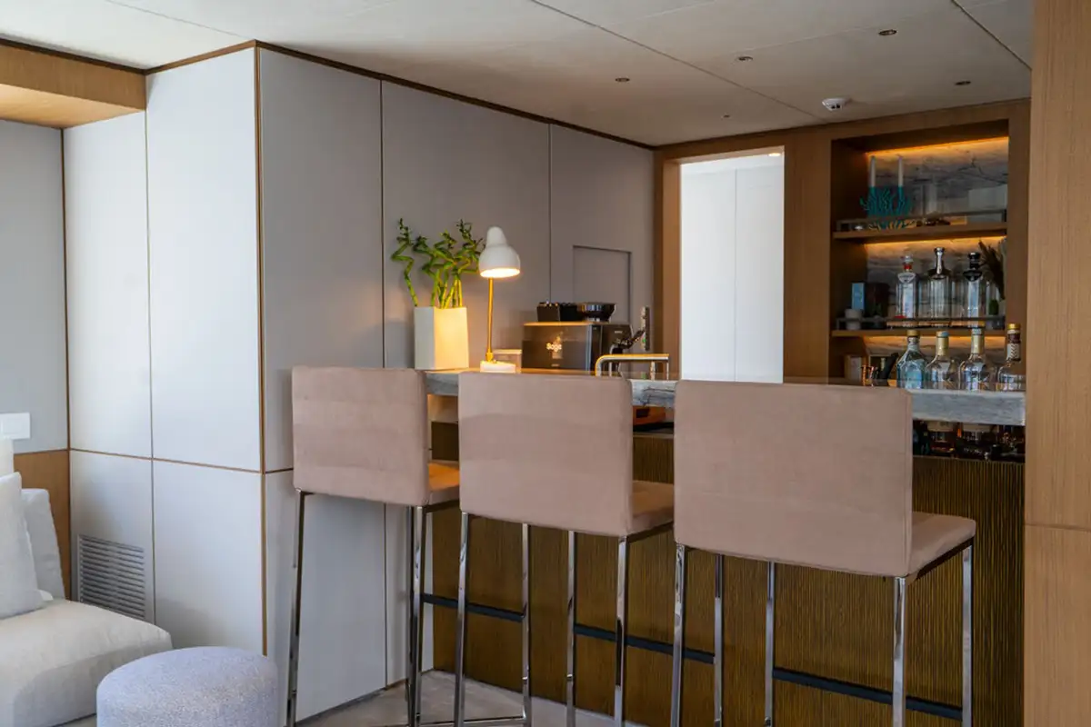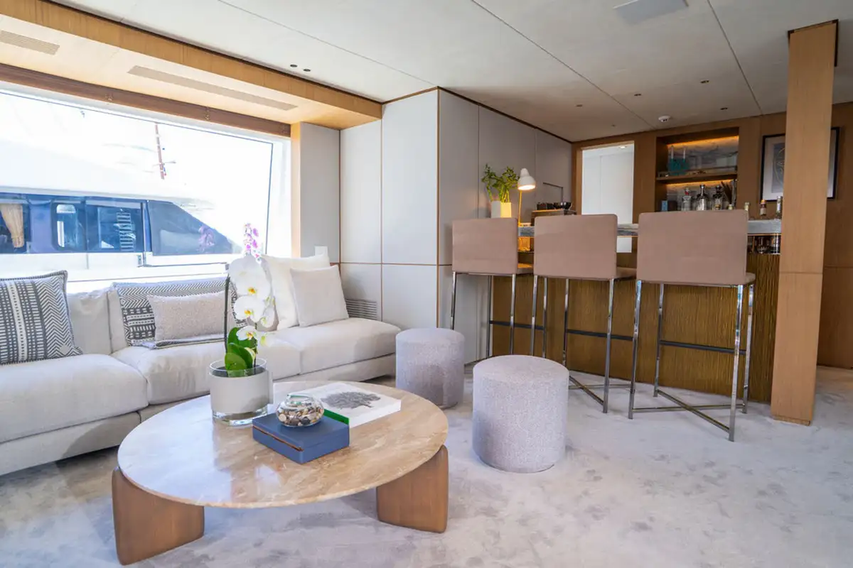 Up on the sundeck you can watch the sun set while enjoying a soothing soak in the jacuzzi with a drink from the sundeck bar, listen to the sounds of the sea as you relax on the daybeds shaded by the hardtop or take to the bar stool aft to enjoy the views.