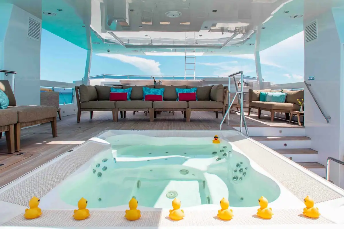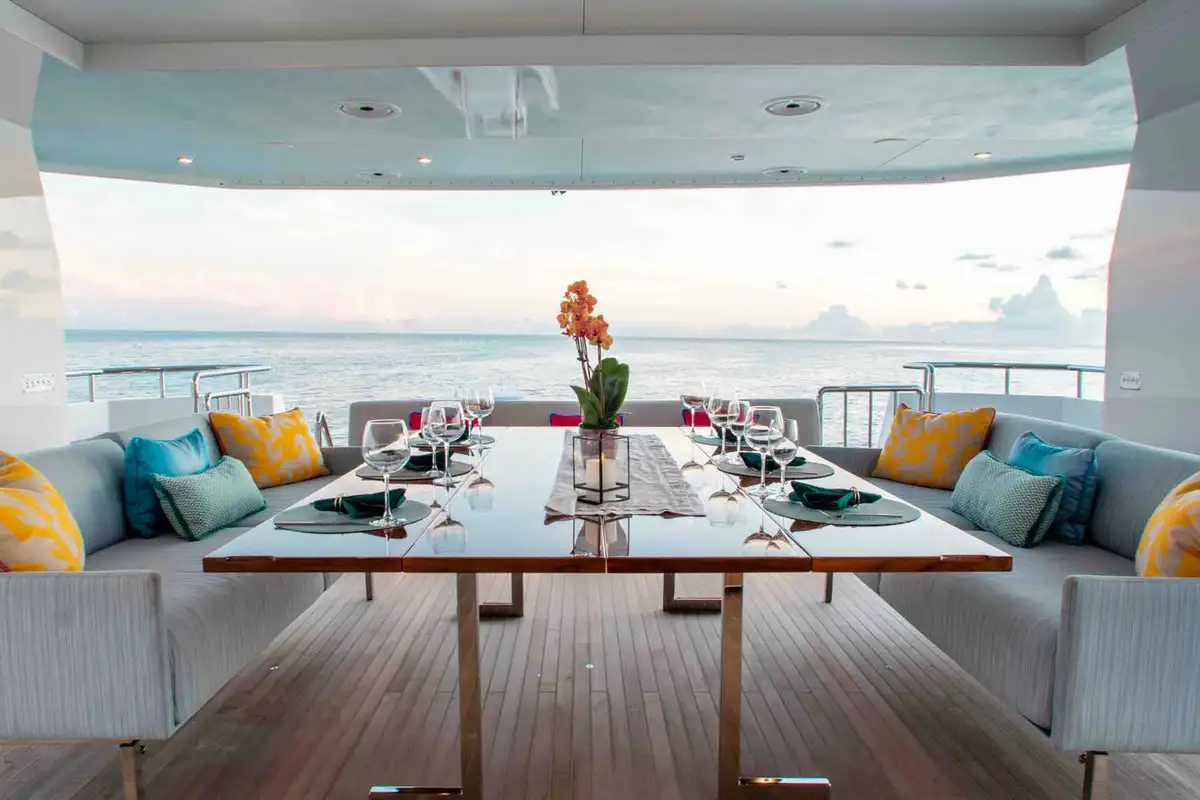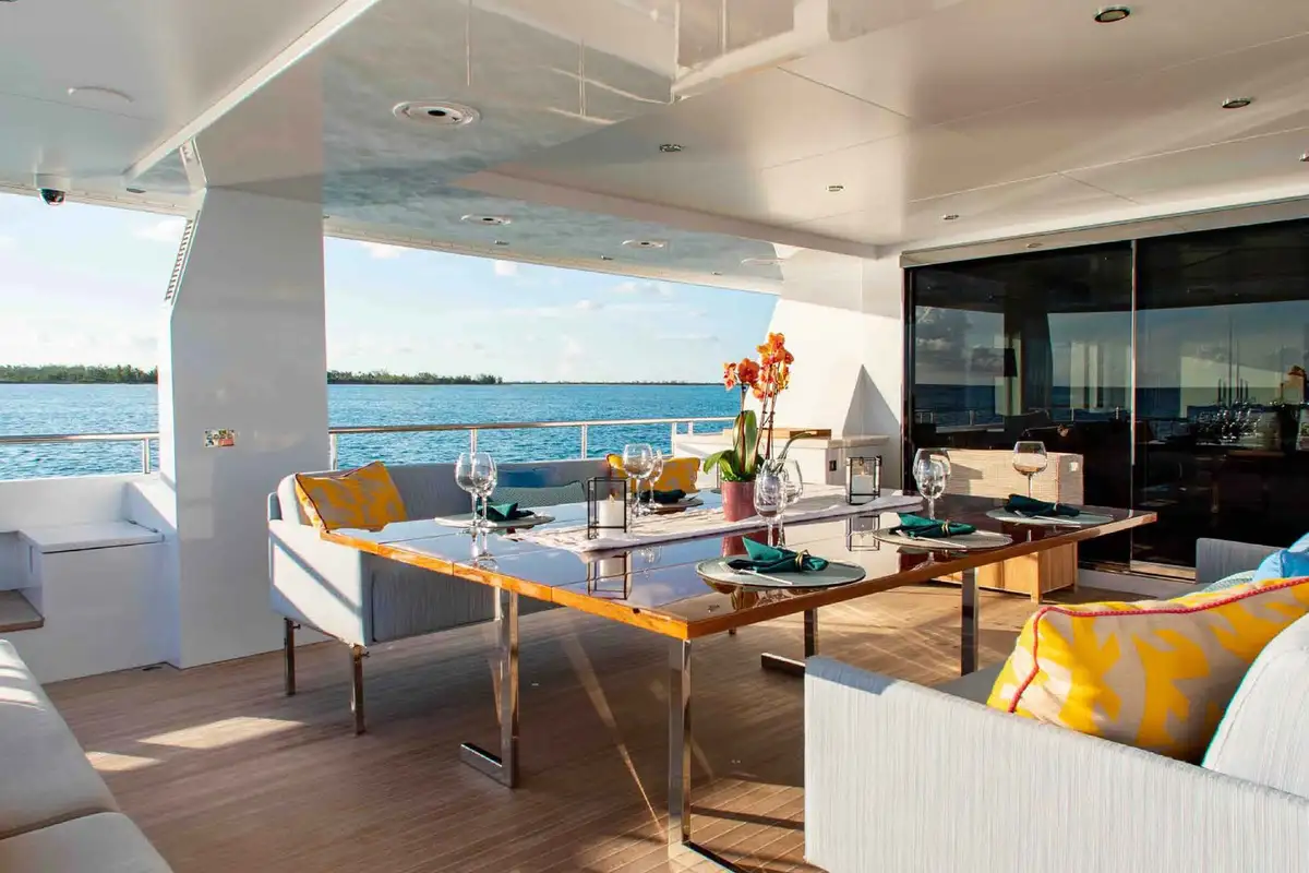 The aft part of the sun deck features a jacuzzi and ample space around with sun pads. The lounge at the amidships area can be accessed by the steps and offers either shade or sun and the side decks provide access to the forward alfresco dining table followed by a large sun pad and more relaxing seating areas.