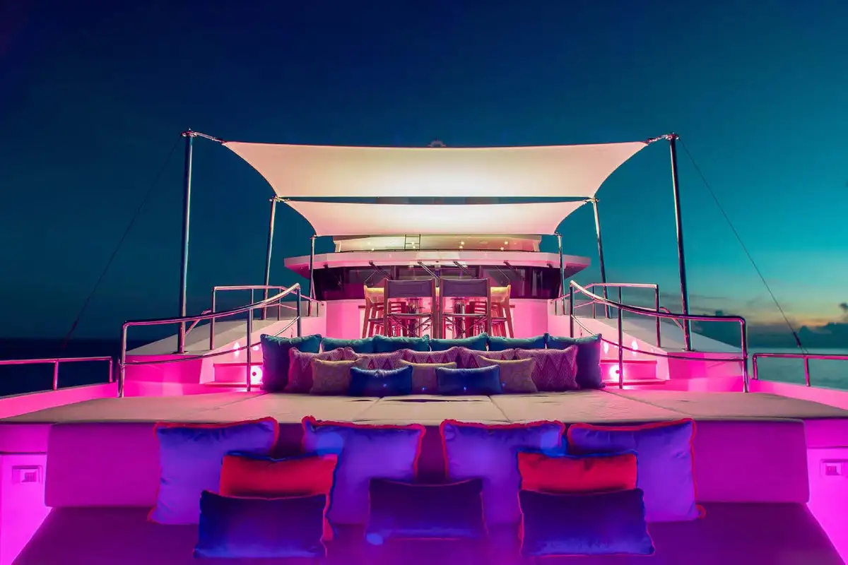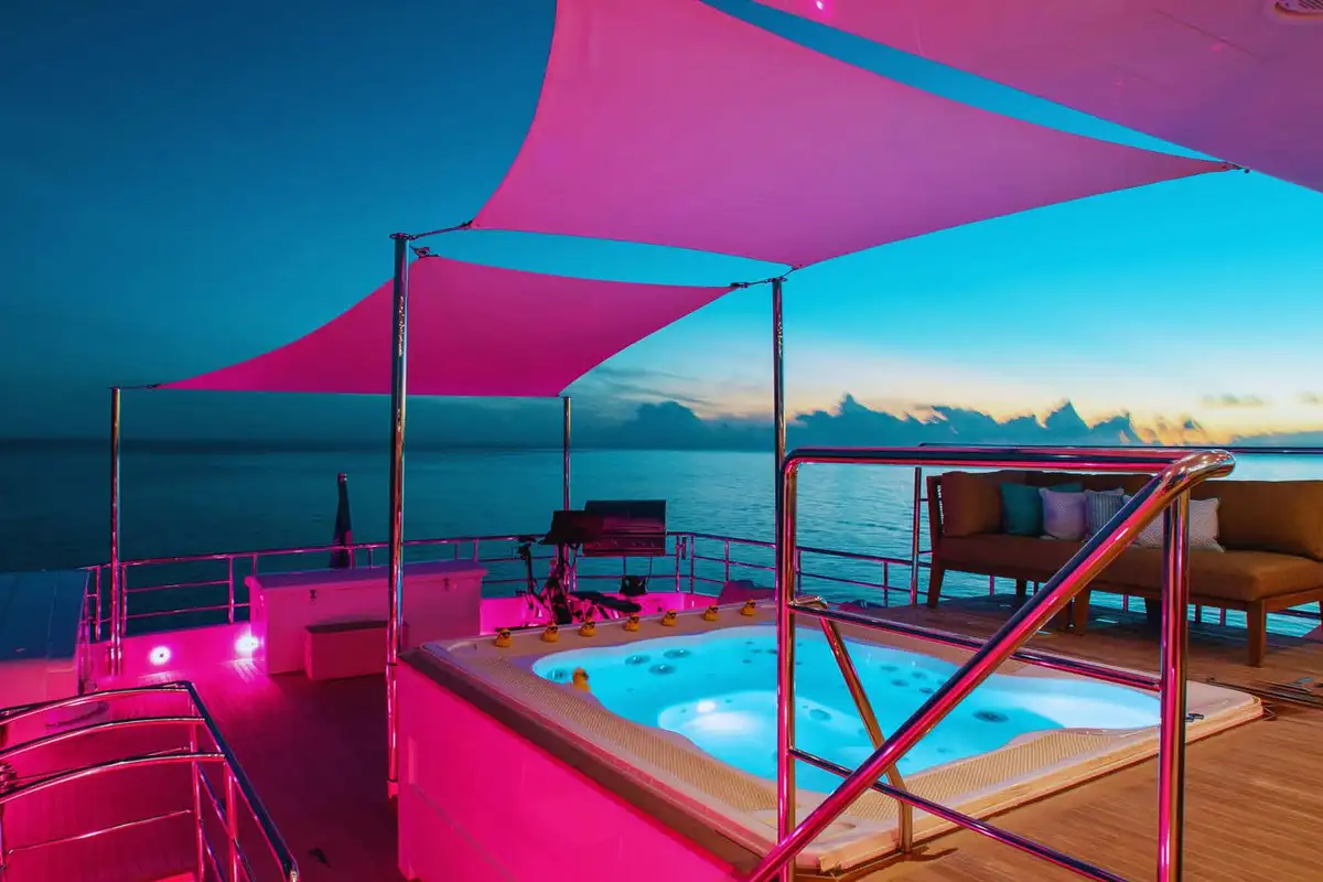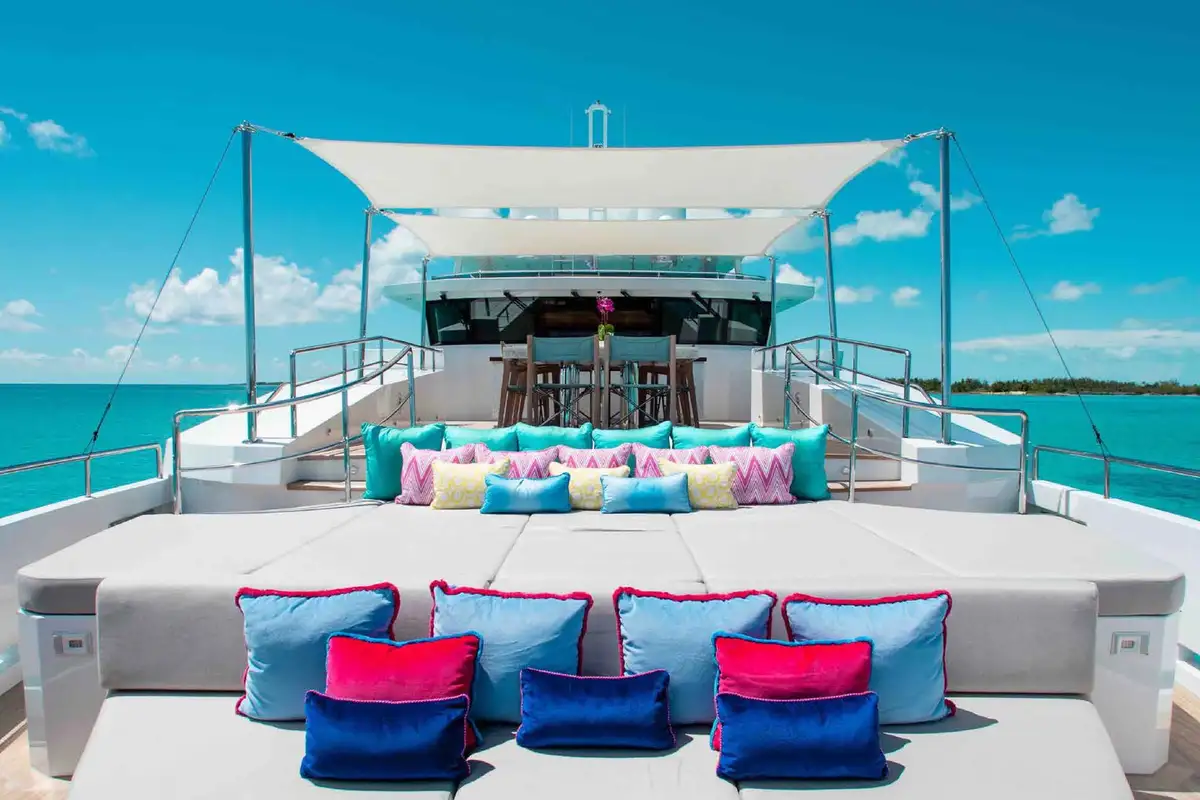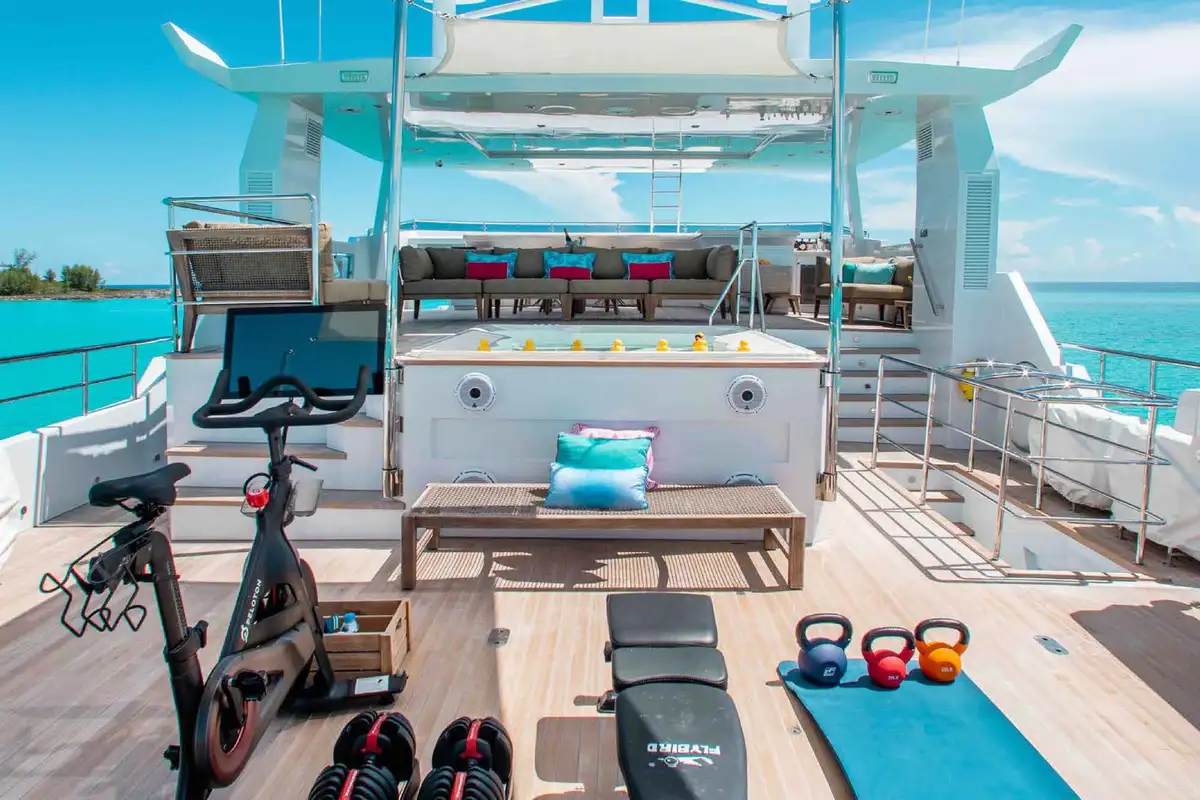 The aft part of the sun deck features a jacuzzi and ample space around with sun pads. The lounge at the amidships area can be accessed by the steps and offers either shade or sun and the side decks provide access to the forward alfresco dining table followed by a large sun pad and more relaxing seating areas.