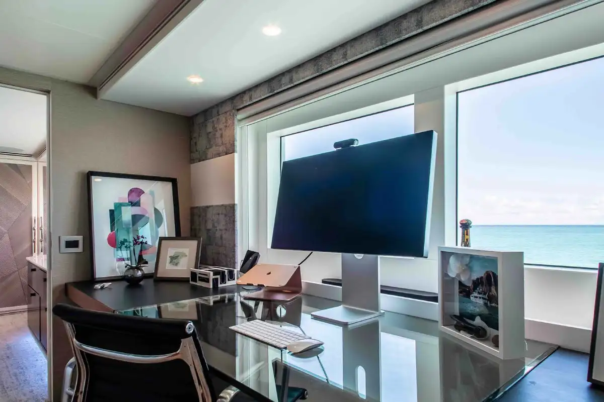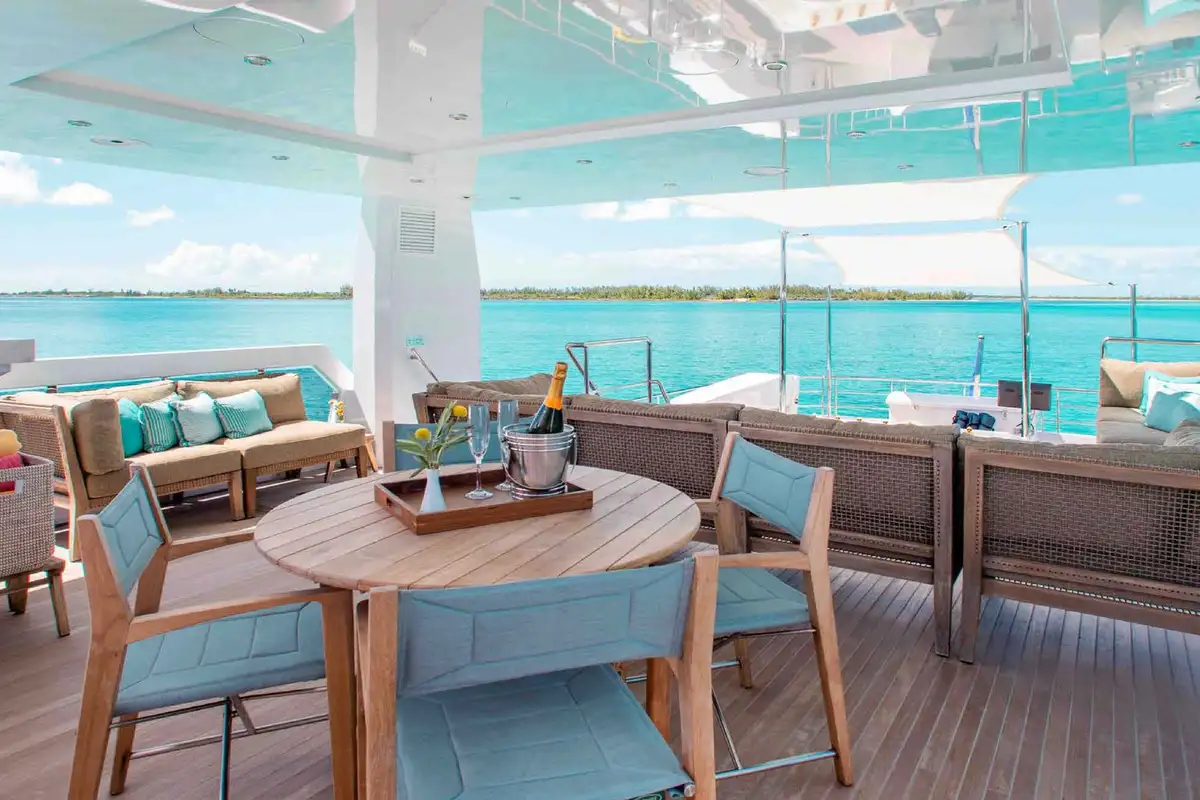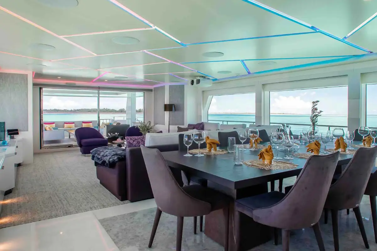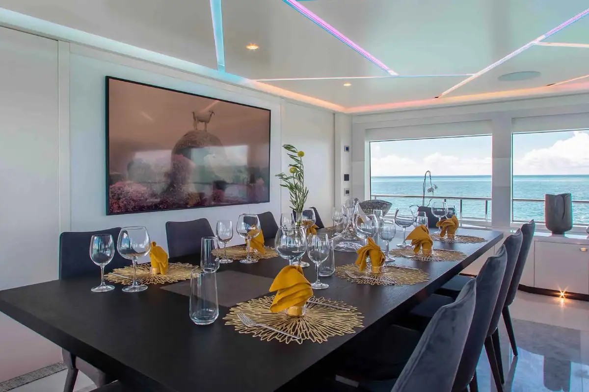 A open plan main lounge and formal dining area and a lounge on the main deck is perfect for socialising and entertainment. Large panoramic windows allow for optimum views. Aft of the lounge, a shaded deck provides seating, an alfresco dining option and 2 unique port and starboard fold out balconies.