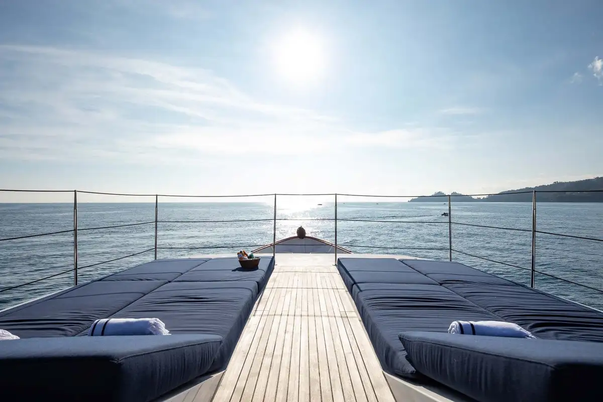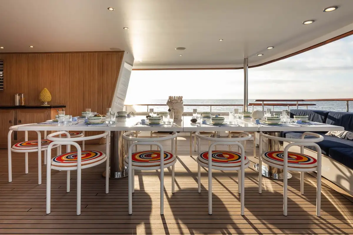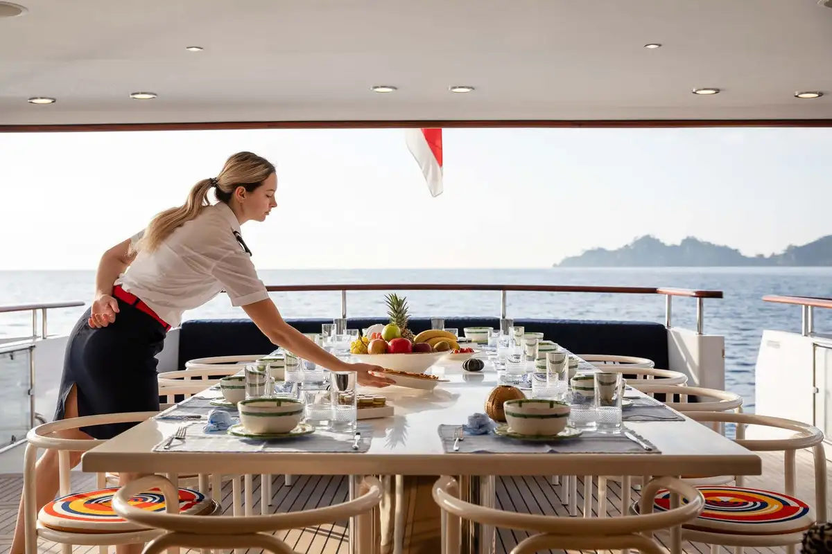 There are three dedicated dining areas on board. The uppermost, on the sun deck, is next to an al fresco kitchen and bar area, while on the main deck there is a shaded al fresco formal dining area on the aft deck and a formal dining area in the main deck saloon; giving you the choice to dine wherever you desire.
